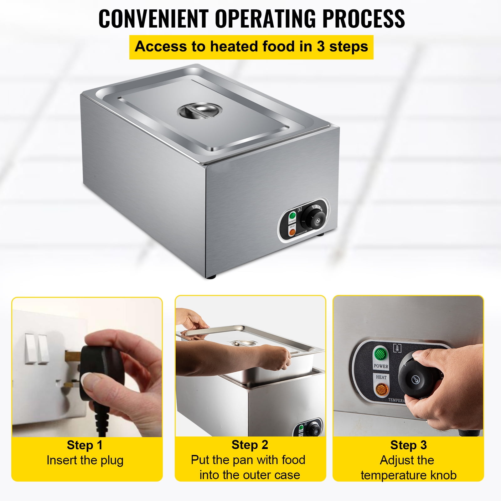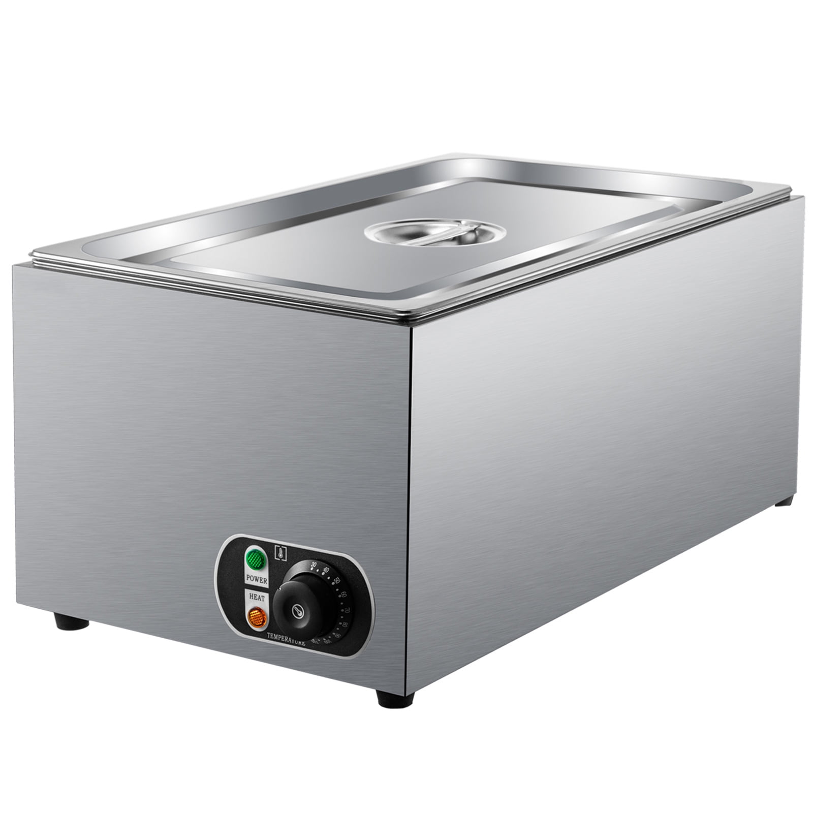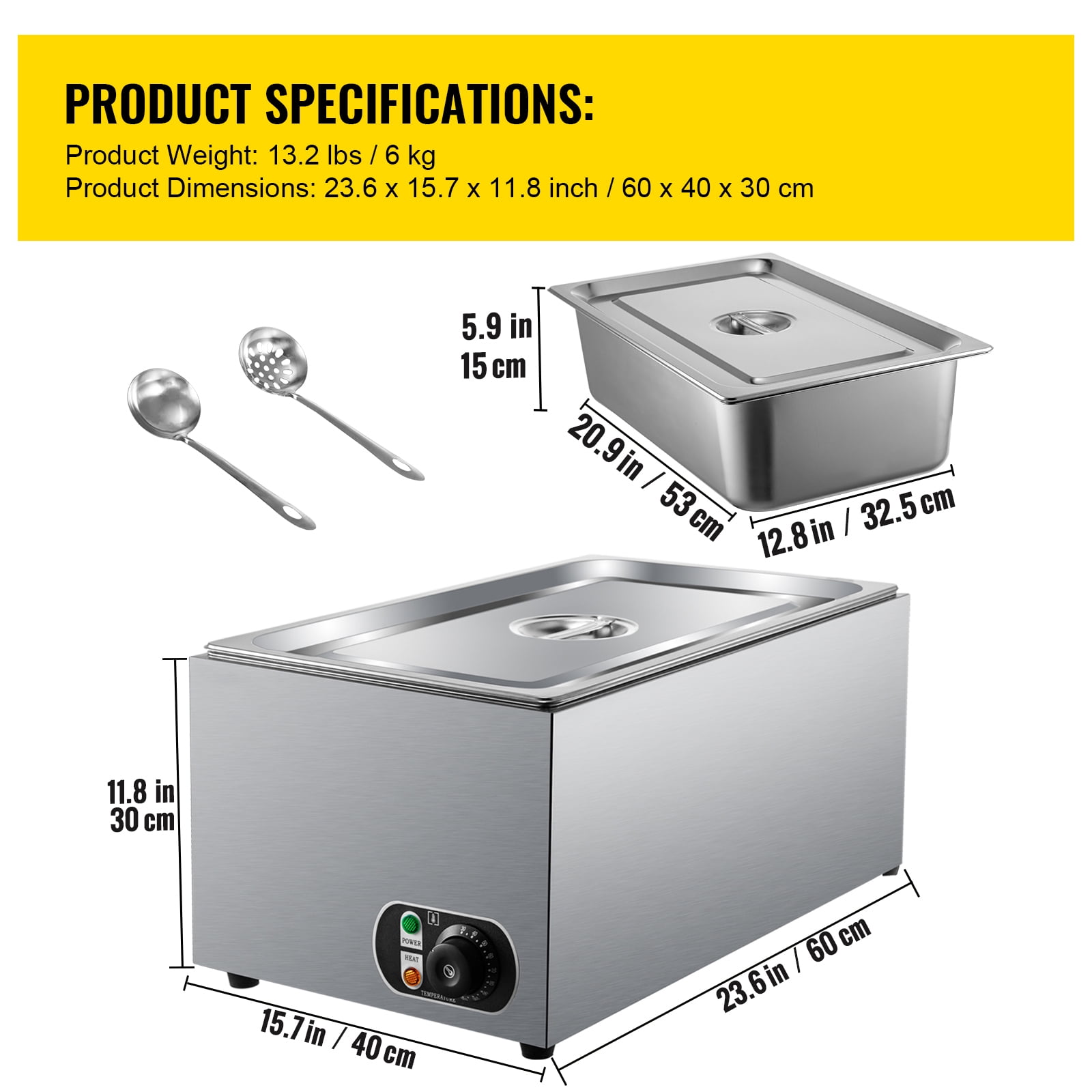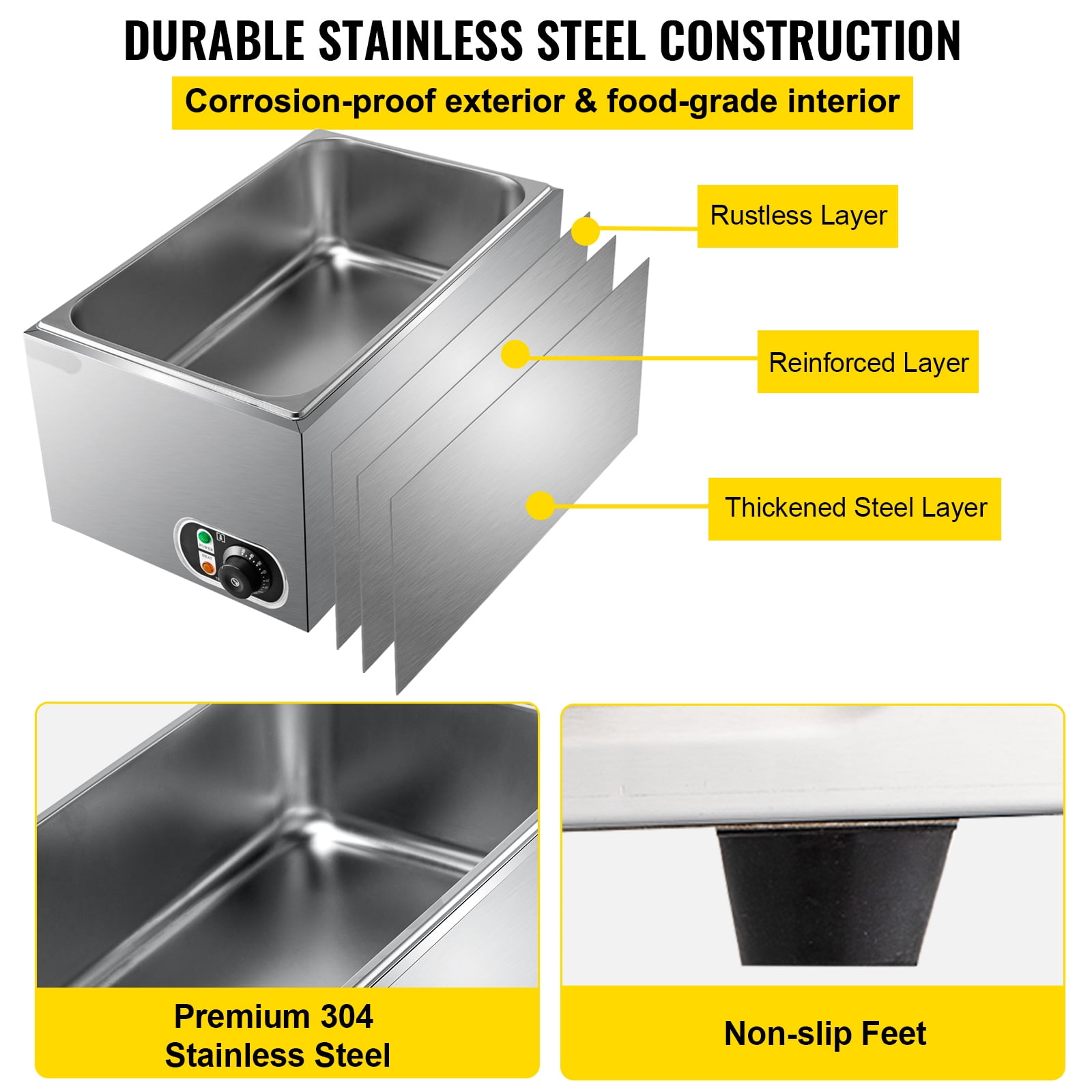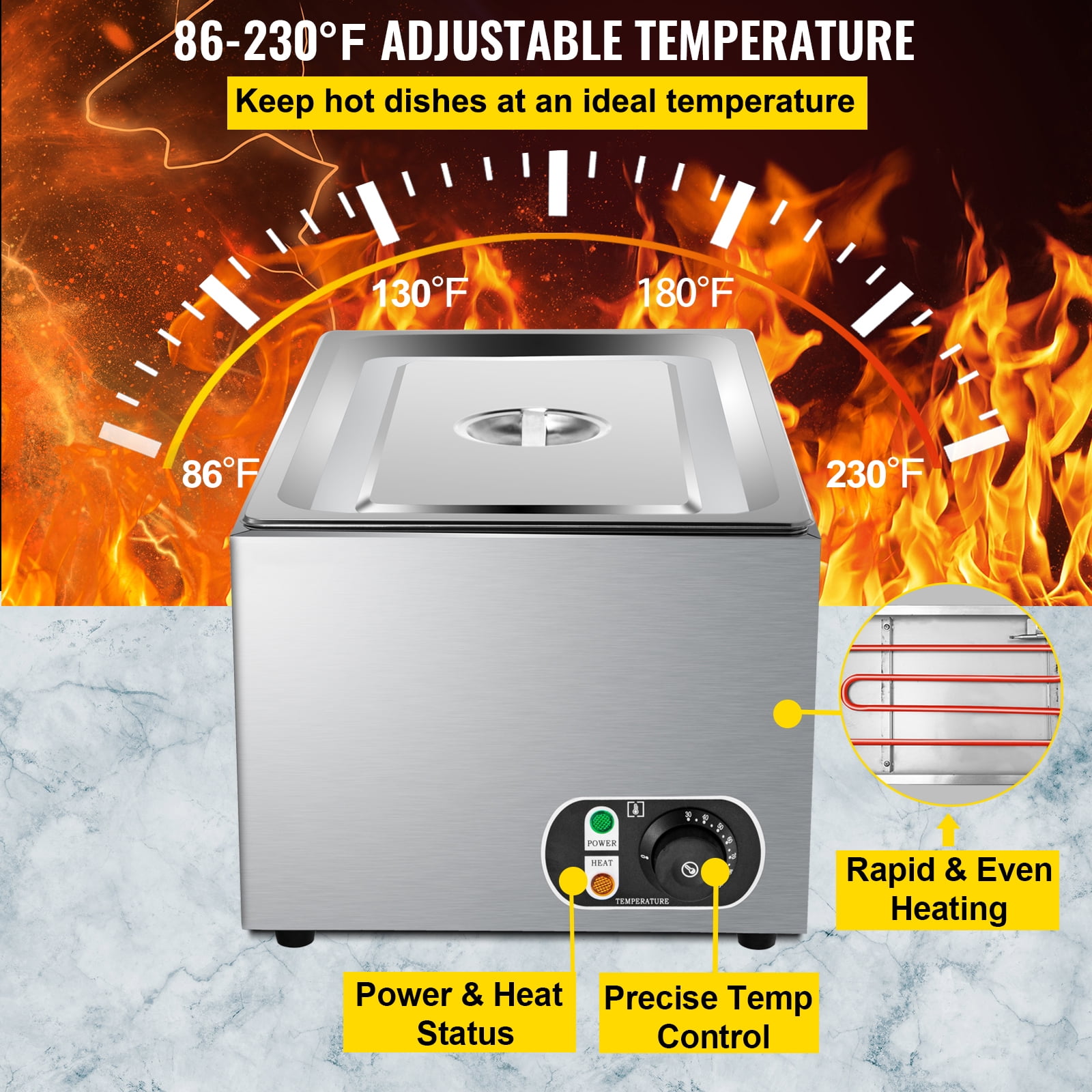 27 Qt Full Size Pan: Our commercial food warmer is equipped with a 27 qt large capacity pan, allowing you to heat and keep warm more food and saving you a lot of time and energy. The full-size pan dimension is 20.9 x 12.8 x 5.9 inches, meeting all your high-capacity usage requirements. Precise Temp Control: Our steam table warmer possesses an adjustable temperature knob in the temperature range of 86-230℉(30-110℃), ensuring the food taste. This 1200W commercial food warmer is equipped with a heating tube. This heating element adopts three-dimensional heating with high-temperature circulation and a larger heating area to achieve efficient heat transfer, significantly reducing your waiting time. High-Quality Material: The stainless steel external structure and the 304 food-graded stainless steel pan bring our food warmer with rust-proof and corrosion-proof. A 0.8 mm thickness pan ensures the sturdiness and durability of this food warmer. In addition, the detachable pan is easy for you to clean and operate. Considerate Details: The practical lid can return water to the food to retain its original flavor, keep dust from entering the food, and improve the heat insulation effect. Non-slip bottom feet can ensure the stability of this buffet food warmer, saving you from unexpected accidents. A complimentary soup ladle and perforated ladle are provided for you to hold the heated food effortlessly. Wide Application: Our countertop warmer is widely used in restaurants, breakfast shops, snack bars, school cafeterias, etc., satisfying your multiple needs for food heating and heat insulation.