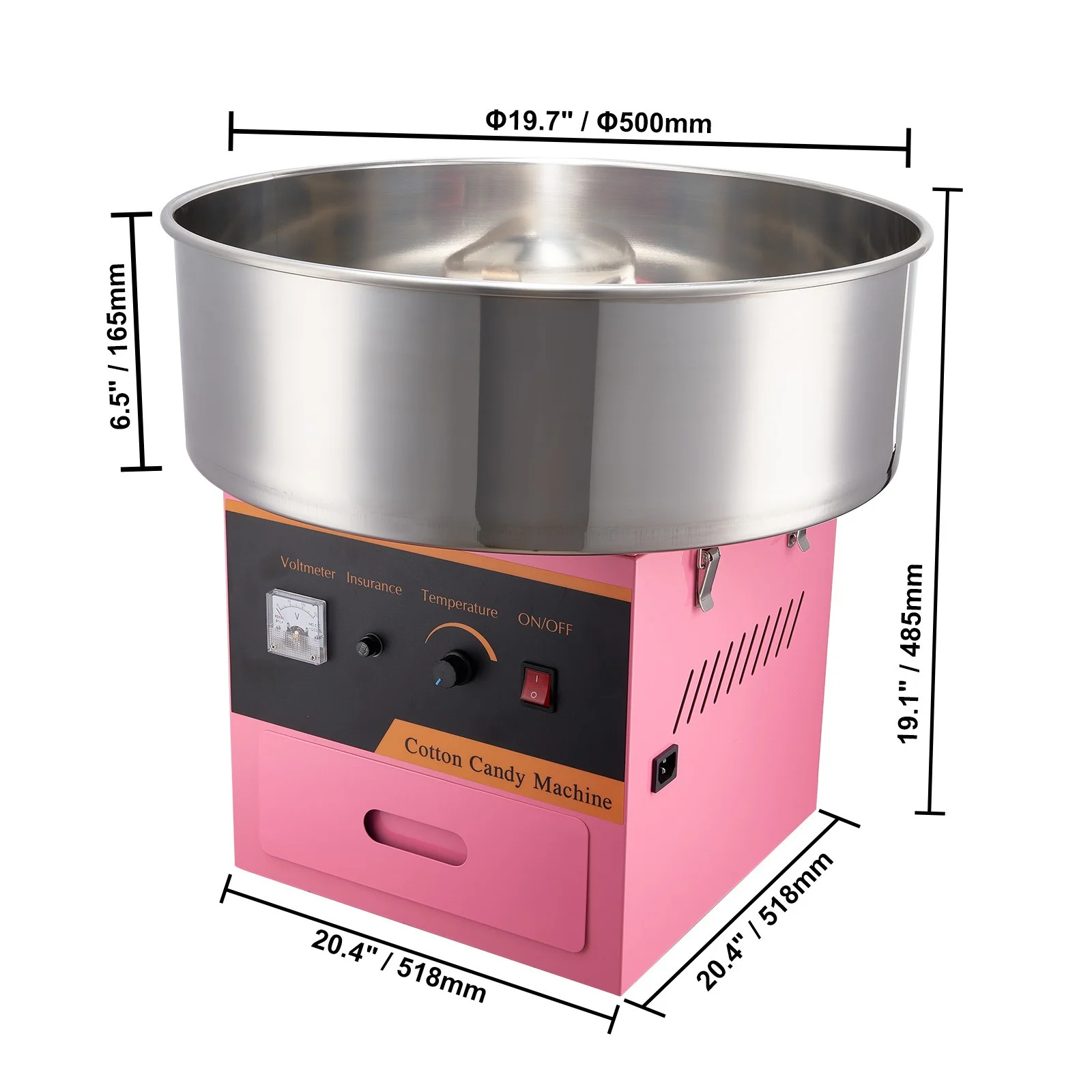 Product Description Electric Cotton Candy Machine This cotton candy maker is perfect for various parties and is suitable for most kinds of sugar. This cotton candy maker has a 1000W motor and larger candy bowl, providing about 6 cotton candies per minute. This candy floss maker can work continuously for one hour. It is perfect for various parties and is suitable for most kinds of sugar. High Cotton Candy Yield The powerful motor allows the commercial cotton candy machine to be quickly, yielding about 6 cotton candies in one minute. Simple to Control The control panel comes with a stepless voltage-regulating knob. The voltage is adjustable, and the voltage change can be viewed through the voltmeter. Various Taste This candy machine can produce colorful cotton candy with a variety of tastes. Premium Material The electric candy floss maker is assembled by a food-grade stainless steel, which is rust-proof and corrosion-proof. Easy-Operating Process Using this machine couldn’t be easier. 4 steps to make delicious and diverse cotton candy! Wide Application Perfect for festivals, carnivals, parties, sports events, even family and social gatherings. Specifications Color: Pink Rated Power: 1000W Cotton Candy Yield: 6 pcs/min Candy Bowl Capacity: 2 Ounces Temp Range: 149-473 °F / 65-245 °C Baffle Size: Φ19.7×6.5 inch / Φ500×165 mm Item Size: 20.4×20.4×19.1 inch / 518x518x485 mm Candy Drawer Material: SUS201 Food Grade Stainless Steel Weight: 22 lbs / 10 kg Package Content 1 x Cotton Candy Machine 1 x Sugar Scoop 1 x Carbon Brush 1 x Power Line 1 x Extra Fuse 1 x Instruction Manual
