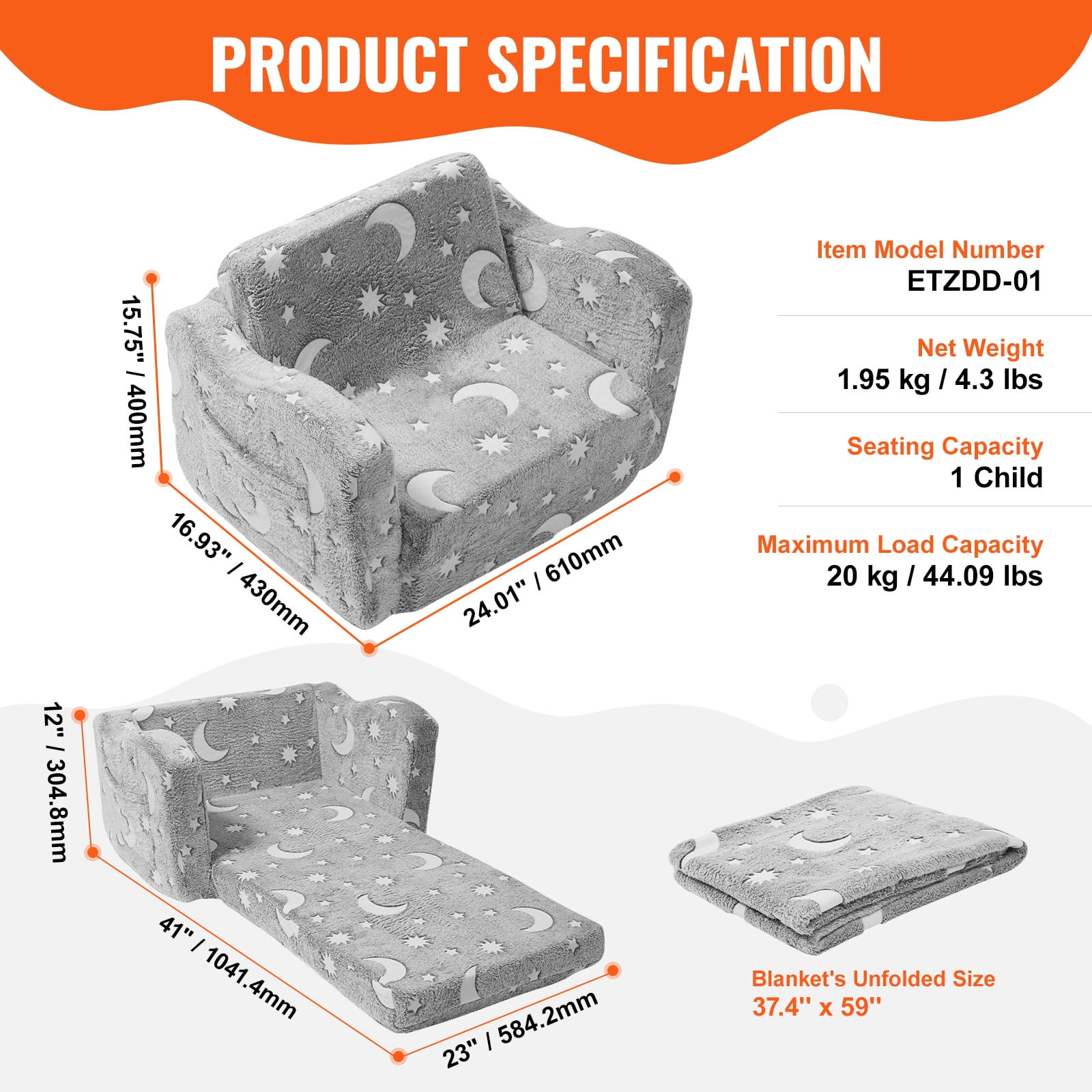 Product Description Provide Comfort With Our Fold-out Kids Sofa! This kids couch is of exceptional quality, crafted with high-density resilient sponge and premium sherpa fabric, providing a comfortable and skin-friendly experience for children. It also provides reliable back support for added peace of mind. All-in-one Kids Sofa Featuring a foldable design, this kids sofa offers various uses. When unfolded, it becomes a standalone reading chair or a resting seat for children. When folded, it transforms into a cozy nap chair or a playmat, serving multiple purposes. Glow-in-the-Dark Material Using the luminous fabric, this flip-out sofa chair sparks children’s curiosity and desire to explore. We’ve selected sherpa fabric for the upholstery, ensuring a soft and skin-friendly feel. The sofa is filled with high-density 25D sponge for quick resilient. Premium 25D Sponge To make the toddler sofa easy for kids to handle and provide stable support during assembly, we’ve chosen a 25D pure sponge as the filling material. This medium-density sponge is lightweight yet provides excellent support. Moreover, it boasts durability and is not easy to be damaged or deformed. Safety First Our foldable kids couch is suitable for children aged 18 months and above. For infants who can’t sit up independently, please avoid using it to prevent potential suffocation risks. Remember not to exceed its weight limit and do not jump from heights after assembly to prevent accidents or fractures. High-Quality Materials This high-quality kids couch is designed to provide children with a versatile furniture piece for relaxation and entertainment. It features soft and skin-friendly sherpa fabric and 25D high-density sponge filling for robust support. It complies with CPC standards and holds HCN certification to ensure safety. The removable fabric cover can be easily cleaned by machine or hand. Thoughtful Design The innovative features like glow-in-the-dark fabric enhances the fun of this toddler couch. Its foldable design makes it easy to store and conveniently move to the perfect space, providing a better spatial experience for your child. Specifications Item Model Number: ETZDD-01 Net Weight: 1.95 kg/4.3 lbs Maximum Load Capacity: 20 kg/44.09 lbs Seating Capacity: 1 Child Zipper: Child-friendly Zipper Materials: 25D Sponge +Fleece Fabric, Luminous Fabric Package Content 1 x Backrest 2 x Armrests 2 x Base 1 x Base Support 1 x Luminous Fabric Cover 1 x Luminous Blanket