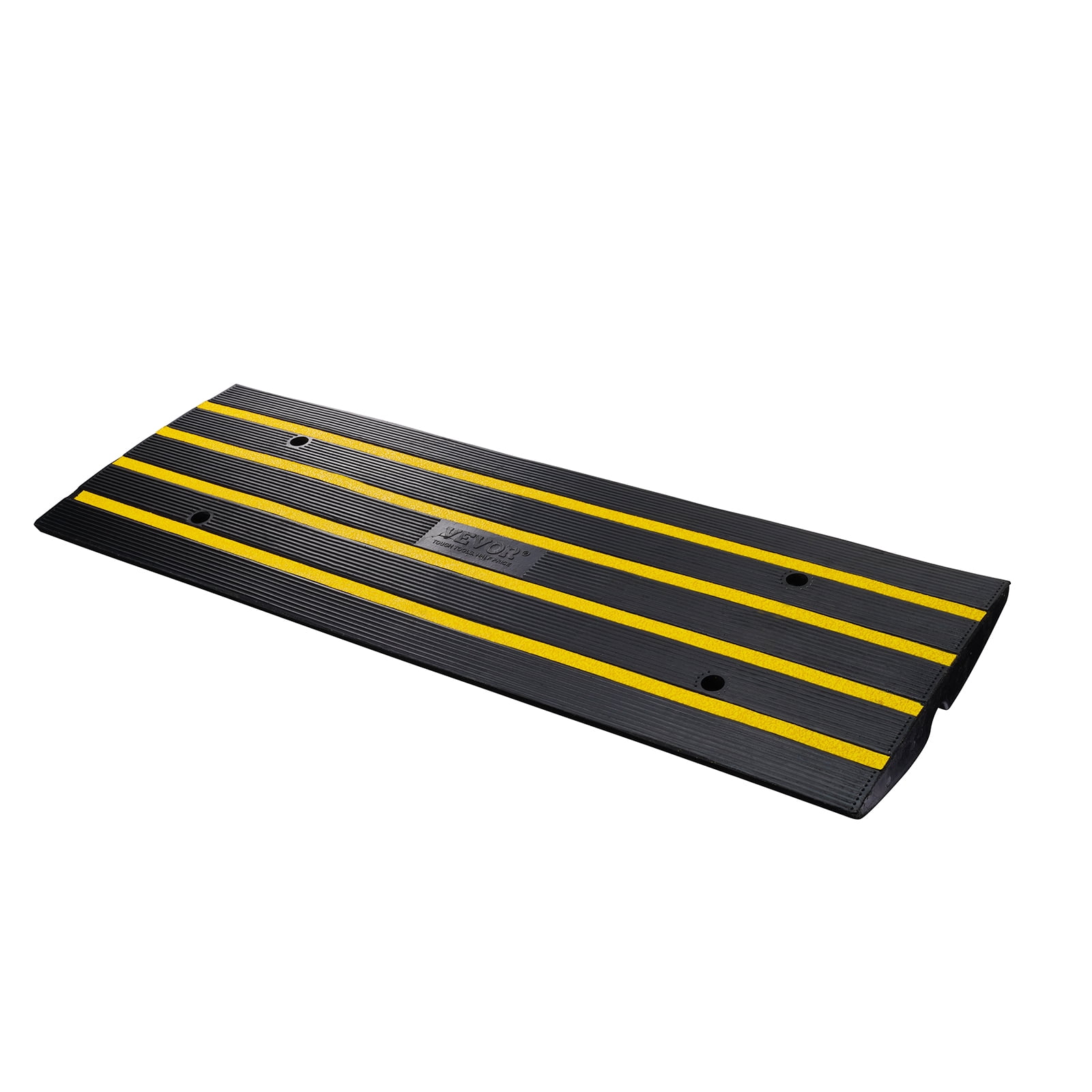 Rolled Curb Ramp with Channel: Size: 48.1″ L x 16″ W x 2.6″ H/122 x 40.5 x 6.5 cm. Designed to help your motor vehicles get over curbs or elevated sidewalks easily and without damage. Besides, the curb bridge can be permanently installed in high-traffic areas to create a secure driving environment for driveways, parking lots, and more. Channel size: 2.2″ W x 1.4″ H/5.5 x 3.5 cm. A channel on the bottom features cable protection and water drainage. Fit the most common types of rolled curbs. Max. 33069 lbs Capacity Rubber: The driveway curb bridge is constructed with rubber, recycled, wear-proof, and weather-proof for long-lasting usage under various outdoor conditions. Such industrial-level rubber construction can support up to 33069 lbs of loading. Suitable for standard vehicles like SUVs, vans, mobile wheelchairs, motorcycles, bikes, scooters, and hand trucks to pass through securely up or down uneven ground or curbside. User-friendly Detail for Security: Non-slip texture strips on the surface for your car to pass smoothly and stably; Bottom shock absorption can control traffic speed while no damage to the car or road; Traditional black+yellow color with a reflective coating provides a high degree of visibility, notice drivers and passer-by slow off even at night and at low light environments. Full Accessory for Installation: Time-saving and cost-saving to assemble the curb ramp by yourself. Having all needed pre-drilled holes and mounting screws as a temporary device for children’s play areas or permanently installed on gravel, asphalt, and concrete roads to keep away from being stolen or moving. Please measure your driveway curb ramp before you choose our driveway ramp. Indoor & Outdoor Scenario: The curbside bridge ramp is ideal for indoor and outdoor usage, Particularly suitable in public places like playgrounds, venues, sporting events, exhibition halls, homes, garages, driveways, loading docks, etc.