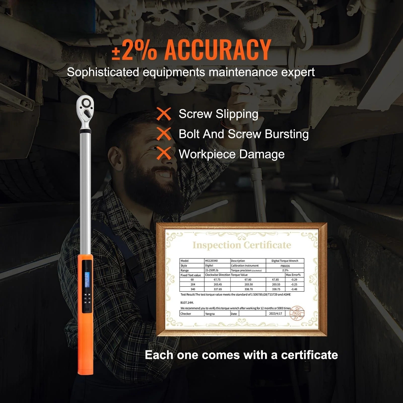 Uncompromising Accuracy: Our 1/2″ digital torque wrench boasts a torque range of 25-250ft.lb / 34-340n.m, providing exceptional accuracy of up to ±2%. Calibration certificates accompany each torque wrench set, ensuring that you can confidently and precisely tighten fasteners on your vehicle or equipment without incurring any damage. Clarity at a Glance: Our digital torque wrench kit is designed with a high-definition LED screen and built-in backlight, providing crystal-clear readability even in low-light conditions. With four unit options – Nm, in-lb, ft-lb, and kg-m – you have added convenience at your fingertips. High Compatibility: The adjustable torque wrench comes equipped with drive adapters and extension bars, making it an incredibly versatile tool that can be used for a wide range of applications. Compatible with both 1/4″ and 3/8″ bolt sizes, this digital torque wrench 1/2 drive is perfect for use in tight or deep spaces with limited access. Streamlined Efficiency: The reversible ratchet head allows for quick socket disassembly and installation with just one hand, improving work efficiency and saving you valuable time. With three working modes – real-time, peak, and preset memory – you can choose the mode that suits your needs for efficient and fast operations. Experience the convenience and efficiency of our torque wrench now! Constructed for Longevity: Constructed from robust chrome-vanadium steel, this heavy-duty torque wrench undergoes a rigorous six-stage heat-treated process and chrome-plated surface coating for optimal resistance to rust and corrosion. Additionally, the electronic torque wrench’s smooth surface facilitates easy cleaning. Uncompromising Accuracy: Our 1/2″ digital torque wrench boasts a torque range of 25-250ft.lb / 34-340n.m, providing exceptional accuracy of up to ±2%. Calibration certificates accompany each torque wrench set, ensuring that you can confidently and precisely tighten fasteners on your vehicle or equipment without incurring any damage. Constructed for Longevity: Constructed from robust chrome-vanadium steel, this heavy-duty torque wrench undergoes a rigorous six-stage heat-treated process and chrome-plated surface coating for optimal resistance to rust and corrosion. Additionally, the electronic torque wrench’s smooth surface facilitates easy cleaning. Clarity at a Glance: Our digital torque wrench kit is designed with a high-definition LED screen and built-in backlight, providing crystal-clear readability even in low-light conditions. With four unit options – Nm, in-lb, ft-lb, and kg-m – you have added convenience at your fingertips. High Compatibility: The adjustable torque wrench comes equipped with drive adapters and extension bars, making it an incredibly versatile tool that can be used for a wide range of applications. Compatible with both 1/4″ and 3/8″ bolt sizes, this digital torque wrench 1/2 drive is perfect for use in tight or deep spaces with limited access. Streamlined Efficiency: The reversible ratchet head allows for quick socket disassembly and installation with just one hand, improving work efficiency and saving you valuable time. With three working modes – real-time, peak, and preset memory – you can choose the mode that suits your needs for efficient and fast operations. Experience the convenience and efficiency of our torque wrench now!
