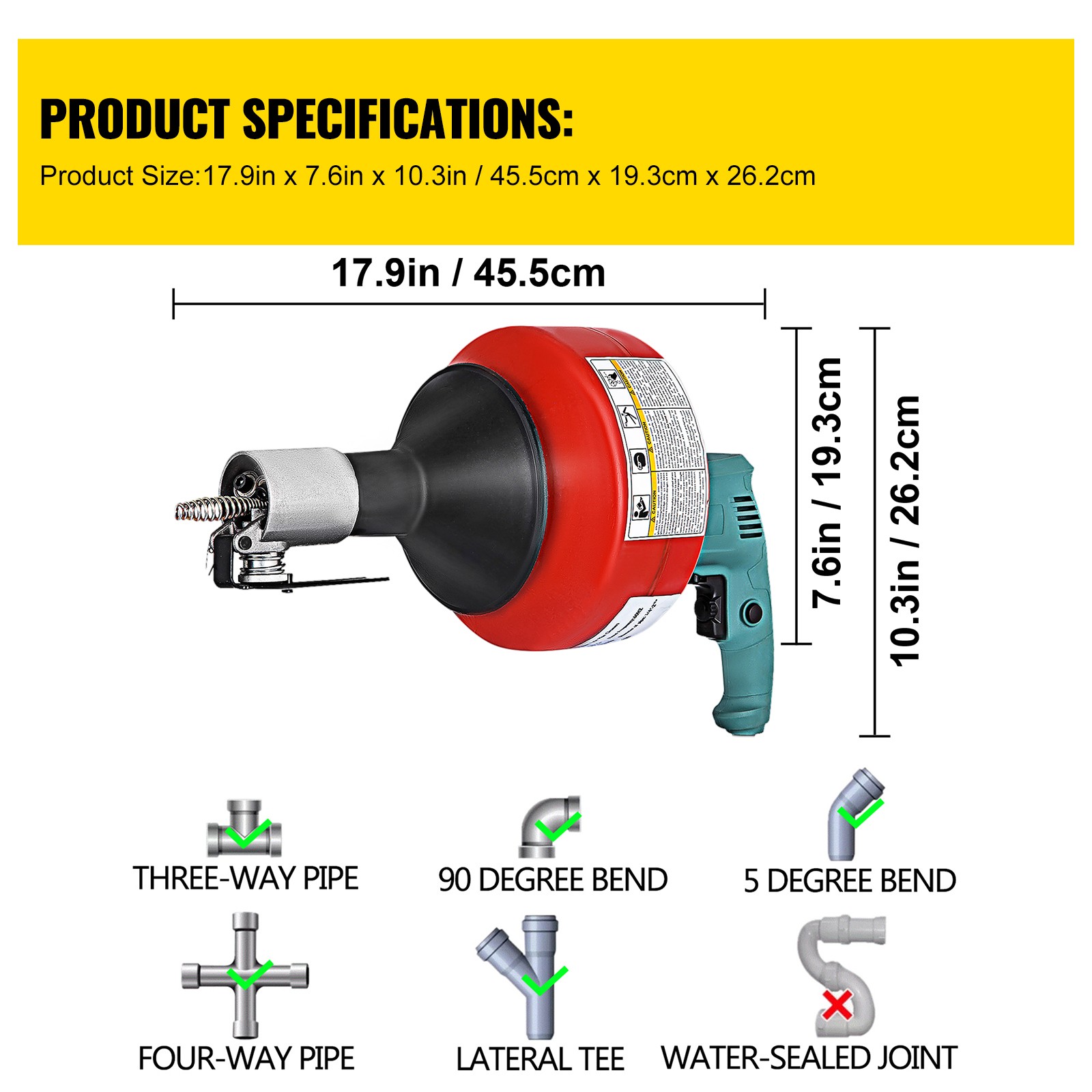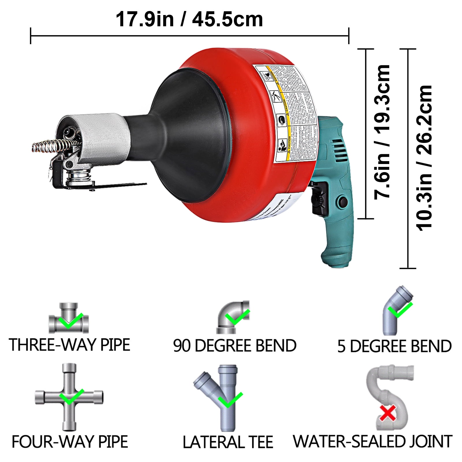 Product Description Portable Electric Drain Cleaner The drain cleaner is suitable for both professional and domestic use. The 700W machine is equipped with a powerful motor that turns the spiral clockwise and counter-clockwise at 800 RPM. The three-stage switch turns the spiral in the desired direction or stops the rotation. Robust Motor The powerful motor turns the spiral clockwise and counter-clockwise at 800rpm. Three-stage Design The three-stage switch is able to turn the spiral in the desired direction or stops the rotation. Compact & Portable The whole drain cleaning machine has a small size so that it is convenient for you to carry and use it. Spiral Adapter Spiral adapter is suitable for winding outlets and for small diameter pipes. Easy to Use The drill heads can be easily coupled together with the cleaning spiral by means of the T-slot coupling. Various Application The drain cleaner is suitable for both professional and domestic use. Perfect to use at sinks, tubs, toilets, kitchen, etc. Specifications Rated voltage: 110V/60Hz Flexible shaft: 8 mm / 1/3 inch Flexible speed: 5 m/min Power: 700W Cleaning pipe dia.: 20-65 mm / 0.8-2.6 inch Cleaning length: 26ft / 8m Rotate speed: 800 rpm Package Content 1 x Drain Cleaner Machine