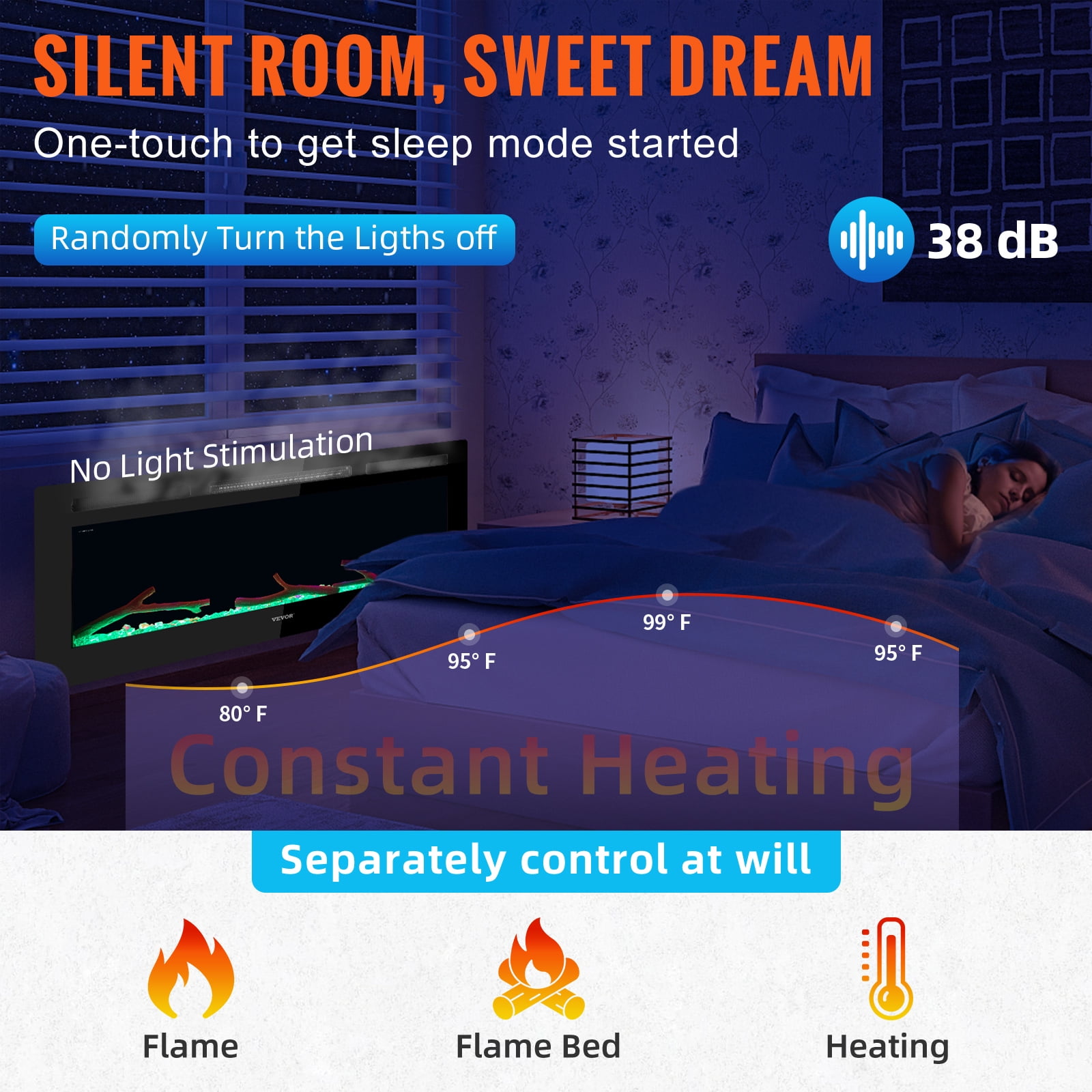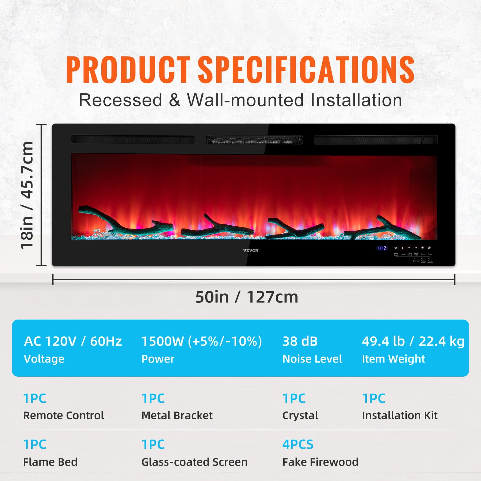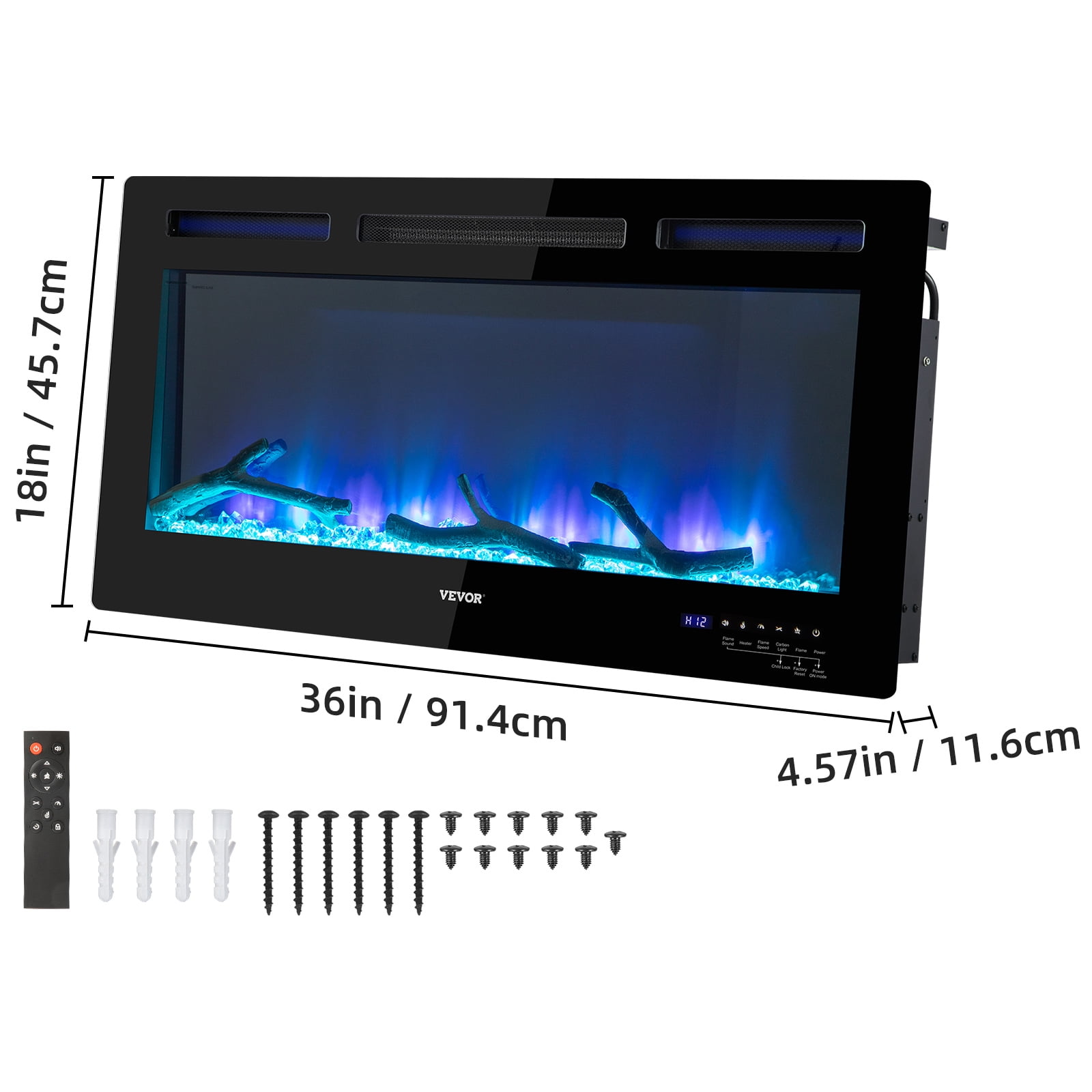 Realistic & Attractive Flame: Product Size: 36 x 4.57 x 18 in (91.4 x 11.6 x 45.7 cm). Power: 1500 W. Thanks to its constructed glass-coated screen, the electric fireplace will bring you realistic visual of flames. Also, a large-scale screen perfectly magnifies the swinging “burning” flame. Multiple combinations of 12 flame colors, 5 flame speeds, and 5 brightness are provided to set the mood. It comes with crystal and artificial firewood to add a more cozy and vivid ambiance. Multi-Operation Modes:To ensure a good user experience, you can start our electric fireplace in 3 ways. The remote and touch screens make it more convenient to control every function of our electric fireplace. Additionally, the smartphone control makes it easy to switch the flame color and set the heating temperature anytime, anywhere. The special recovery mode saves the hassle of repeated settings after you power it off. Warm in Silent: This 36-inch fireplace is equipped with a sleep mode which maintains a constant heating temperature between 60 to 99 °F and features an adjustable timer that can be set from 0 to 12 Hours. The independent switch can adjust the heating and flame, ensuring warmth while remaining energy-saving. Features low noise at 38 dB. You can turn it all up during freezing winter nights and stay snug and warm. Wall-mounted & Recessed: Perfectly fit for 2 x 4 and 2 x 6 studs on the wall. Our wall fireplace doesn’t just have to be recessed in the wall. It can also be wall mounted. It also supports hard-wired installation. Assembling and fixing it on the wall only cost you a few minutes. Get ready to enjoy a wonderful visual feast. Note: We recommend some space is left between the top of the fireplace and your TV, mantel, and picture ceiling. Let Your Home Come to Life: The thickness of the upgraded electric fireplace is reduced to 0.03-inch and can match various decoration styles, ensuring years of use. CSA certificate approved. Suitable for living rooms, bedrooms, kitchens, corridors, etc. Let VEVOR’s electric fireplace accompany you the whole winter.