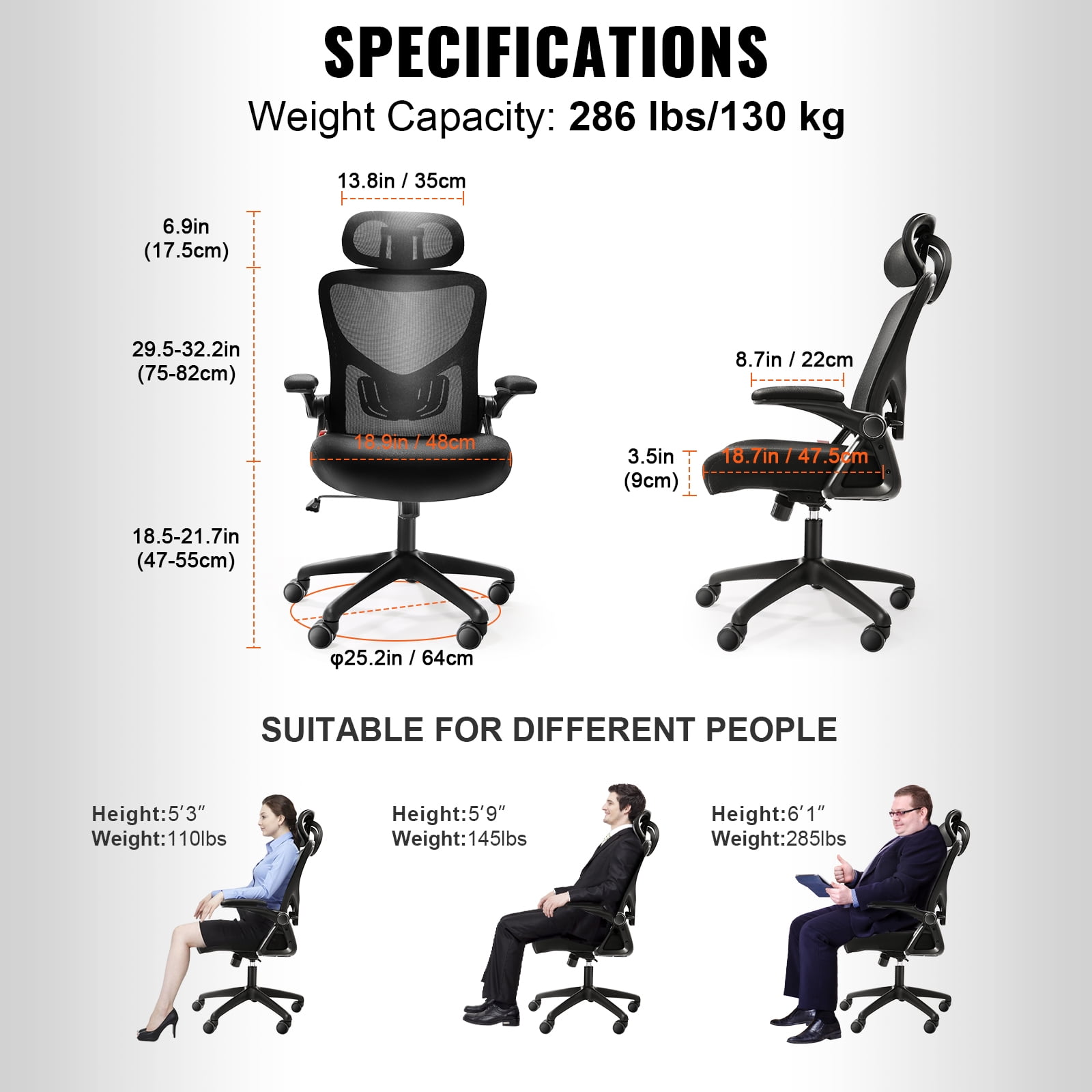 VEVOR Ergonomic Office Chair 286 lbs Rolling Mesh Chair Back Lumbar Support and Head Support Comfort Computer Chair with Flip-up Arms and Adjustable Height Home Office Task Chair SGS Certified