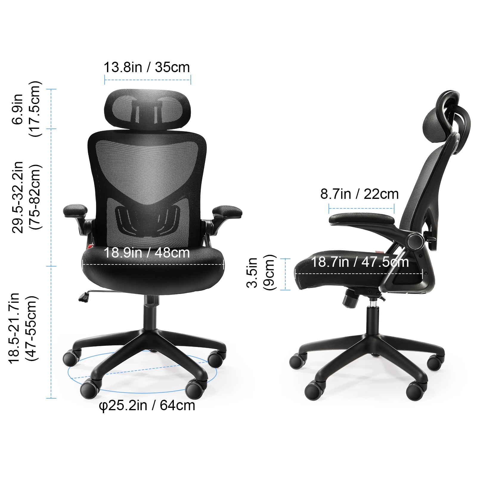 Adjustable Ergonomic Lumbar Support: The S-shape ergonomic chair design keeps the spine properly aligned and supported. The lumbar support is 2.8″ adjustable to fit your body size, providing optimal support for the lower back, shoulders, and neck, while the adjustable headrest prevents the head from tipping forward, reducing pain. Thickened Seat Cushion: The ergonomic office chair seat is compressed with a high-density sponge and covered with a breathable mesh fabric. With a 3.5-inch (9 cm) thickness, it’s 17% thicker than others, ensuring an incredibly comfortable sitting experience. Plus, The unique mesh design is skin-friendly and breathable, which keeps you cool all day. Multi-Functional Design: The 90-128 degree rocking design of this office chair perfectly caters to your diverse sitting needs—whether it’s for work, relaxation, or taking a break. Its height-adjustable feature caters to the sitting needs of people of varying heights. You can find the perfect position to ensure a pain-free day for long hours of sitting. Easy Folding & Movement: Folding the armrests up 45°, you can push the desk chair directly under the desk to save valuable space. BENTISM office desk chair comes with smooth PU casters, enabling you to effortlessly reach different areas without damaging your tile, wooden floors, carpets, and other flooring. Multi-functional Use: Whether you have a regular desk, standing desk, or adjustable height desk, BENTISM mesh office chair can easily complement these workstations. It is a breeze to assemble with all hardware and tools included. Simply follow the chair instructions, and you can have it ready in just 30 minutes to enjoy.