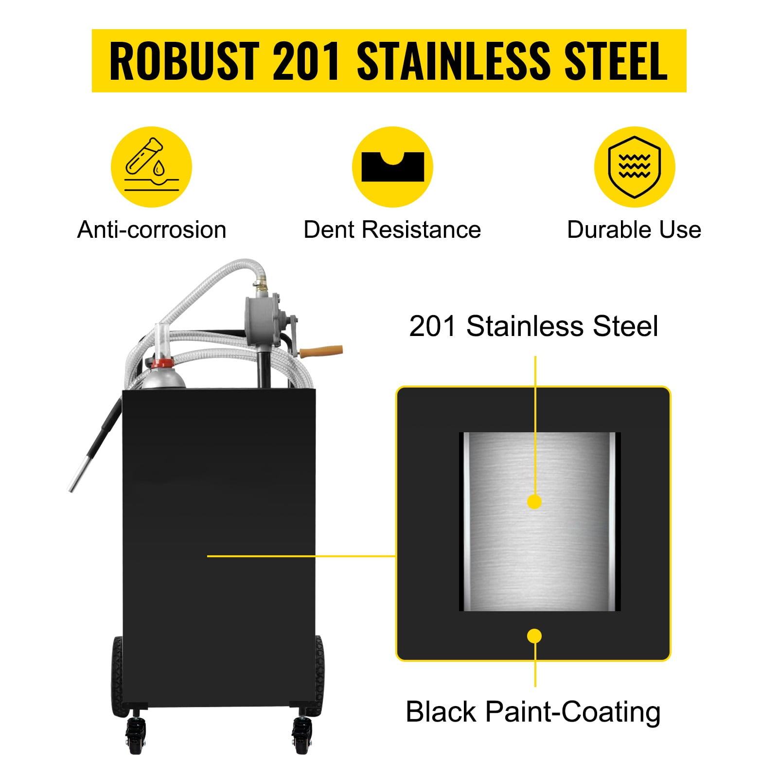 Product Description 35 Gallon Fuel Caddy Rotary Manuel Pump & Move It Around & Sturdy Construction Specifications Model: 35 Gallon Fuel Caddy Tank Size: 41.7 x 20.9 x 20.9 in/ 106 x 53 x 53 cm Fuel Type: Gasoline, Diesel, Kerosene Pump Type: Two Way Rotary Pump Hose Length: 9.8 ft/ 3 m Material: 201 Stainless Steel Big Tire Diameter: 8 in/ 20.3 cm Small Tire Diameter: 2 in/ 5.1 cm Product Color: Black Package Content 1 x Fuel Caddy