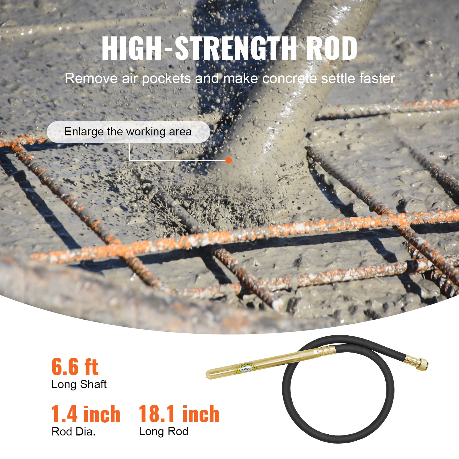 High Frequent Vibration: With a 800W copper motor generating 13000 vibrations per minute, our concrete vibrator effectively removes air from the concrete. This process ensures uniform compaction, reducing the risk of cracks, enhancing the structure’s load-bearing capacity, and extending its overall lifespan. Enhanced Vibrational Transfer: Vibrating Head Length: 1.81 inch. Head Diameter: 1.4 inch. With its quiet and long 6.6 ft shaft, along with a 13 ft power cord, the concrete vibrating tool can be easily used on various construction sites, even if you are far from a power outlet. One-Key Control: Thanks to the locking button, the electric concrete vibrator can be operated without the need to keep pressing the trigger, allowing you to work for longer durations comfortably, leading to increased productivity and reduced strain on the body. Effortless Operation: Our handheld concrete vibrating tool is designed to be lightweight and easily transportable. The threaded interface simplifies the attachment process, allowing for quick and effortless connection of the vibrating head or shaft to the concrete vibrator. With its secure and reliable threaded design, all you need to do is tighten it, and you’re ready to go! Efficient Concrete Compaction: If you’re working on concrete structures like foundations, columns, or walls, using a handheld concrete vibrator can help you achieve a high-quality finish. This tool provides consistent and effective consolidation, making it useful in tasks such as bridge or highway guardrail construction, as well as building construction.