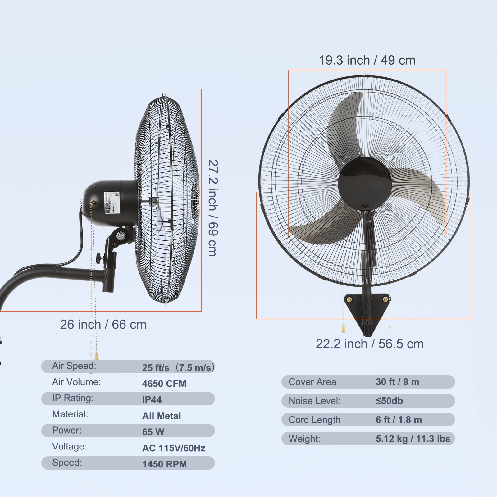Move Lots of Air: Upgrade high-strength metal pull-string is convenient for you to control 3 speeds. Performance is rated at a maximum of 4650 CFM with a reach of around 30 ft. Escape your air-conditioned cave and enjoy the outdoors, even in peak heat. Power in Silence: ETL listed. 1450 RPM, 70 W fully sealed motor with all metal casing contributes to a farther air movement range at lower noise. Our wall mounted fan comes with 6 ft power cord for your maximum convenience. Keep flies away during relaxing summer days! Oscillating & Tilt Function: 19.3” industrial wall fan features an independent motor and provides an 90-degree oscillating function that allows the fan to cover a wide area. It also can be tilted vertically for optimum airflow. Wall Mount Fan: Rugged metal construction and aluminum blades for easy disassembly and cleaning. As they mount on any solid wall, you can save a lot of space and distribute better the air by mounting them as height as you need. Live It Up This Summer: Too good for patios, garages and feed pens! Not only will you enjoy cooling relief from the heat, but your pets and plants will benefit from a cooler outdoor environment. Who knows, your orchid plant might bloom again.