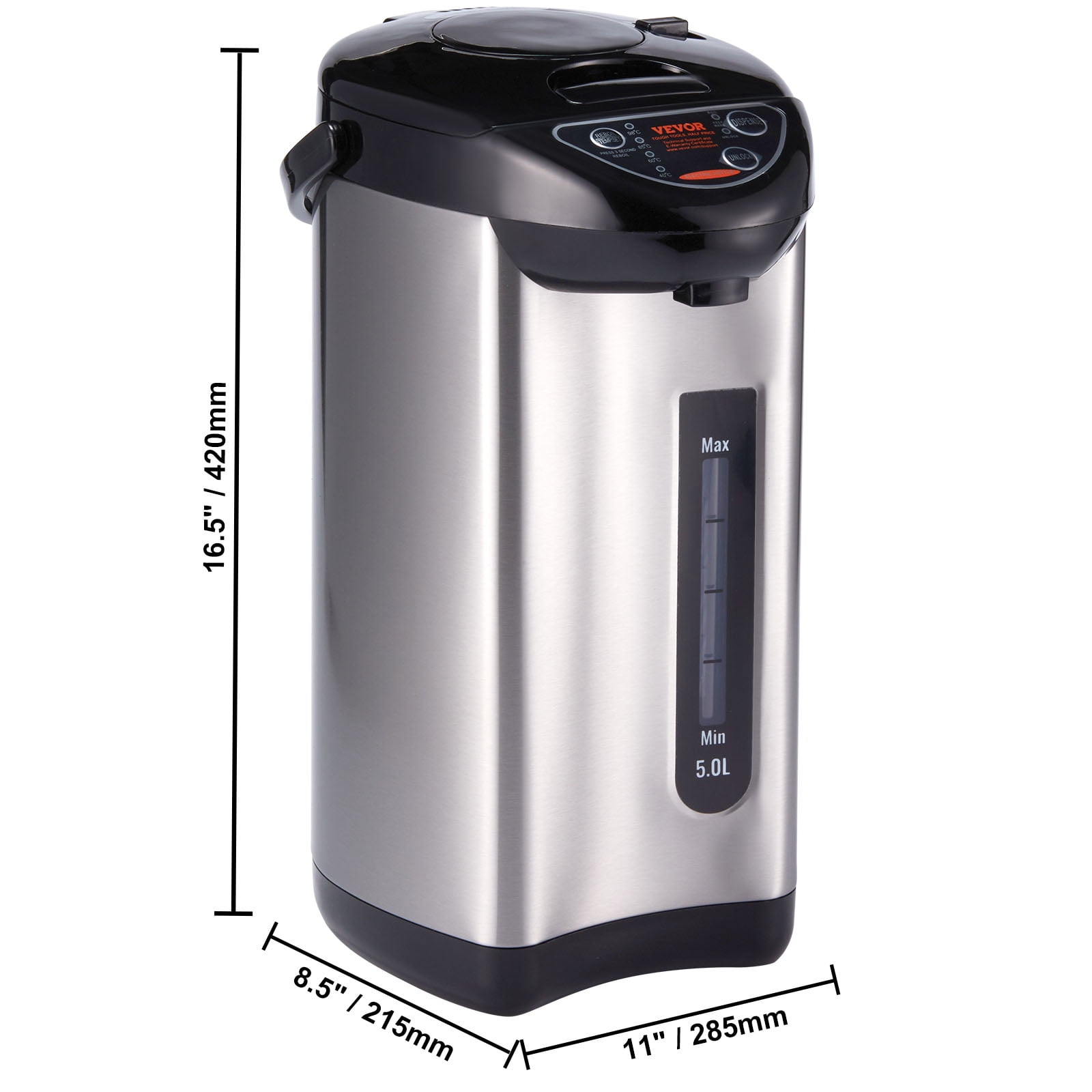 Product Description Hot Water Dispenser Experience the convenience of our hot water dispenser. 3-way to dispense: auto-dispensing, cup switch, or manual dispensing. It rapidly boils water for daily hydration, with a generous 5L capacity for up to 16+ cups. Achieve 4 precise temperature control, perfect for brewing various beverages. With a portable handle, enjoy hot water wherever you desire – it’s a versatile addition to any room. Effortless Convenience Our 680W instant hot water dispenser can swiftly heat water for your needs. Its generous 5L capacity ensures you’ll have enough for 16+ cups (300ml each). Making it the perfect solution for your daily hydration. Easy to Use The hot water dispenser features sensitive touch keys. And the visual water window will light up as you pour, providing real-time water level updates. 3-way to dispense, and the manual dispensing design is great for using the hot water dispenser at Sabbath. Premium Quality, Inside and Out Crafted from food-grade materials, our hot water dispenser countertop boasts a 304 stainless steel inner liner, spout, and inner cover. This feature ensures rust resistance, high temperature, and corrosion resistance. The lid easily detaches with a press for effortless cleaning. Safety First Our water heater and dispenser is designed with your safety in mind. It includes a dry-burn prevention feature that automatically cuts off power when the water level is too low. Additionally, a child lock function adds an extra layer of protection, making it safe for kids. Widely Used With a convenient carrying handle, take your water boiler and warmer wherever you need – the dining room, living room, kitchen, tea room, bedroom, and beyond. It’s the perfect addition to any space, ready to serve you hot water immediately. Precision Temperature Control Elevate your beverage experience with 4 temperature settings: 208.4°F, 185°F, 140°F, and 104°F (98°/85°/60°/40°). You can preset your desired temperature to brew beverages like honey water, lemonade, tea, or milk. Specifications Item Model Number: EKA-5.0ED Voltage: AC120V 60Hz Power: 680W Capacity: 5.0L / 1.32Gal Temperature Setting: 208.4℉/185℉/ 140℉/104℉ (98°/85°/60°/40°) Material: PP & Stainless Steel Liner Material: 304 Stainless Steel Net Weight: 2.8 kg / 6.2 lbs Product Size: 11 x 8.5 x 16.5 in /285 x 215 x 420 mm Package Content 1 x Instant Hot Water Dispenser