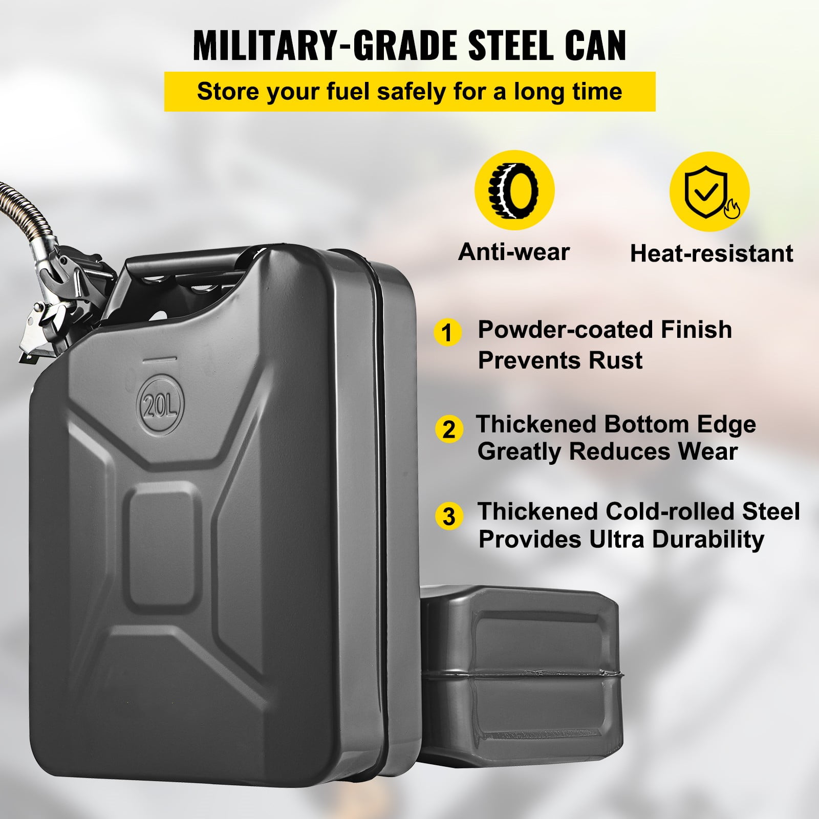 Product Description VEVOR Jerry Fuel Can Our first-rate steel jerry cans are more durable and safer when compared to plastic fuel cans. The 5.3-gallon tank is large enough for storing sufficient fuel as a reserve, and the spout system allows for fast refueling. Stop worrying about running out of fuel while traveling to distant places. Stop thinking about where you can’t go, since you are now prepared for everything. 5.3 Gal Jerry Can With a 5.3 gal / 20L large capacity, our jerry can is capable of storing sufficient reserve fuel for you to reach your final destination. Put the oil tank in your vehicle, and stop worrying about your fuel gauge while on long road trips. Superb-quality Steel Can Plastic fuel tanks are fragile and can be easily pierced or broken accidentally, thus leaving the oil out in the open. So we abandoned cheap plastic and adopted heavy-duty rustproof steel for the main structure to ensure much safer & longer use. Airtight Sealing Lock The oil mouth of our jerry can is sealed tightly by a unique cap that prevents air from escaping; further secured by a locking pin that prevents unwanted opening. When you are in need, just manually remove the pin, and open the cap easily. Improved Flexible Spout We provide an additional spout that allows gasoline to be poured smoothly inside the tank and prevents spilling. Use our jerry can to refuel your vehicle quickly and continue your unforgettable trip. Easy Carrying & Storage The size of the fuel can is 13.6″ x 6.7″ x 18.5″ (L x W x H), and this flat cuboid shape won’t take much space. The three handles make it effortless to carry and allow two people to lift for refueling. Wide Application Given its top-quality material and large capacity, this steel fuel tank can be used to store gasoline, diesel oil, water, and many other kinds of liquid. It is a perfect reserve fuel can for you to put in your vehicle and fill up anytime, anywhere. Specifications Model: 1X20LBLACK Style: Military Material: 0.8 mm Cold-rolled Steel Capacity: 5.3 US Gallons / 20 L Color: Black Quantity: 1 Weight: 9.83 lbs / 4.46 kg Spout Length: 11.8 in / 300 mm Spout Diameter: 0.79 in / 20 mm Package Content 1 x 20L Black Jerry Can 1 x Flexible Spout