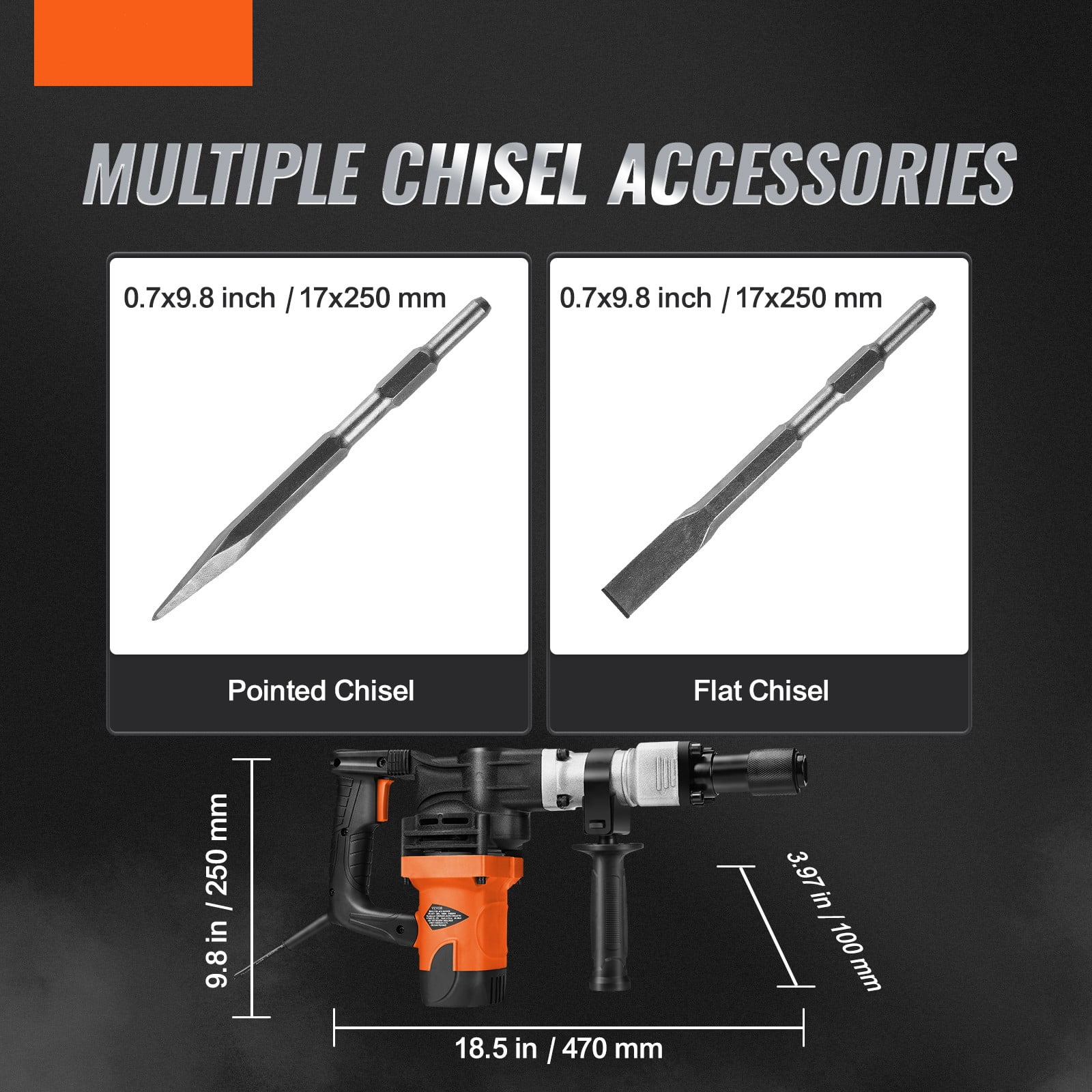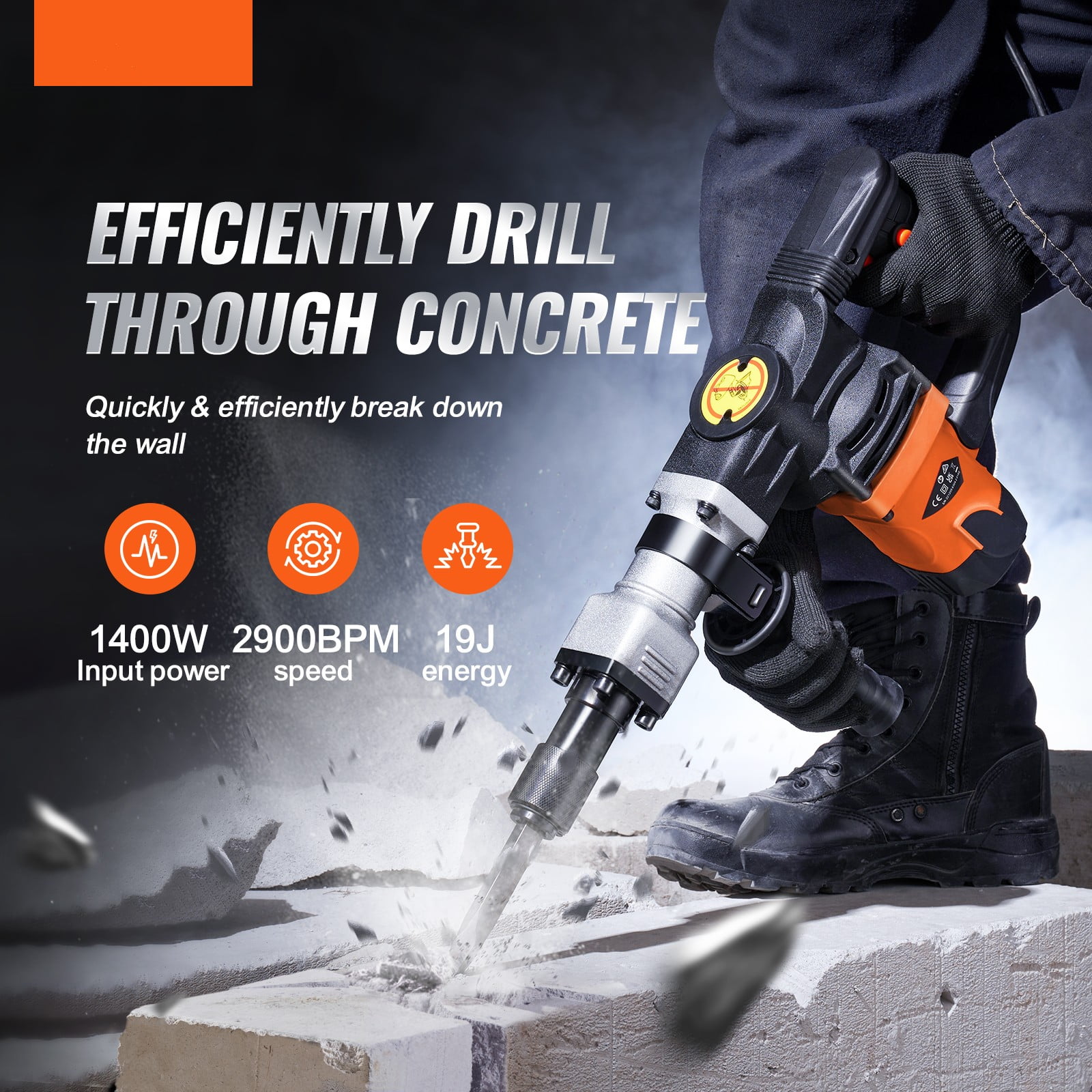 Product Description Electric Jack Hammer Whether you are a professional worker or a DIY user, this jack hammer is your wise choice. This 1400W electric chisel hammer adopts high strength aluminum alloy chuck. An adjustable 360° grip provides extra control and comfort during extended use. It is suitable for various scenes such as concrete crushing, wall slotting and floor wiring, and road chiseling, etc. It is an excellent tool for daily family interior decoration and small projects. This electric chisel hammer is lightweight and has a robust 1400W motor. It delivers powerful impact energy to complete demolition, chiseling, excavation, grooving, and cutting projects. The increased spring can reduce the vibration caused by the demolition. You can finish the job without breaking a sweat. The big trigger button provides a more comfortable grip. You can realize continuously work with these convenient designs. It can release your hands and reduce the pressure of holding and controlling the chipping hammer. Capable of breaking concrete or rock floor slabs and for home decoration and minor projects. Jack hammer shovel provides 2900 shocks per minute and breaks down the wall efficiently. Capable of removing porcelain drill. A big trigger and rotary handle make the slotting more flexible. Specifications Model:JH-0840 Noise: ≤103dB Input Power: 1400W Rated Impact Frequency: 2900BPM Single Impact Energy: 19J Chuck Type: 5/8″ Hex Shank Net Weight: 17.8 lbs/ 8.1 kg Package Size: 20 x 5.1 x 14 inch/ 510 x 130 x 355 mm Voltage: 110V Package Content 1 x Hammer 1 x Pointed Chisel 1 x Flat Chisel 1 x Wrench 2 x Carbon Brushes 1 x Grease 1 x Gloves 1 x Goggles 1 x Mask 1 x Portable Case