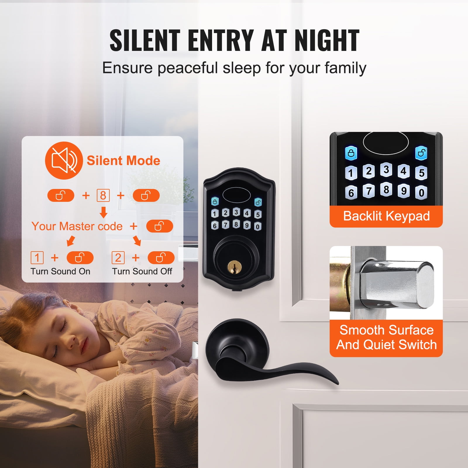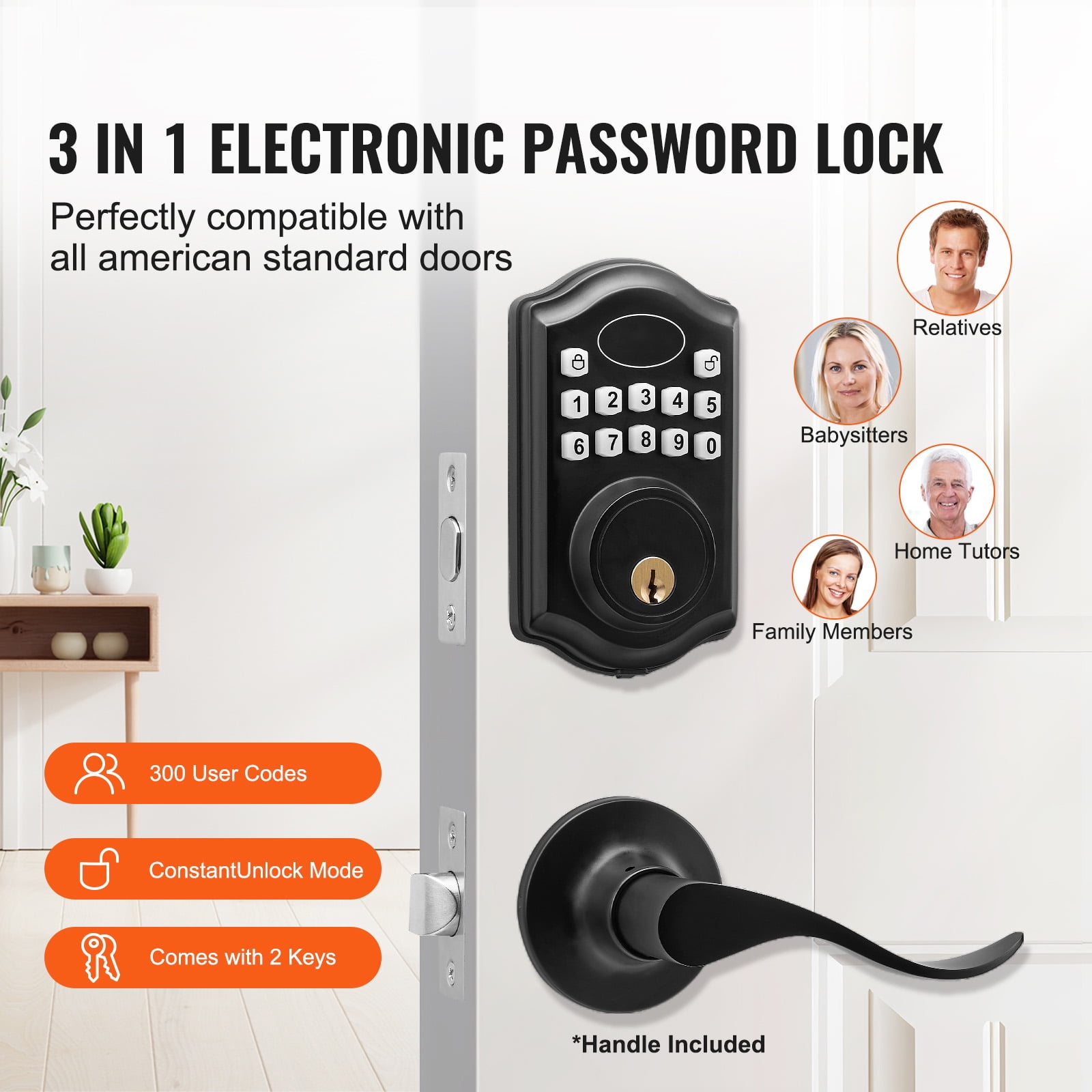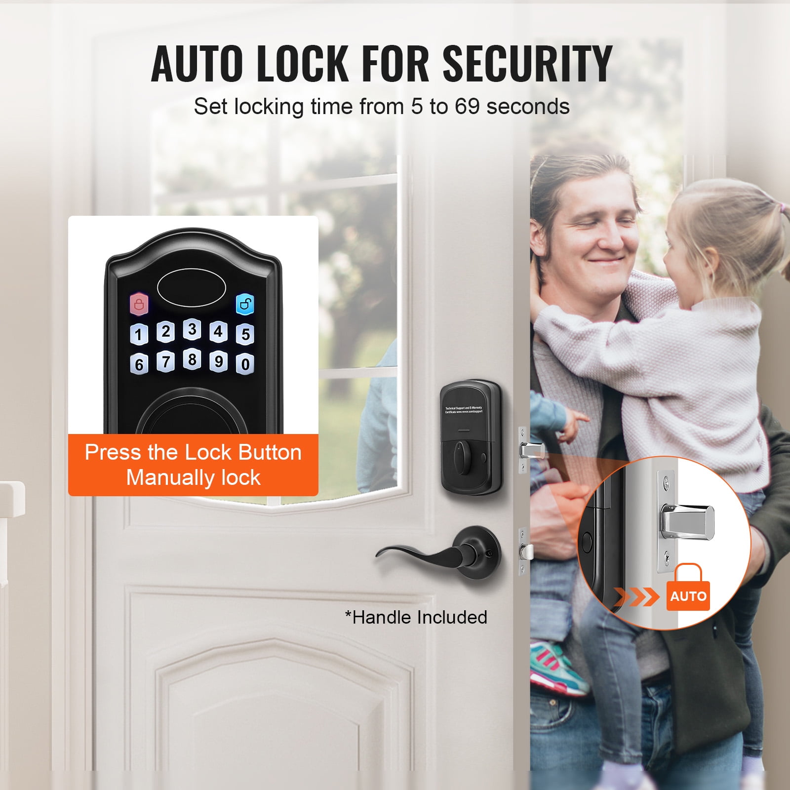 Unlock Your Way: Say goodbye to traditional locks! Our keyless entry door lock provides two unlocking methods – you can choose between a password or a key for access. You can even set up to 300 unique passcodes for family and friends. Exceptional Weather Resistance: Come rain or shine, our electronic door lock stands strong. The aluminum alloy panel ensures durability in temperatures ranging from -22°F to 158°F (-30~70℃), while its IP63 waterproof rating allows it to function flawlessly in any weather. It’s sunproof, waterproof, and freeze-resistant, suitable for both indoor and outdoor use, providing reliable home security. One-time Password & Anti-Peeping Code: We’ve taken password protection to the next level. One-time passwords provide convenience for temporary guests, automatically clearing after use for enhanced security and efficiency. The anti-peeping virtual code safeguards your privacy – you can input any digits before and after the correct password as long as it contains the correct sequence, effectively preventing peeping. Easy Breezy Access: Set your keypad door lock to auto-lock in 5-69 seconds – no more wondering if you locked the door, making it perfect for homes with seniors and children. Simply press the lock button for quick manual locking. Got a party? Frequent comings and goings? We’ve got you. Flip the “Constant Open” switch, and the door won’t lock automatically. Super flexible! High Compatibility: Our keyless door lock with handle is fully compatible with all American standard doors. The handle can be adjusted for left or right-hand orientation, enhancing both security and convenience for your home.
