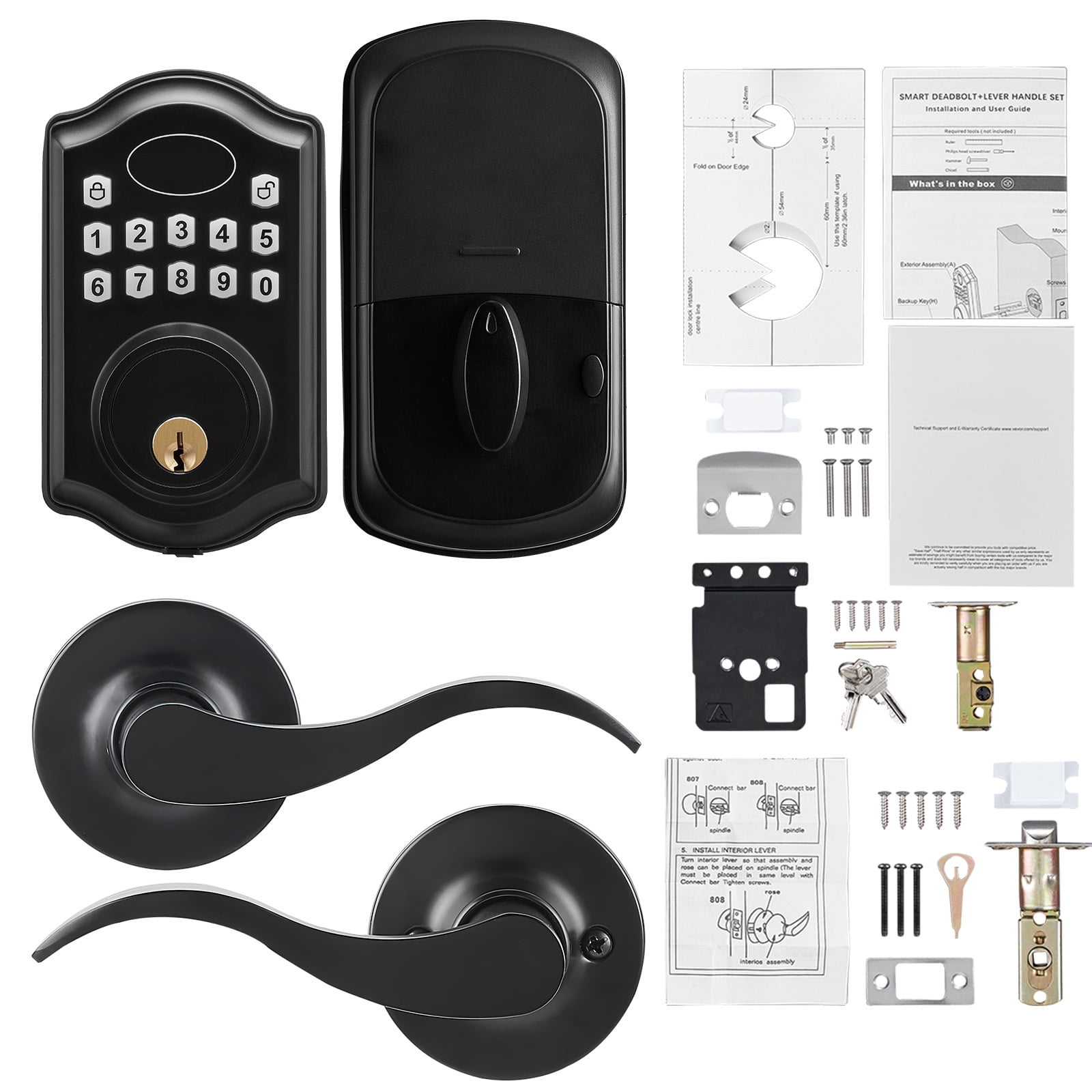 Product Description BENTISM Keyless Entry Door Lock with Handle This door lock combines two unlocking methods: personalized settings, high security, and adaptability to extreme environments, providing users with comprehensive security and convenience. Innovative features like one-time passwords and the anti-peeping code aim to bring intelligent and worry-free smart lock experiences to your home. Comprehensive Protection This electronic door lock combines both password and key-unlocking methods. It’s designed with an IP63 waterproof rating and an aluminum alloy panel, ensuring reliable operation even in adverse weather conditions. Plus, one-time passwords and the anti-peeping code provide extra security. Low Battery Reminder Our keypad door lock’s low battery reminder design helps users stay informed about the lock’s battery status before it runs out. Timely battery replacement reduces the risk of damage due to battery leakage, extending the lock’s lifespan. High Compatibility Our keyless door lock is perfectly compatible with most American standard doors. You no longer have to worry about size mismatches or installation issues. The handle can be freely adjusted for left or right-hand orientation, catering to your individual preferences. Simple Installation The structure of our door lock is straightforward, with each step streamlined to eliminate cumbersome procedures. Even if you’re not a professional, you can complete the installation quickly and efficiently with just a screwdriver. Quick Setup Before mounting the lock, give the circuit board a reset. Test the main code to make sure the latch retracts. If it does, proceed to step 2 for programming. If not, follow step 1 to adjust the direction. Programming Code=PC, User Code=UC. Press “Unlock” key+digits to enter programming mode. Silent Mode To ensure peaceful nights, our door lock features an intelligent silent mode. Once activated, button beep sounds are immediately muted. It also includes a noise-reducing lock body, making the door operation quieter. The backlit keypad allows clear visibility of the buttons at night, enhancing clarity and convenience for entry. Specifications Item Model Number: DS10-L Keypad Type: Mechanical Unlock Methods: Password/Key Door Handle Type: Three-Point Locking Number of Buttons: 12 Number of Passwords: 300 Material: Aluminum Alloy Compatible Door Thickness: 1.38-1.97 in / 35-50 mm IP Rating: IP63 Front Panel Dimensions (L x W): 5.35 x 2.76 in / 13.6×7 cm Back Panel Dimensions (L x W): 4.72 x 2.76 in / 12 x 7 cm Operating Temperature Range: -22°F – 158°F (-30~70℃) Net Weight: 3.08 lbs / 1.4 kg Package Content 1 x Door Lock 2 x Handles 1 x Set of Installation Hardwares 2 x User Manual 1 x Installation Paper Card 2 x Keys