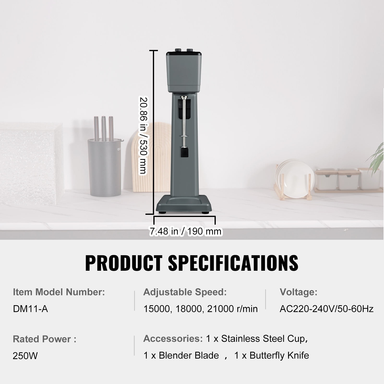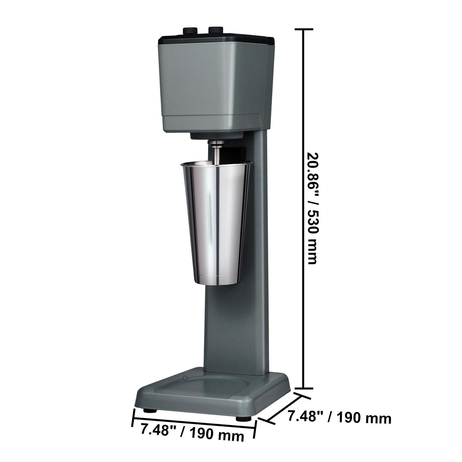 Product Description Single Head Milkshake Mixer Efficiently blend drinks with the milkshake machine’s powerful 1HP motor and unique lotus leaf mixing head. Its stainless steel build ensures hygiene and durability. Three speeds cater to various drinks, intelligent features automate stirring, and a preset timer streamlines usage. Rapid Mixing Featuring a 1HP high-power motor, this milkshake machine effortlessly blends soft beverages in just 12 seconds. The lotus leaf-shaped mixing head ensures a 360° even mixing, making it ideal for both home and work use. Food-grade Stainless Steel Crafted from food-grade stainless steel, the milkshake mixer boasts excellent corrosion resistance, promoting hygiene in bustling food and beverage settings. Its robust build ensures longevity, minimizing replacement and repair costs. Three Speeds for Mixing Featuring 3 speeds—15000r/min, 18000r/min, and 21000r/min—the machine accommodates diverse mixing needs, from milk tea to coarse grain rice paste. Equipped with a powerful motor, the milkshake mixer makes handling more challenging ingredients such as nuts, fruits, vegetables, or ice cubes easy. Anti-tipping Design The milkshake machine features an anti-tipping design, ensuring stable placement on the table even when making a milkshake and preventing unnecessary accidents. 10-minute Timer Function Our milkshake machine is also equipped with a 10-minute timer function, so you can more easily control the production time. Just put your favorite ingredients into the machine, press the timing button, and 10 minutes later, you can easily enjoy a delicious milkshake. Easy to Clean Our milkshake machine is very easy to clean and can be easily wiped off with just a regular cleaner. The stainless steel cup features a smooth inner wall that prevents residue buildup for enhanced taste and easy cleaning. Specifications Item Model Number: DM11-U Voltage: AC120V/60Hz Max. Load Power: 375W Material: SUS304 Capacity: 820 ml Working Noise: ≤75dB Maximum Timer Setting: 10 min Adjustable Speed: 15000, 18000, 21000 r/min Product Size: 7.48 x 7.48 x 20.86 inch/190 x 190 x 530 mm Net Weight: 11.9 lbs/5.4 kg Package Content 1 x Stainless Steel Cup 1 x Blender Blade 1 x Butterfly Blade