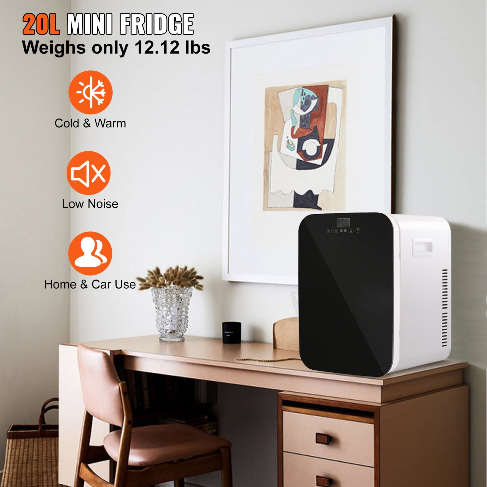 Cooling & Warming: Our mini fridge features both cooling and warming functions, allowing you to adjust the mode to your desired temperature. The cooling mode can reach below 73.4 °F ambient temperature (2H power on), while the warming mode can go up to 140 °F ambient temperature (1.5H power on). Intelligent Temperature Control: you can touch the electronic screen for precise temperature setting (-15.8~149°F). Even if the power is accidentally cut off, there is no need to worry, the original setting temperature will be restored automatically after power on. Quiet Operation: The considerate noise reduction technology ensures that the fridge operates at a noise level of less than 45bd, making it quieter and less disruptive to work and daily life. It won’t disturb your rest and is perfect for any setting – be it your bedroom, office or nursery. Compact but Spacious: Our mini-fridge features a small body, but it can hold up to 22 cans of 330ml beverage in its 20L capacity, weighing only 12.12lbs. Both sides are equipped with carrying handles to make it portable and easy to carry, ideal for storing food, drinks, breast milk, skincare products, medicine, and more. Versatile and Convenient: The personal fridge comes with both a 12V car DC power cord and a household power adapter, making it suitable for self-driving and outdoor activities. Its sleek design and practical functions also make it a great gift for loved ones and friends who enjoy hiking, picnics, or camping trips.