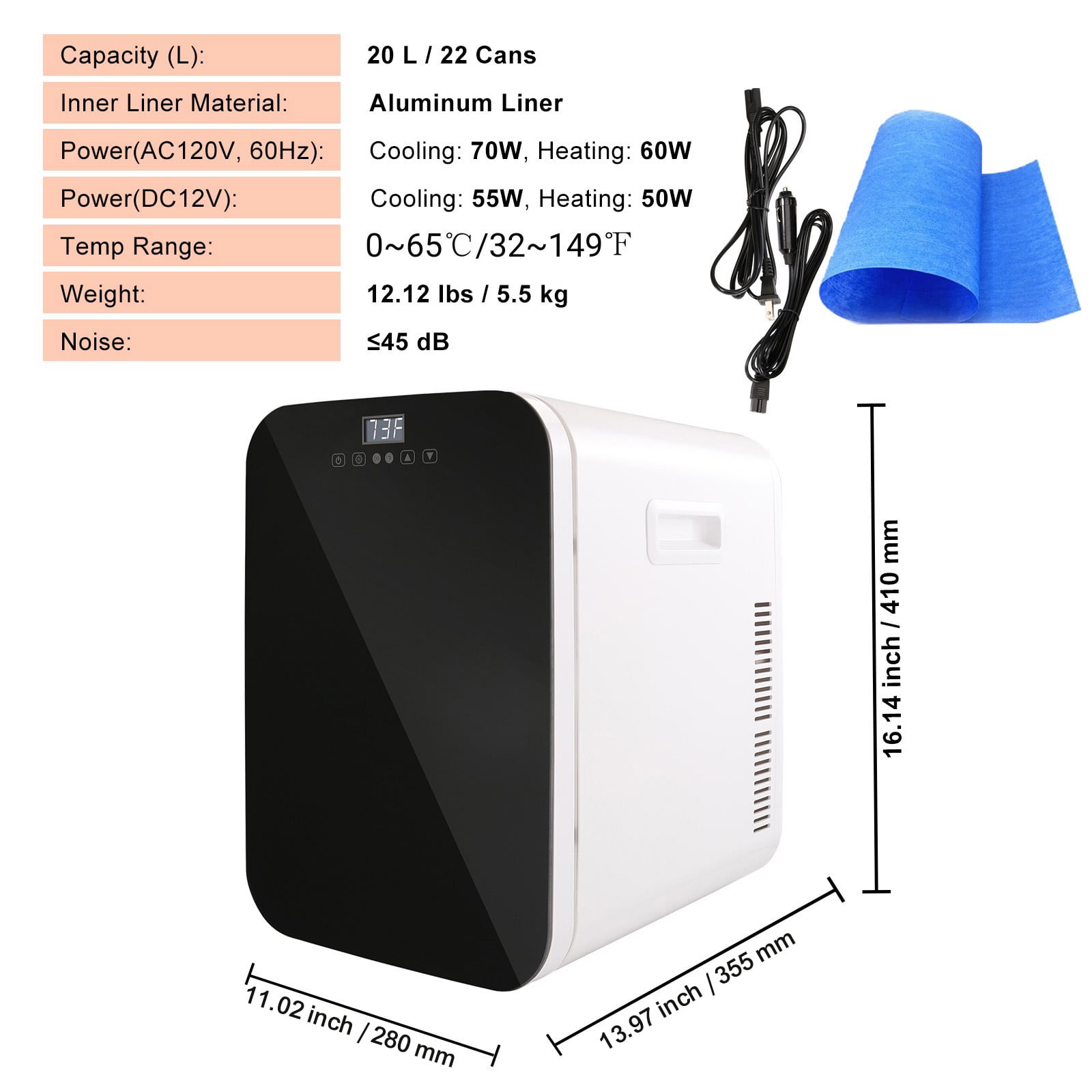 Product Description 20L Mini Fridge This multifunctional 20L mini fridge has both cooling and warming modes, and it can go as low as 73.4 °F below ambient temperature and as high as 140 °F above ambient temperature. The ≤45db low decibel operation will not disturb your work and life. Equipped with home power adapter and 12V DC power cord, this Fridge is perfect for indoor and outdoor use, where you need to store food, drinks, breast milk, medicine, cosmetics, etc. On the Go Say goodbye to warm drinks on long car rides with this mini fridge’s car power cord! The 12V DC power cord allows you to easily connect your fridge to your car’s power supply to meet your needs for self-driving and outdoor activities and enjoy cool drinks and snacks while on the go! Touch Screen & Digital Display The external sensitive touch control panel allows you to make precise temperature settings, and the electronic digital display allows you to monitor the internal temperature of the refrigerator at any time, so you can use it with more confidence. Power-off Memory No need to worry even if there is an accidental power failure, it will automatically restore the original setting temperature after power on (-15.8~149°F adjustment range). Compact and Portable Small in size and light in weight (12.12lbs), this makeup fridge is the perfect companion for all your outdoor activities. With handles on both sides, carrying it around is a breeze! The 20L capacity can store can store food, drinks, breast milk, skin care products and medications, etc. Silent Operation Don’t let a noisy fridge get in the way of your peace and quiet! With its thoughtful noise reduction technology, this portable mini fridge operates at a sound level of below 45bd, making it an ideal option for use in bedrooms, workplaces, and other areas where quiet is essential. Cooling & Warming Dual Mode With its cooling and heating dual modes, this cooler and warmer freezer is a real game-changer. The cooling mode can cool down to 73.4 °F below ambient temperature, while the warming mode can heat up to 140°F above ambient temperature. Specifications Item Model Number: MFA-20L-F Color: Black Capacity (L): 20L/22 Cans Inner Liner Material: Aluminum Liner Power(AC120V, 60Hz): Cooling: 70W, Heating: 60W Power(DC12V): Cooling: 55W, Heating: 50W Temp Range: -9°C~65°C / -15.8~149 °F Weight: 12.12 lbs / 5.5 kg Noise: ≤45 dB Size: 13.97 x 11.02 x 16.14 inch / 355 x 280 x 410 mm Package Content 1 x Mini Fridge 1 x US Power Adapter 1 x DC Car Power Cable 1 x Towel 1 x Manual