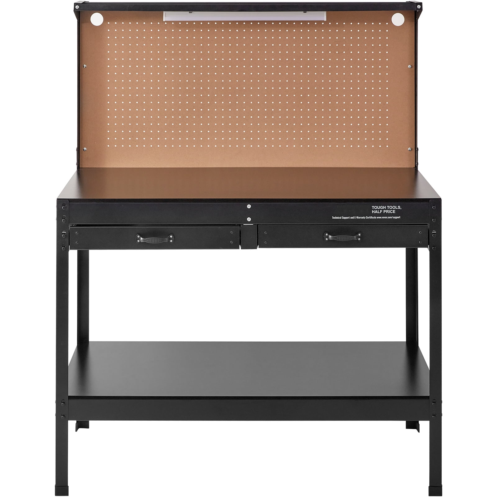 Product Description BENTISM Multifunctional Workbench with Pegboard BENTISM Multifunctional Workbench boasts a sturdy construction and ample storage capacity, featuring a convenient pegboard, drawers, and extra storage space to keep your workspace tidy and organized. Its multipurpose functionality makes it suitable for a wide range of projects, whether it’s DIY at home or professional studio work. Choose the BENTISM Workbench with Pegboard to create an efficient and comfortable workspace, making work a breeze! Versatile Pegboard We provide you with 30 hanging hooks and a perforated MDF pegboard, allowing you to neatly organize all your tools. With easy access to your tools, you can work efficiently and keep everything in order. Durable Rubber Feet The fixed rubber feet can withstand a weight of up to 220lbs, making the workbench suitable for various uneven surfaces. Enjoy a stable and sturdy working environment that can handle heavy-duty tasks with ease. Double Layer Work Surface Our workbench features a dual-layer design, providing not only a visually appealing aesthetic but also doubling your storage and workspace capacity. Maximize your productivity with ample room for your tools and projects. Stable Construction Crafted from heavy-duty steel, our workbench features multiple crossbeams, ensuring a stable structure that keeps you steady and secure while working. No more wobbling or distractions—focus on your tasks with confidence. LED Lighting for Illumination Equipped with an upgraded 14W LED light, our workbench offers energy-efficient and power-saving illumination. Perfect for dimly lit basements or garages, the LED light enhances visibility, enabling you to work with precision and clarity. Multi-Functional Power Outlet The built-in power panel features four AC outlets and two USB ports, allowing you to conveniently power multiple tools simultaneously. With a 59″ cable, you’ll always have a reliable power source ready whenever you need it. Specifications Model: JL-WB05-3 Frame Material: A3 Steel Voltage: 120 V / 60 Hz, max. 1500 W Cable Length: 59 in / 1.5 m Certification: ETL Certification Weight Capacity: 220 lbs / 100 kg Bench top Thickness: 0.47 in / 12 mm ± 0.2 mm Bench top Size: 47 x 24 in / 120 x 60 cm ± 0.5 mm Product Weight: 28.8 kg / 63.5 lbs Package Content 1 x Workbench 30 x Hooks 1 x Manual 14 x M6*16 Bolts 14 x M6 Nuts 12 x M4*12 Bolts 12 x M4 Nuts 4 x Rubber feet