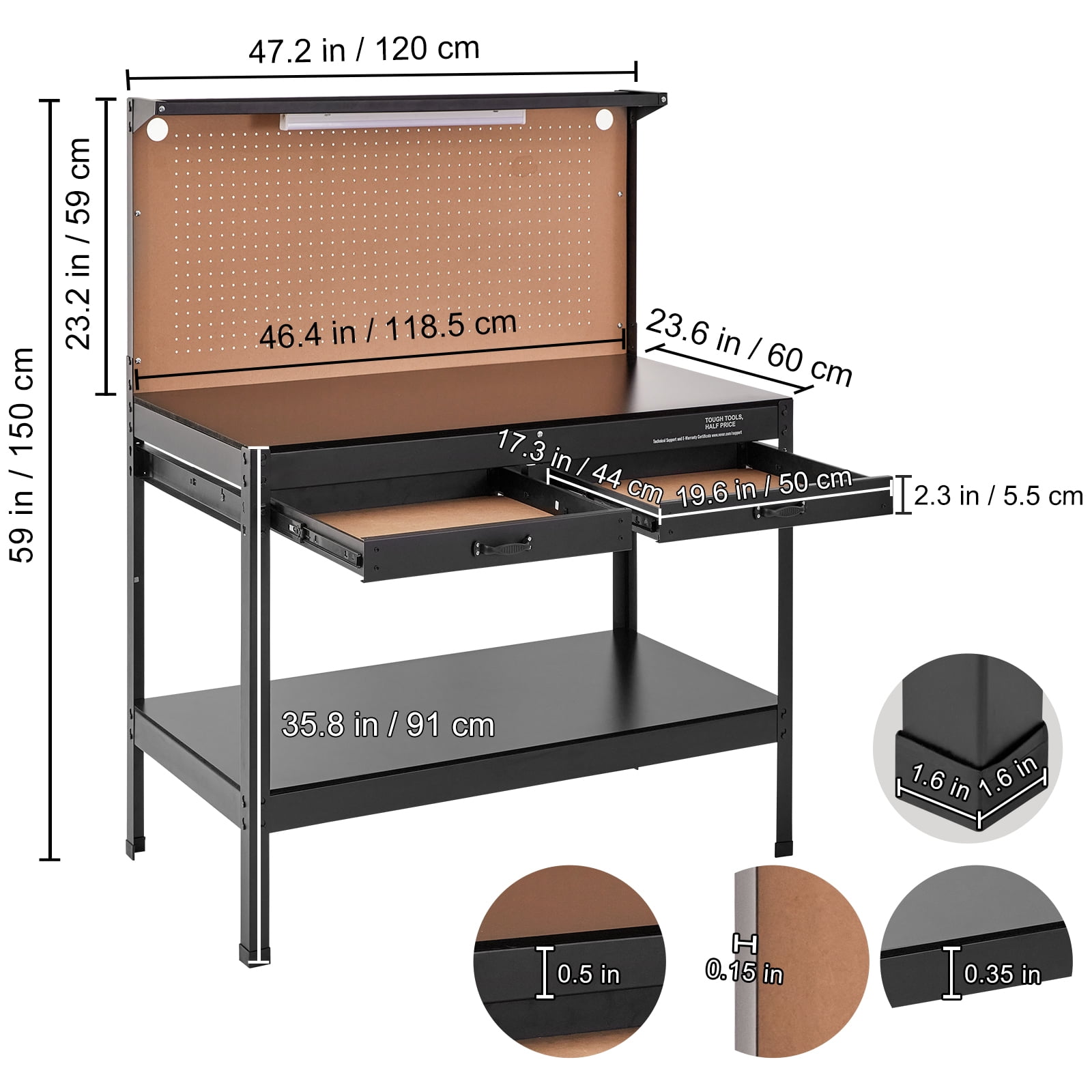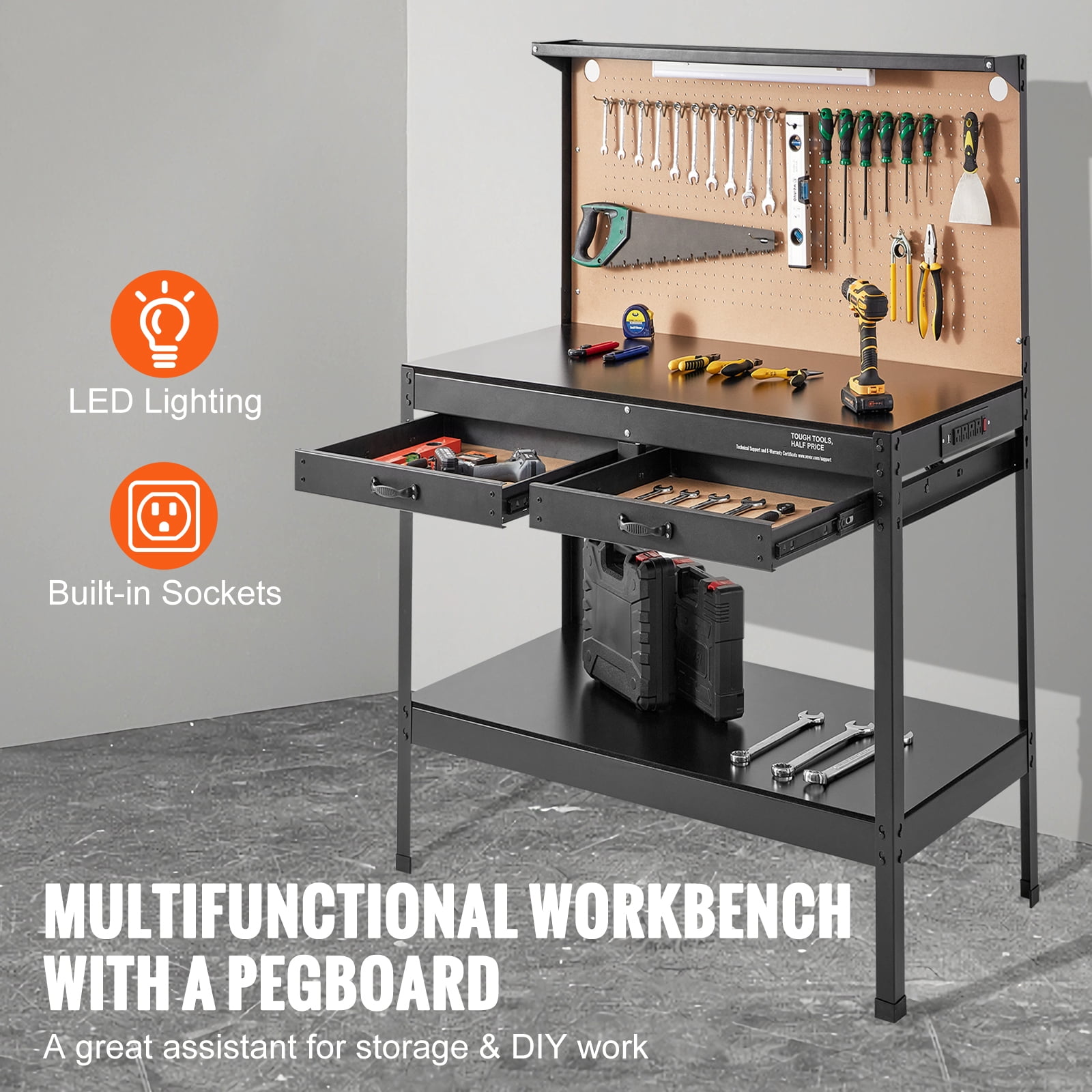 Stable Construction: Crafted from heavy-duty steel, our workbench features a sturdy structure with multiple crossbeams. This ensures stability and prevents any wobbling while you work, allowing you to focus on the task at hand. Impressive Load-Bearing Capacity: Equipped with fixed rubber footings, our workbench adapts to uneven floors, providing slip resistance and leveling support. It can support a remarkable weight of up to 220lbs, making it perfect for handling heavy-duty projects. LED Lighting for Enhanced Visibility: Upgraded with a 14W LED light, our workbench offers energy-efficient illumination. It is especially useful in dimly lit basements or garages, ensuring optimal visibility and enabling you to work with precision. Versatile Power Outlet: The built-in power panel features four AC outlets and two USB ports, allowing you to simultaneously power multiple tools. With a 59″ cable, you have a convenient power source readily available whenever you need it. Efficient Storage Solutions: To keep your tools organized, we provide 30 hanging hooks, a dual work surface, a perforated pegboard, and drawers. This comprehensive storage setup ensures that all your tools are neatly arranged, easily accessible, and promotes efficient workflow, allowing you to complete your tasks quickly.