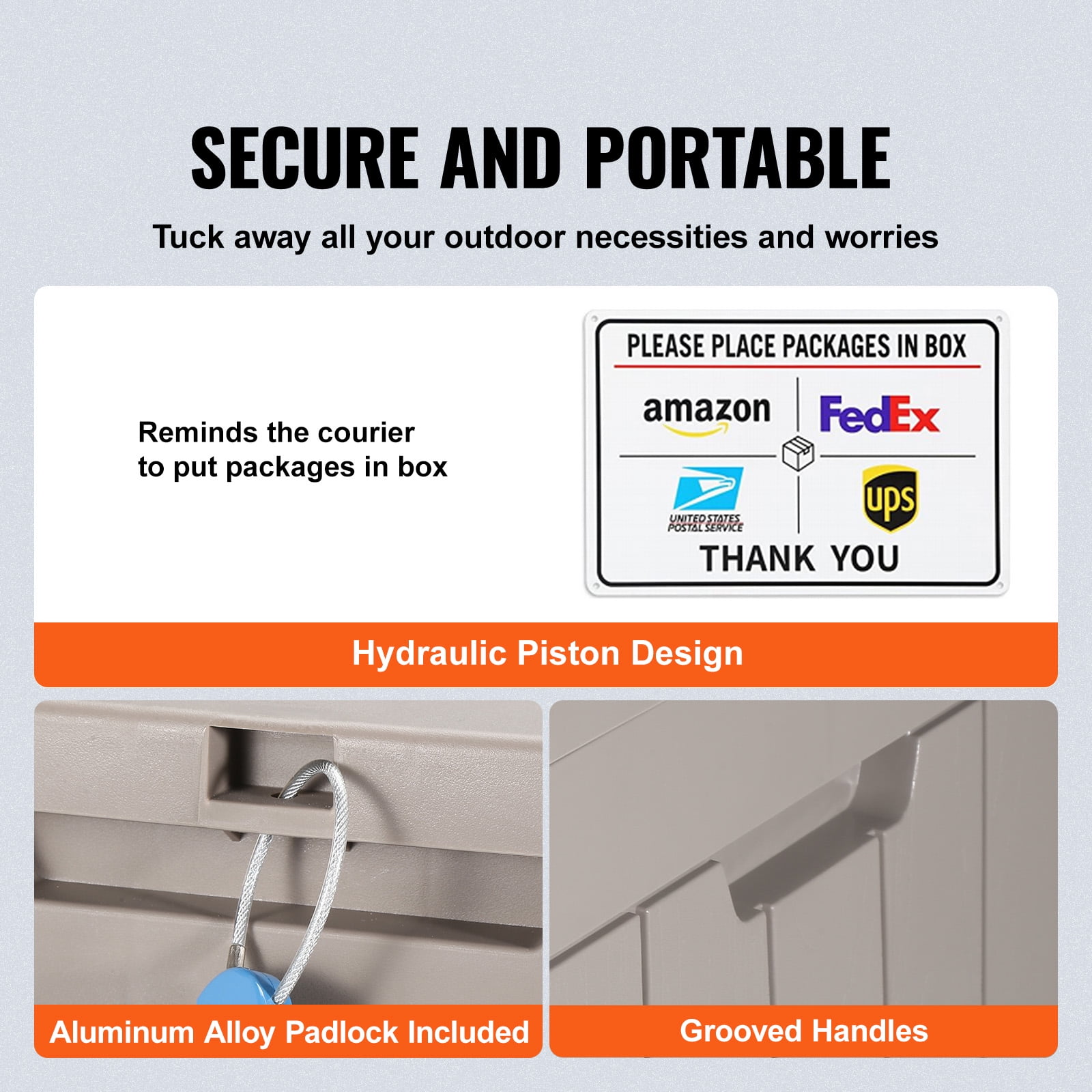 Product Description 31-Gallon Deck Box Transform your outdoor space into an organized and clutter-free oasis with this spacious 31-gallon deck box. It is a safe space to keep all your outdoor gear. Made from durable polypropylene (PP) material, this deck box is weather-resistant and UV-protected, and built to last for years to come. Say goodbye to outdoor clutter and hello to a more organized and functional space with this outdoor deck box. Aluminum Alloy Padlock You can keep your special items locked in the box for added security. Easy Grip Side Handles Designed with handles on both sides for easy lifting and portability. Aluminum Sticker Included This serves as a reminder for couriers to deposit packages inside. Extra Seating or Table It offers plenty of extra seating and even acts as a stylish table thanks to its flat top. Keep It All Organized Use it for storing sports equipment, gardening tools, or even packages at your door. Build to Last PP material is resistant to weather, UV rays, and impact, making it ideal for outdoor use in all seasons. Specifications Storage Capacity: 31 Gallon / 117.3 L Weight Capacity: 170 lbs / 77 kg Material: PP Exterior Dimensions (After Assembly): 22.1″ x 17.1″ x 20.9″ / 561 x 434 x 530 mm Interior Dimensions (After Assembly): 20.9″ x 14.3″ x 19.7″ / 531 x 359 x 501 mm Item Weight: 8.4 lbs / 3.8 kg Package Content 1 x Deck Box Set 1 x Aluminum Alloy Padlock 1 x Aluminium Sticker 1 x Installation Kit (Set)