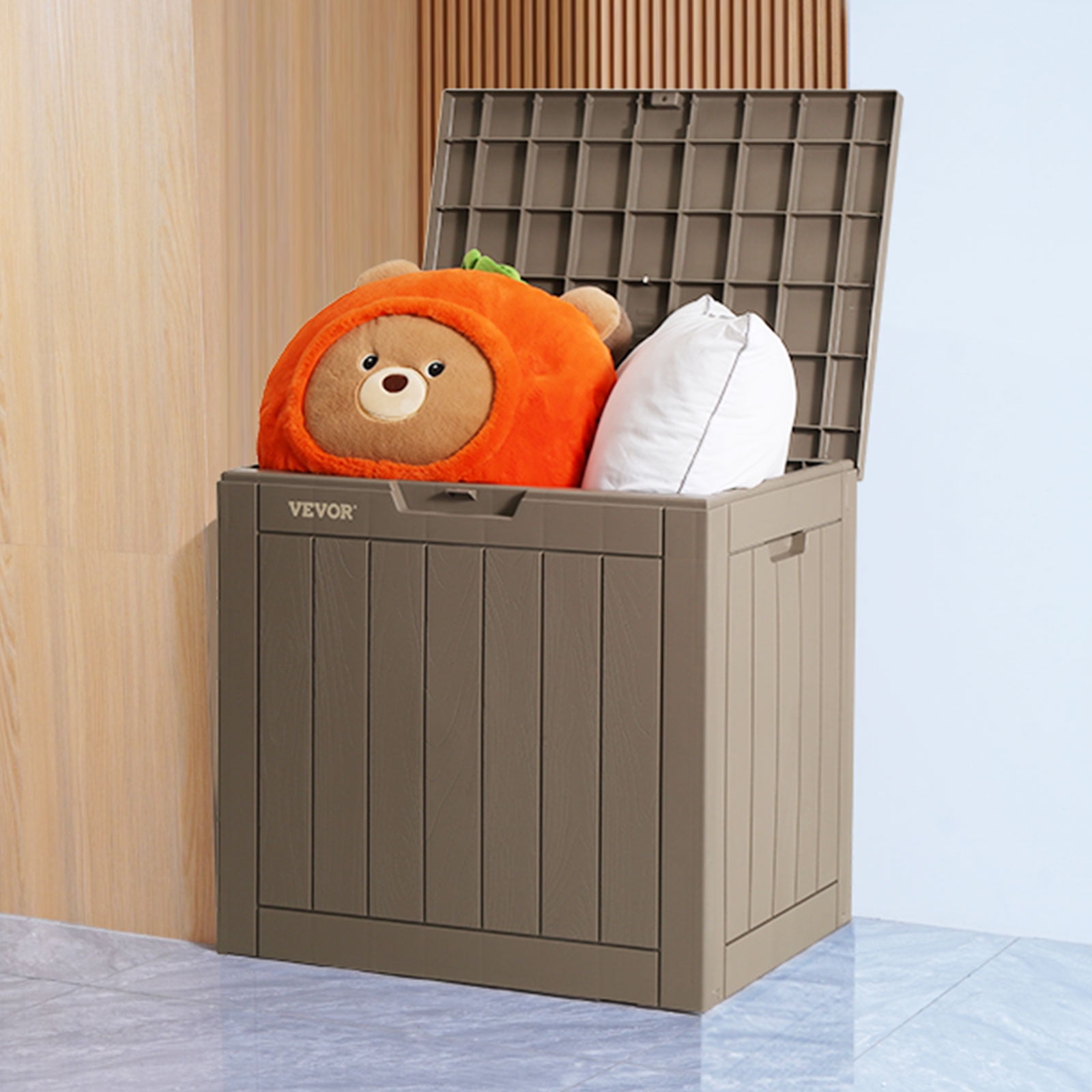 BENTISM Outdoor 31 Gallon Polypropylene Deck Box, Gray Spacious Storage Capacity: Features a 31-gallon capacity, perfect for storing gardening supplies, pool toys, seasonal cushions, and more Extra Seat or Side Table: The flat top allows it to double as a seat or side table, with a maximum weight capacity of 170 pounds Durable Construction: Made from waterproof, UV-resistant polypropylene (PP) that mimics natural wood grain while ensuring long-lasting durability Security and Portability: Equipped with a locking mechanism for added security and built-in handles for easy transport Easy Assembly: Simple to assemble with clear instructions and easy-to-follow pictures in the user manual