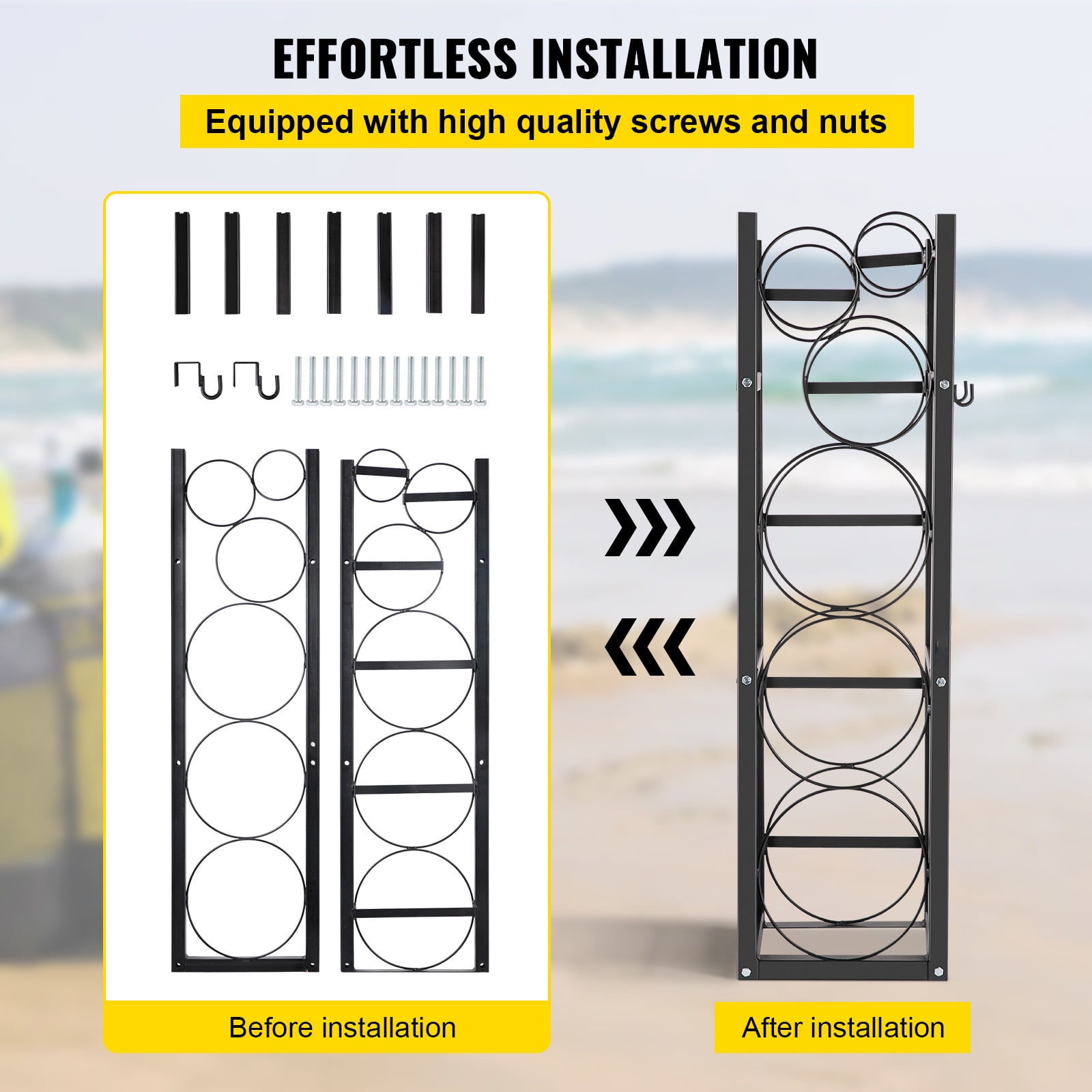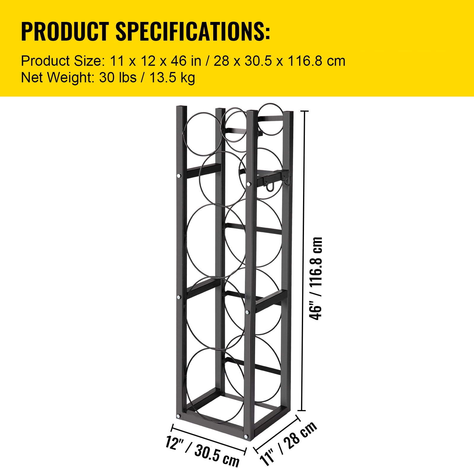 【HEAVY-DUTY CONSTRUCTION】- Made of heavy-duty carbon steel, which is corrosion and rust resistance. The thickened and strengthen structure ensures stability and durability. Designed for long time use. 【SUFFICIENT CYLINDER STORAGE】- The gas cylinder stand equipped with 1*50lb, 2*30lb and other 3 small bottles storage space for you to store your different size of cylinders. And it can prevent sliding efficiently. 【FREE TO ASSEMBLE】- With the detachable frame, you can conveniently install and fix the cylinder tank rack with some simple high-quality screw nuts. Every joint and every nut is in place. 【CONSIDERATE GIFTS】- There are high-performance hooks we offer to hang on the cylinder holder, which provide extra help if you need put aside other tools. 【WIDE APPLICATION AREA】- Perfect for outdoor and indoor use for saving cylinders such as gas, oxygen, nitrogen, acetylene, etc. 【ATTENTION】-Please Place Cylinders From The Bottom To Avoid Trpping.