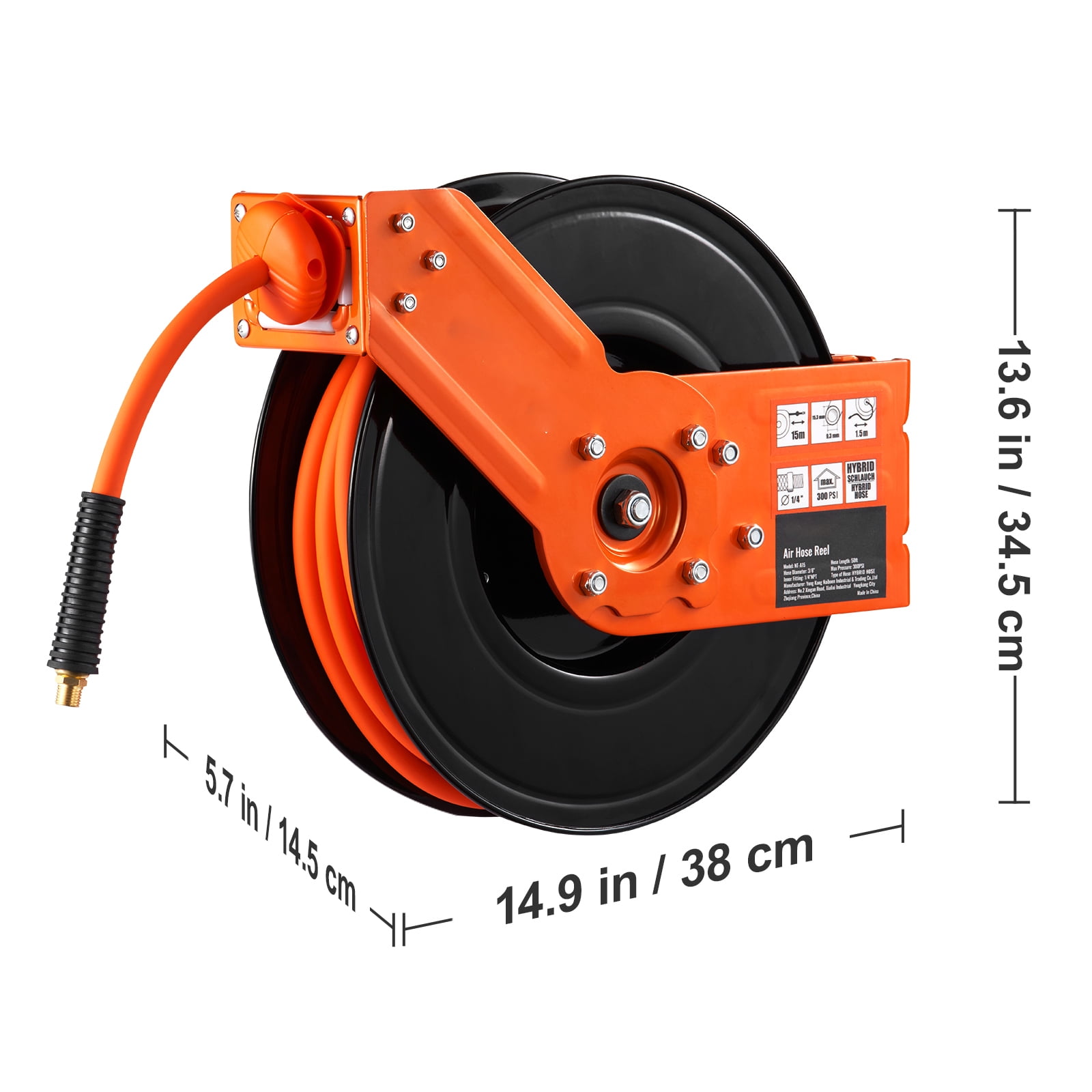 Product Description 50-Feet Retractable Air Hose Reel The BENTISM Auto-Rewind Air Hose Reel is a versatile tool for any garage or workshop. Its kink-resistant rubber hose is flexible in extreme temperatures and UV-ray and ozone-resistant. Mount it on the floor, ceiling, or wall for convenient use. Take control of your next project with BENTISM! Double Layer Stopper Lock the hose at the desired position, and ensure the hose does not slip. Rubber Protector Protect the air hose connection from bending, leaking or wearing. Rub-resistant Spring Guard Prevents the hose from bending or kinking. 50′ Air Hose 3/8 in x 50 ft, 1/4″ NPT thread, 300 PSI bursting strength. Rely on our retractable hose reel to avoid a tangled mess. Automatic Retraction With just a gentle tug, the reel will smoothly retract the hose, eliminating the hassle of tangled and cluttered hoses. Protection and Endurance The hose is guided by four non-snag rollers to reduce abrasion and wear on the hose and resists kinking and tangling under pressure. Specifications Item Model Number: NT-A15 Mounted Size: 13.6 x 5.7 x 15 in / 34.5 x 14.5 x 38 cm Hose Length: 50 Feet Hose ID: 3/8 Inch Hose Material: Hybrid (Rubber & PVC) Hose Working Pressure: 300 psi Hose Threads: 1/4 Inch NPT Leads: 5 in Length Temperature Range: -4°-113°F Reel Material: DC03 Steel Net Weight: 23 lbs / 10.4 kg Package Content 1 x Air Hose 1 x User Manual 4 x Expansion Bolts 1 x Pre-Mounted Bracket