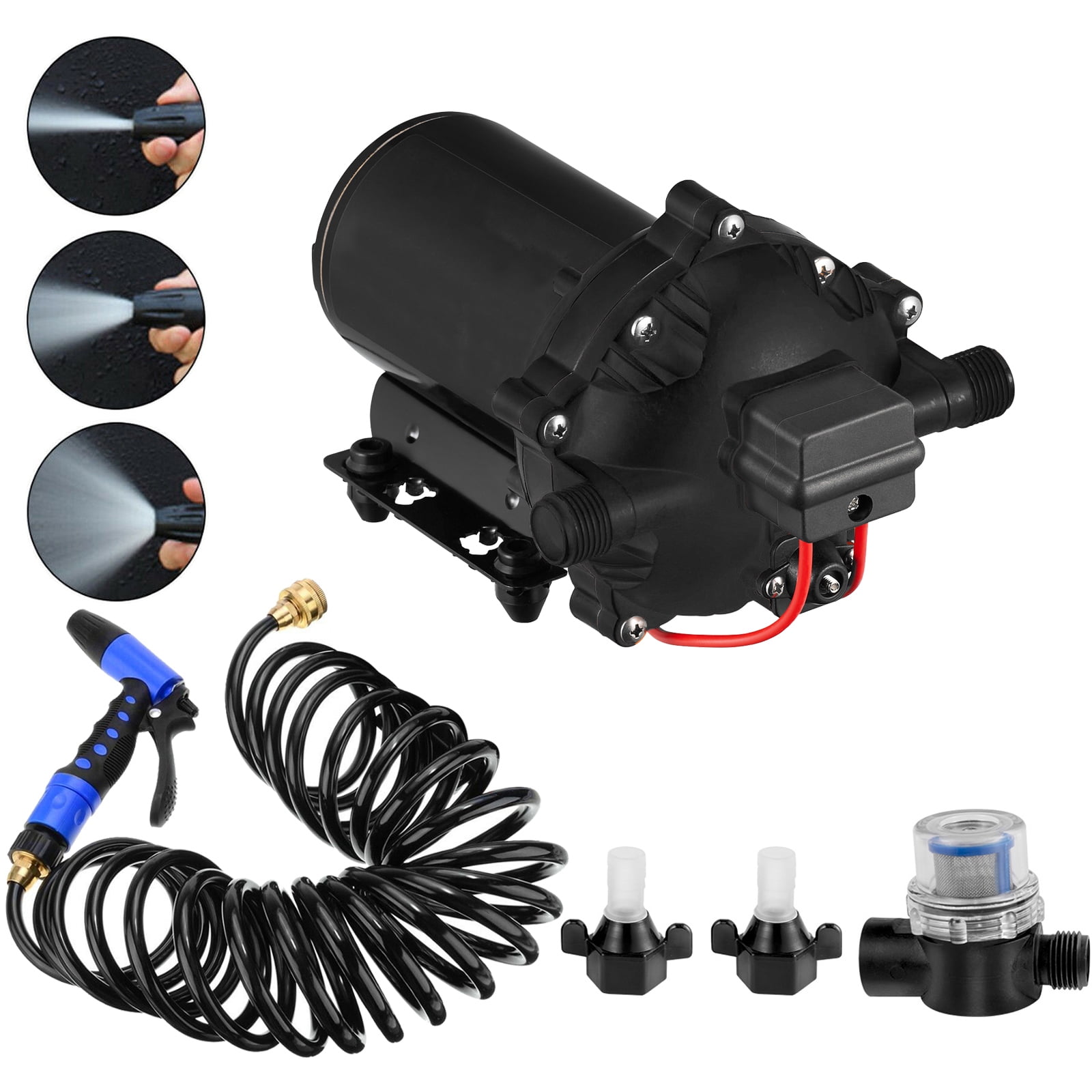 【SUPERIOR PERFORMANCE】- The self-priming 12V pump is equipped with an automatic pressure switch control that automatically opens and closes when you open and close the nozzle. It features 20 Liters per minute (5.3 GPM) capacity flow with a high pressure of 70 PSI and has built-in thermal overload protection. 【COMPLETE WASH PUMP KIT】- This washdown pump kit includes a trigger Nozzle with Quick Connect, a Quick Connect Adaptor, a UV-protected 25′ Coiled Hose, two NPT Connectors with 1/2″ Straight Barb, and a Universal Saltwater Filter/Strainer. 【EASY CONNECTING】- This water dash pump has an externally threaded port pump head, available in various sizes, and can mount styles for easy connection to any outlet. The water pipe’s threaded connection is made of high-quality brass, and the filter can be removed for cleaning. 【VARIOUS USES】- The 12v water pump is designed for intermittent use with a duty cycle of 30 minutes and is suitable for fresh or saltwater. Ideal for cleaning boats, fish tanks, anchor chains, beacon stations, and boats. It can also be used to clean ships, RVs, and leisure decks. 【HIGH-QUALITY MATERIAL】- The 5-chamber positive displacement diaphragm pump’s main body is made of ABS engineering plastic, one-piece, tightly sealed, and durable. A high-powered motor with a waterproof cover and a sealed pressure switch ensures that the pump operates in harsh environments. Rubber mounting feet reduce noise and prevent corrosion.