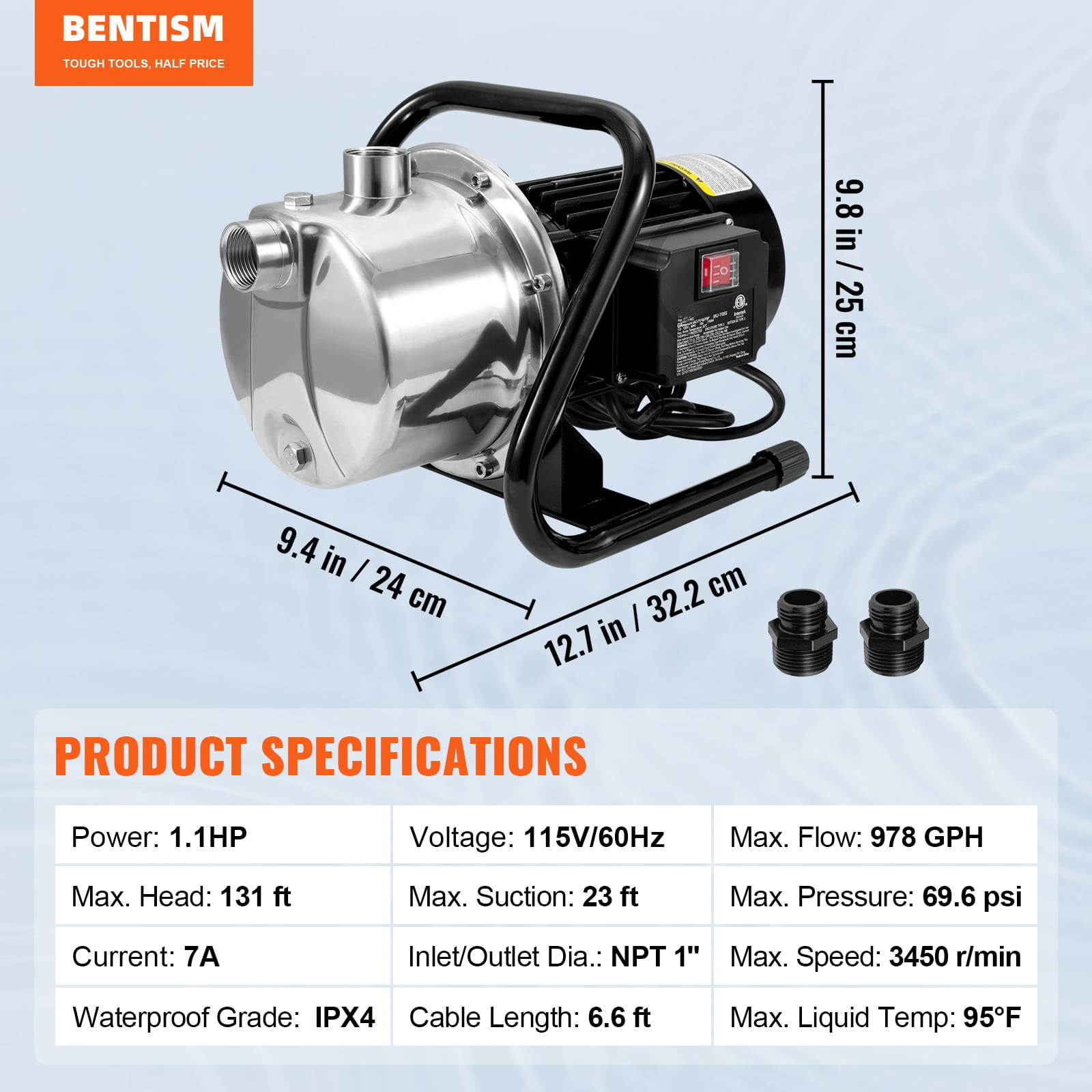 Product Description 1.1HP Shallow Well Pump Are you worried about the water supply for your garden or farmland? Well, get ready to have your well up and running again in no time! Our lawn sprinkler pump provides a large flow rate and high head lift, meeting all your water needs. The premium stainless steel pump head makes this lawn irrigation pump rust-proof and corrosion-proof. Pump it up today and start living life to the fullest with our sprinkler pump. Don’t hesitate to get one!!! Easy-to-Carry Handle Our lightweight lawn water pump has a portable handle made from durable iron. It won’t cost you anything to bring it everywhere with you. Waterproof & Safe Switch This sprinkler pump is designed with a security switch. Its waterproof cap prevents accidental startups, allowing you to operate with confidence. Garden Hose Adapters The shallow well pump features NPT 1″ suction and discharge, coming with two garden hose adapters. You can easily connect the hoses to the pump. Max Suction: 23 ft; Max Pressure: 69.6 psi. This 1.1HP booster pump features a large 978 GPH flow and 131 ft head lift. No water supply problem will be a challenge for you. The thickened stainless steel pump head makes this shallow well jet pump an excellent choice, putting your mind at ease by avoiding corrosion, rust, and leakage. Whether you want to water the garden, irrigate crops, or wash your car, BENTISM is the one you can trust. This transfer pump is a great helper for sprinkler systems and lawn/farm irrigation. Specifications Model: XKJ-805S-1 Material: Stainless Steel + Cast Aluminum Handle Material: Iron Power: 1.1HP/800W Voltage: 115V/60Hz Max Flow Rate: 978 GPH (3.7 m³/h) Max Head Lift: 131 ft/40 m Max Suction Height: 23 ft/7 m Max Pressure: 69.6 psi/4.8 bar Current: 7A Max Speed: 3450 RPM Inlet/Outlet Diameter: NPT 1″/2.5 cm Waterproof Grade: IPX4 Insulation Class: F Max Liquid Temp: 95℉/35℃ Cable Length: 6.6 ft/2 m Product Size (L x W x H): 12.7 x 9.4 x 9.8 in/32.2 x 24 x 25 cm Product Weight: 15.9 lbs/7.2 kg Package Content 1 x Shallow Well Pump 1 x 6.6 ft Cable with US Plug 2 x Garden Hose Adapters