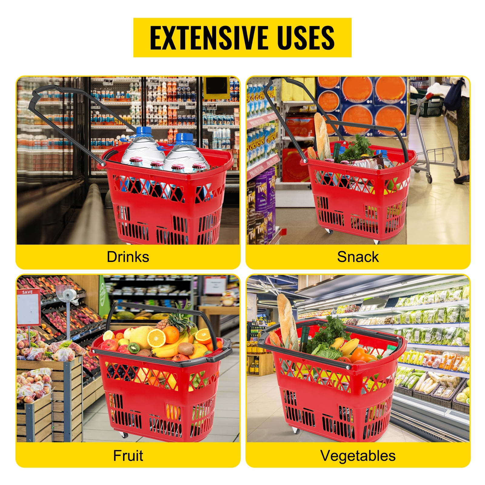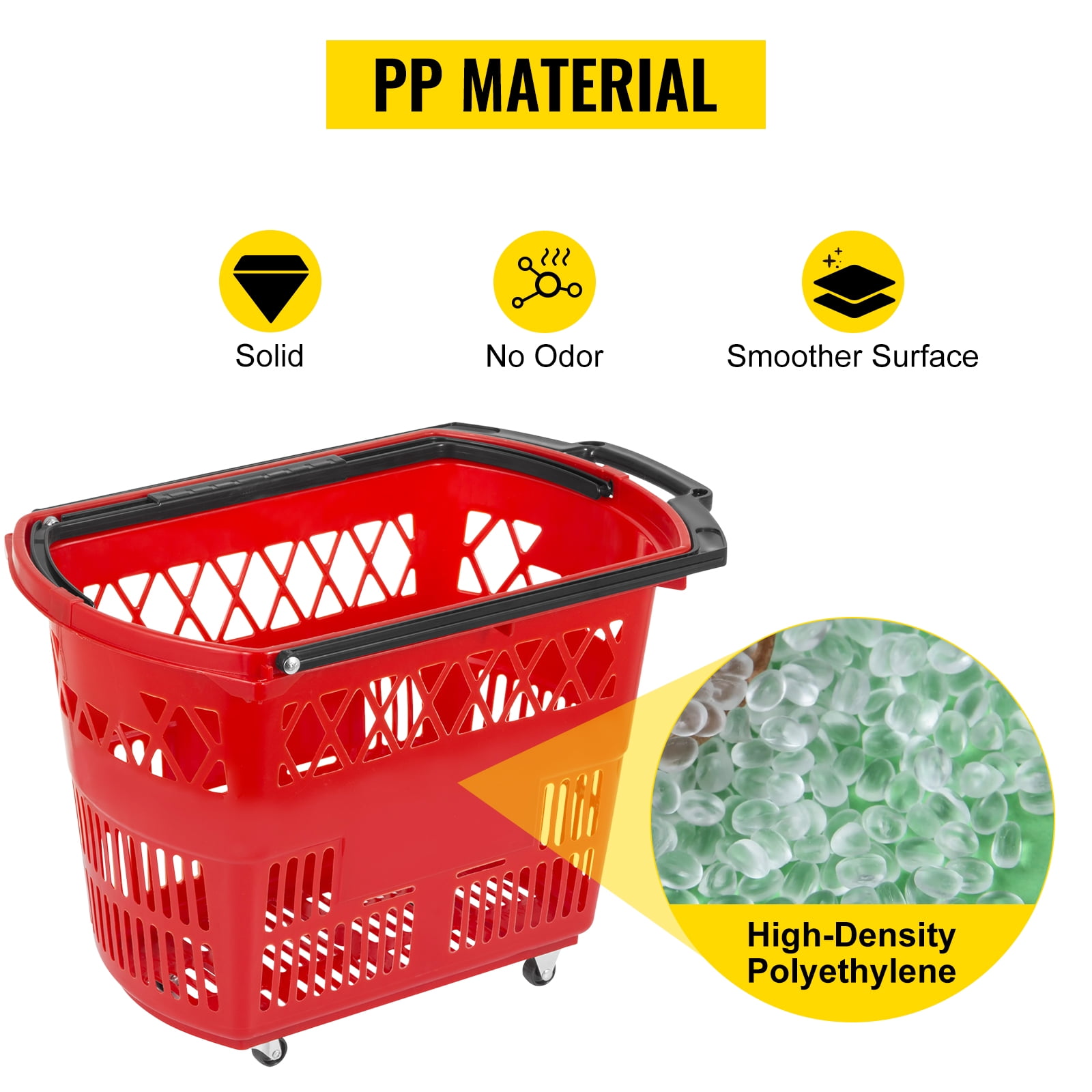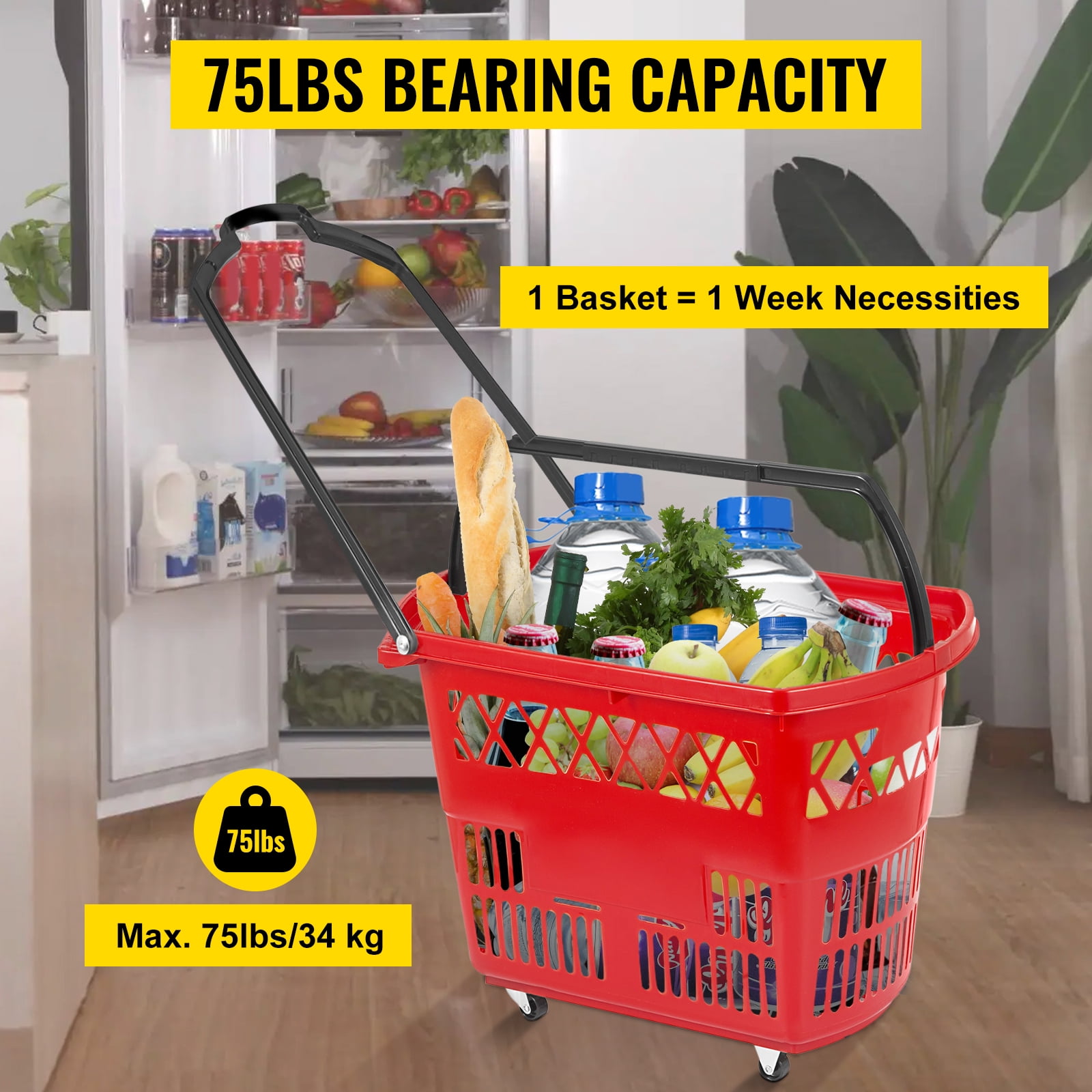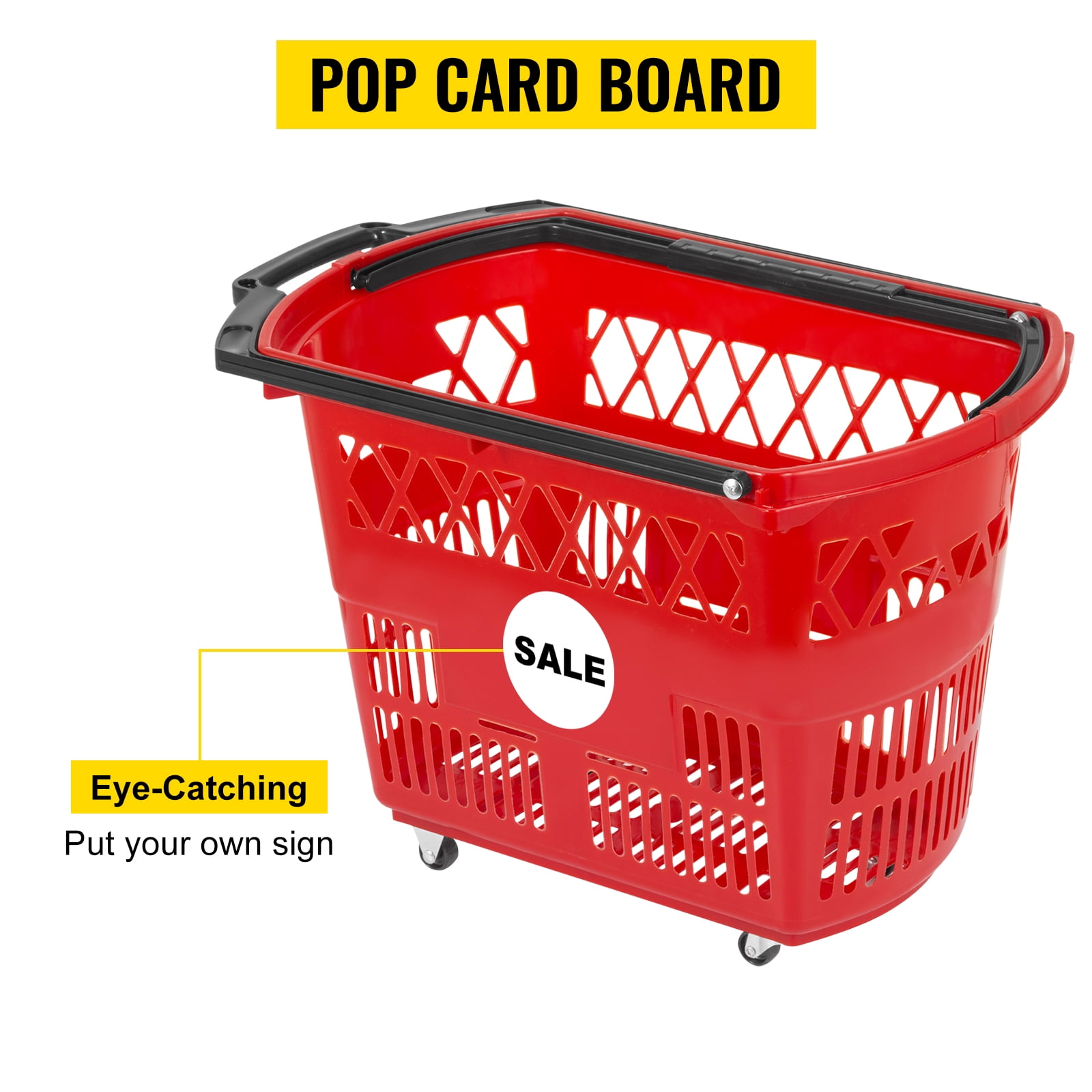 75 Pounds Accommodation:Capacity of one basket up to 34kg/75LBS thanks to its premium material and durable construction. Several reinforced ribbing at the bottom is for more durability.Great for hold fruit, vegetables, shampoo and all kinds of groceries. PP Material:Made of food-grade PP material, it is durable, washable, and lightweight. Not easy to be broken. Bright color fit all environment.Made of premium plastic, features high durability and stability. Has thickened strips at the bottom. Two-handle Option:Two fodable handles: one pull-out handle and one carrying handle. If the load becomes too heavy, simply use the pull-out handle and roll it on the ground.There baskets can be pulled or lifted with the two handle options, both are comfortable and easy to grip. Smooth Swivel Wheels:There are 4 swivel casters at the bottom for easily moving. Heavy products and bags can be loaded up and pulled with a breeze in our shopping baskets.Two rectangle Pop card board at the basket is for you to easily paste advertisement or brand name on the basket. Meet your needs for decoration or advertising. Compact Yet Roomy:With foldable handles, our baskets can be easily stacked to a good height without taking much floor space when not in service. Also much easy for customers to grab it.Easily catches people’s eye. Perfect for carrying and storing merchandise in bookstores, supermarket, KTV and the like.