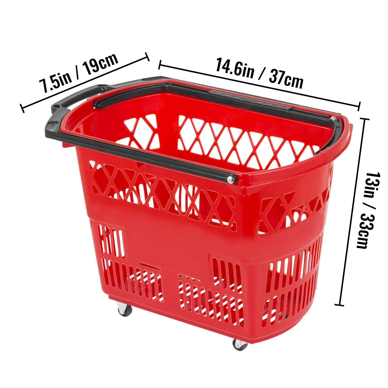 Product Description Set of 6 Red PP Material Shopping Basket Here we offer you set of 6 red shopping baskets. These hand baskets have bright red color for easy visibility. Each basket is lightweight and comes with one pull-out handle and one carrying handle. Four casters allows you to move the basket on ground. Our shopping basket is a convenient way for your customers to carry or moving their merchandise and for merchant to increase their sales. Specifications Color: Red Material: PP Peripheral Dimension Of Each(LxWxH): 46.5x28x33cm / 18.3x11x13in Inner Dimension Of Each(LxWxH): 37x19x33cm / 14.6×7.5x13in Load Of Each: 34kg/75LBS Package Content 6 x Red Shopping Basket