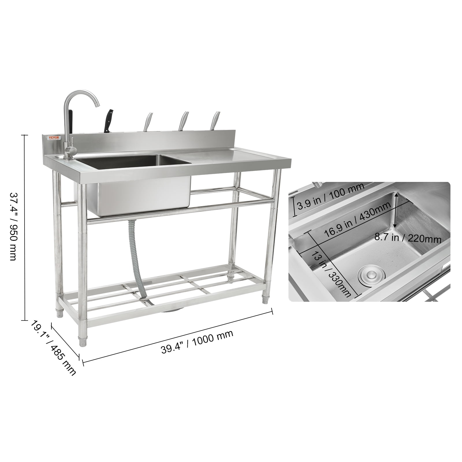 Bentism Silver Stainless Steel 39.4 x 19.1 x 37.4 inches Rectangular Single Bowl Sink High-Quality Stainless Steel Construction: Made from durable stainless steel, this sink offers excellent corrosion and oxidation resistance, ensuring a long lifespan Clog-Free Design: Features a multi-layer sealed drain with a removable filter basket to prevent clogs, along with a thickened PP drain pipe for efficient drainage Hot & Cold Faucet Included: Comes with a 304 stainless steel faucet that rotates 360°, providing flexibility in water direction. The ceramic valve core ensures precise control and leak-proof performance Versatile Workstation: Ample space for washing and food handling, with a designated knife storage area and open storage for cleaning tools, designed to prevent water pooling for easy maintenance