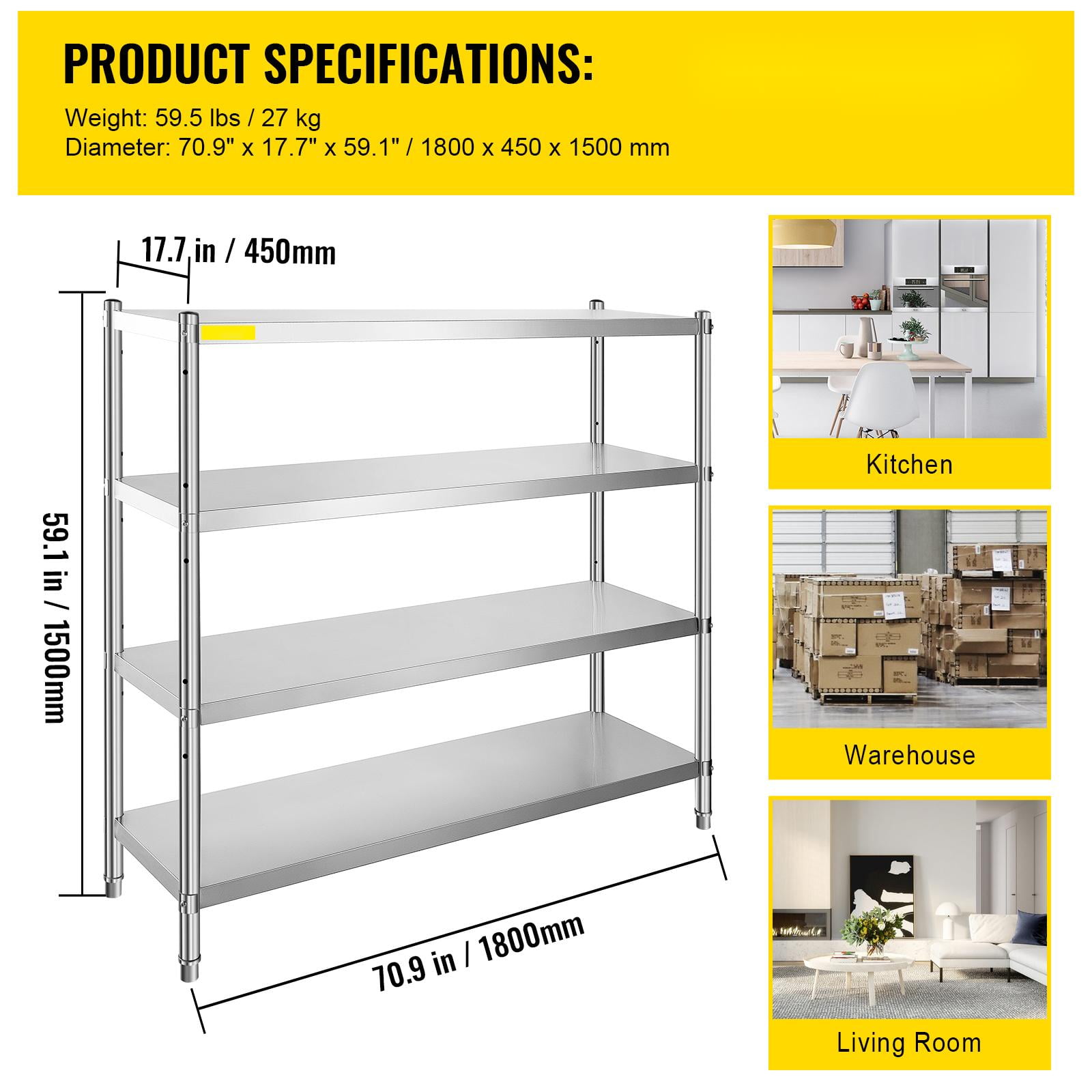 Product Description 4-Tier Stainless Steel Shelf 1320 lbs Total Capacity & Adjustable Shelf Height & Easy to Assemble Specifications Model: VV-SSS-4-72 Material: Stainless Steel Size: 70.9″ x 17.7″ x 59.1″/ 1800 x 450 x 1500 mm Load Capacity: 1320 lbs Weight: 59.5 lbs / 27 kg Adjustable Feet Height: 0.79″ / 2 cm Column Width: 1.5″ / 38 mm Tier Thickness: 1.6″ / 40 mm Shelf Type: 4 Tiers Room Type: Any Room Shape: Rectangular Package Content 1 x 4-Tier Stainless Steel Shelf 8 x Columns 4 x Tiers 16 x Spacers 6 Sets of Screws and Nuts 1 x Wrench