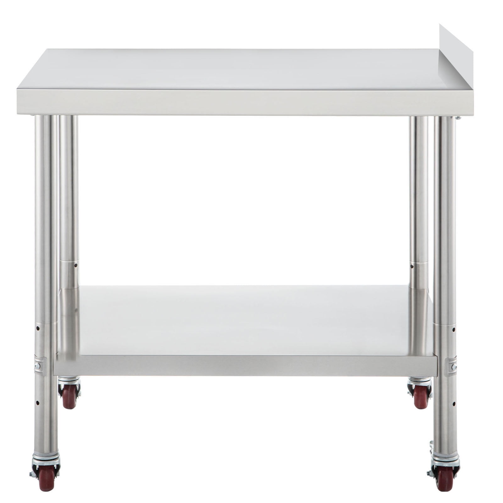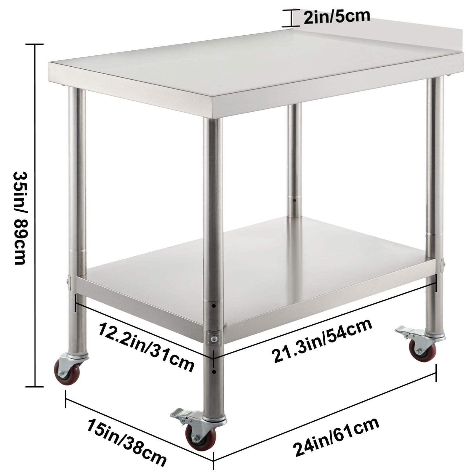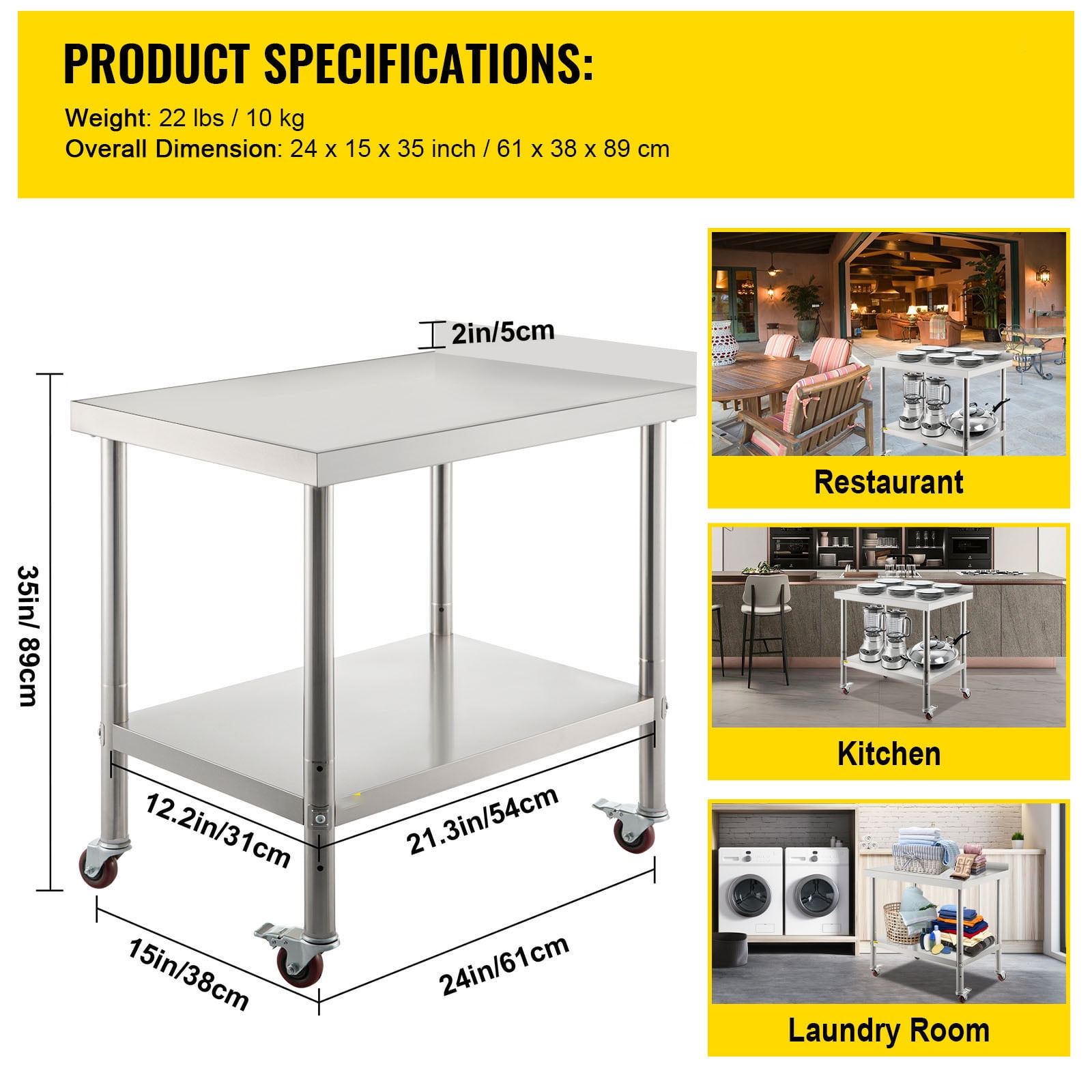Heavy-Duty Work Table: Our stainless steel prep table has an undershelf for additional storage space. The 24 x 15 x 2.2-inch top shelf can load max. 330lbs items and the 21.3 x 12.2 x 1.8-inch undershelf can load max. 110 lbs items. It’s easy for you to store all of your most-used supplies. The 1.9-inch thickened columns feature a triangle support design, which improves the durability and stability of this table. Adjustable Undershelf: The undershelf has 3 levels for height adjustment (the distances between 2 shelves: 16.9 / 20.1 / 23.2 in) with a 3-inch interval. You can raise or lower it to accommodate the size of storage items. Rock Solid Material: Our kitchen work table is made of 201 stainless steel material, ensuring that it’s rust-proof, corrosion-proof, and easy to clean. With the wire-drawing surface, this table offers a beautiful appearance, is not easy to scratch, and hardly leaves water stains. The 2-inch high backsplash is equipped to keep the items from falling. The smooth edges can keep your hand from getting hurt. Besides, the 4 flexible casters (2 with brakes) are well-designed for moving conveniently. Easy Installation: Due to its simple structure and lightweight components, our food prep table can be assembled quickly and effortlessly. Install the four table legs into the pre-drilled holes, assemble the undershelf into the columns, tighten all parts with screws, put the casters into the legs, and it’s ready to use. You can finish the assembly on your own within minutes through the instructions in the manual. Multiple Application: This kitchen prep table can be used in the kitchen, laundry room, garage, restaurant, hotel, etc. In addition to storing items, you can also use it to chop vegetables, knead the dough, cut meat, and do other related things in the kitchen.