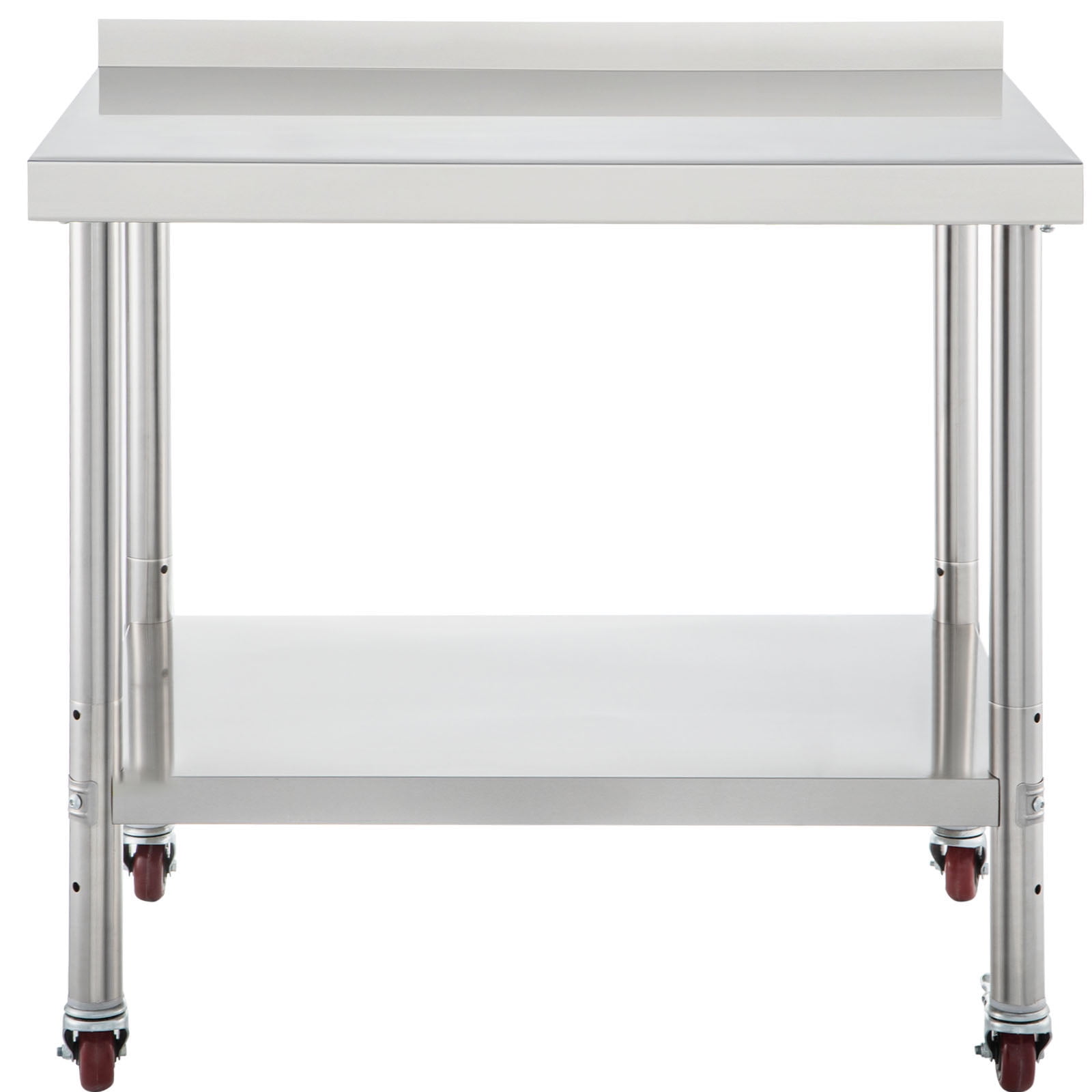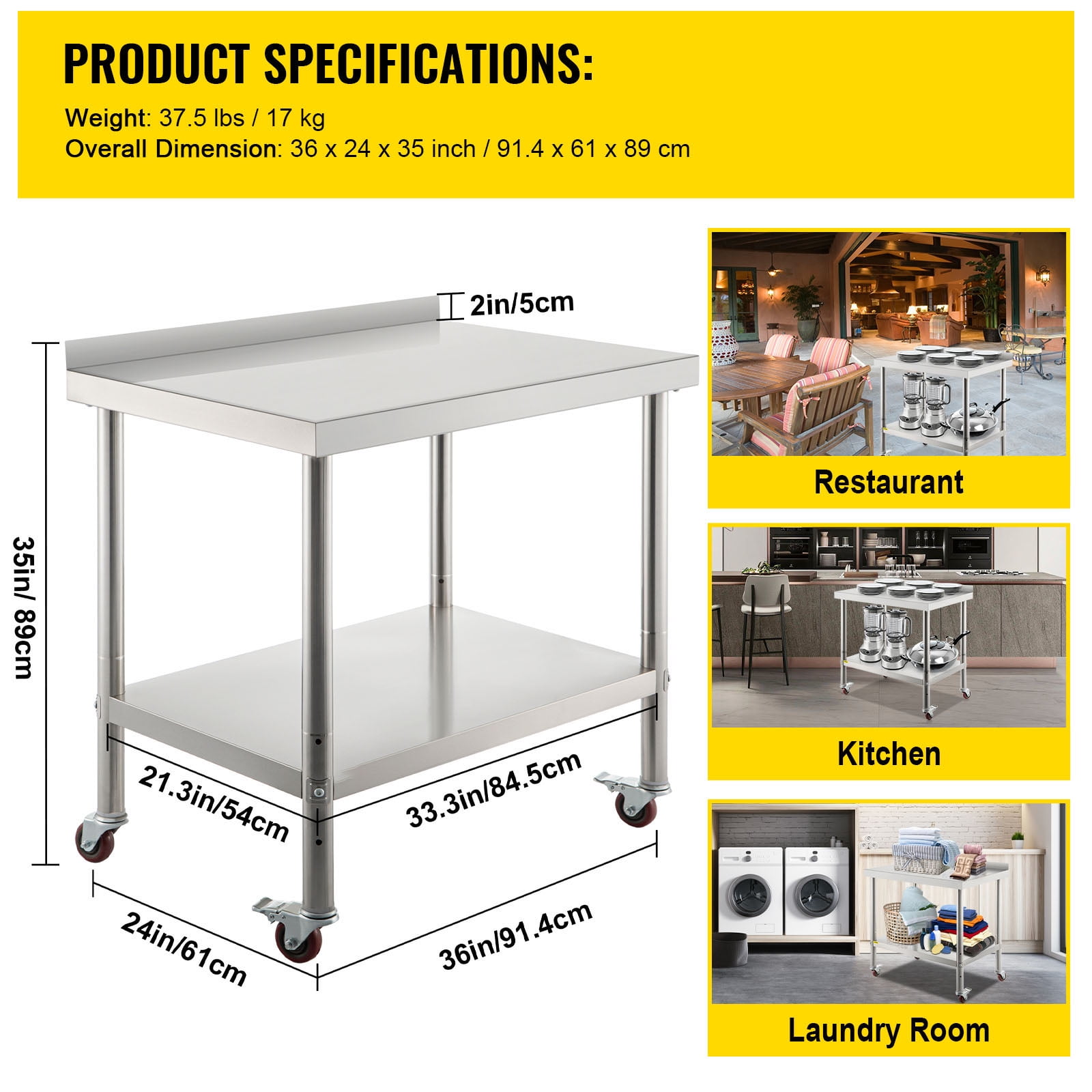 Product Description Stainless Steel Kitchen Prep Table Our commercial food prep table is made of stainless steel with wire-drawing treatment, sturdy and durable to use. Its thickened legs and tabletops can hold up to 440lbs of heavy items. The adjustable undershelf holds various sized objects. In addition, it contains a backsplash and 4 casters for convenient operation. This work table is a professional kitchen storage tool and work assistant that saves you time and space. Specifications Model: VV-SSWT-BJL-2436 Material: Stainless Steel Top Shelf Load Capacity: 330 lbs / 150 kg Under Shelf Load Capacity: 110 lbs / 50 kg Item Dimension: 36 x 24 x 35 inch / 91.4 x 61 x 89 cm Undershelf Size: 33.3 x 21.3 inch / 84.5 x 54 cm Distance Between Two Shelves: 16.9-20.1-23.2 inch / 43-51-59 cm Backsplash Height: 2 inch / 5 cm Table Legs Diameter: 1.9 inch / 48 mm Item Weight: 37.5 lbs / 17 kg Package Content 1 x Stainless Steel Prep Table 1 x Pack of Accessories