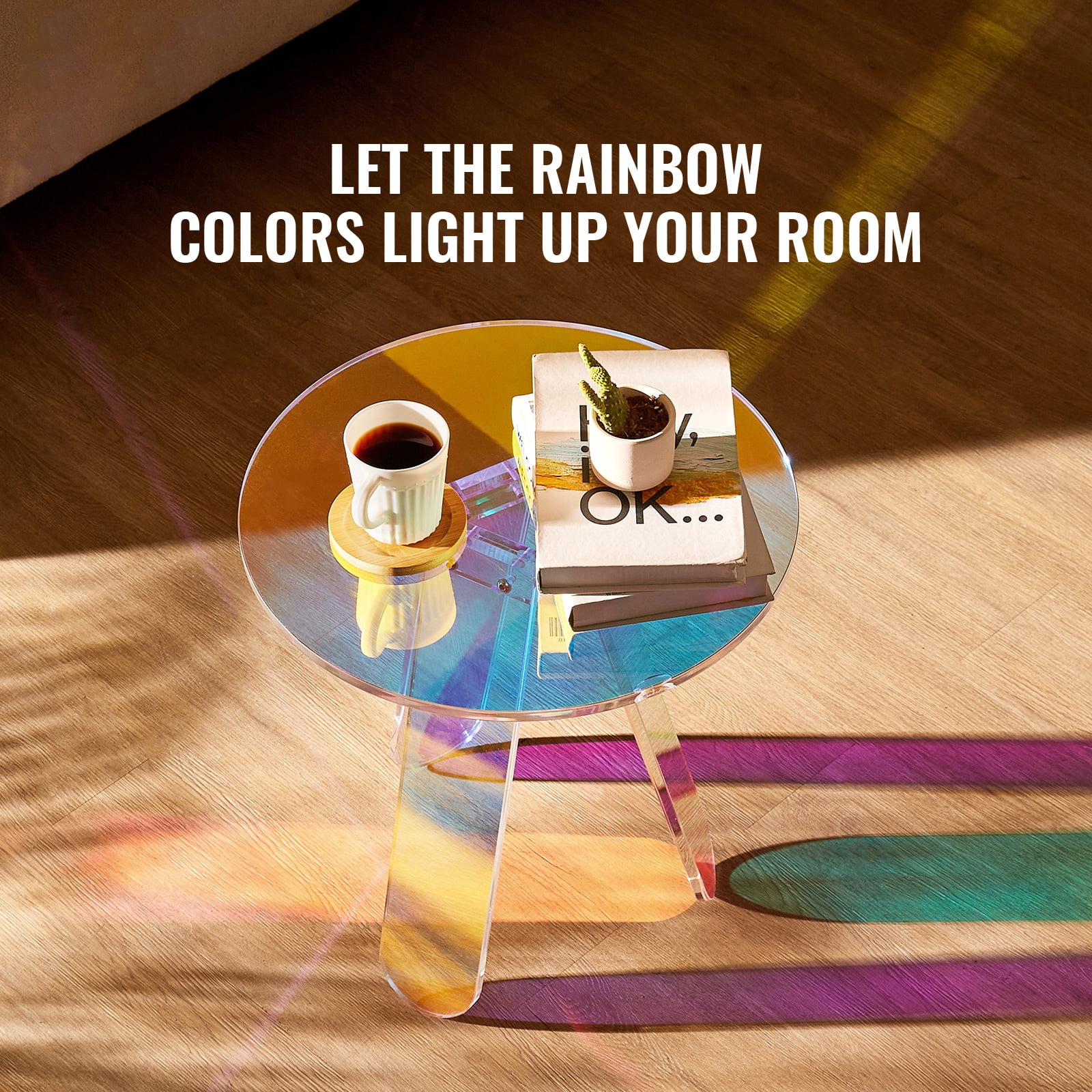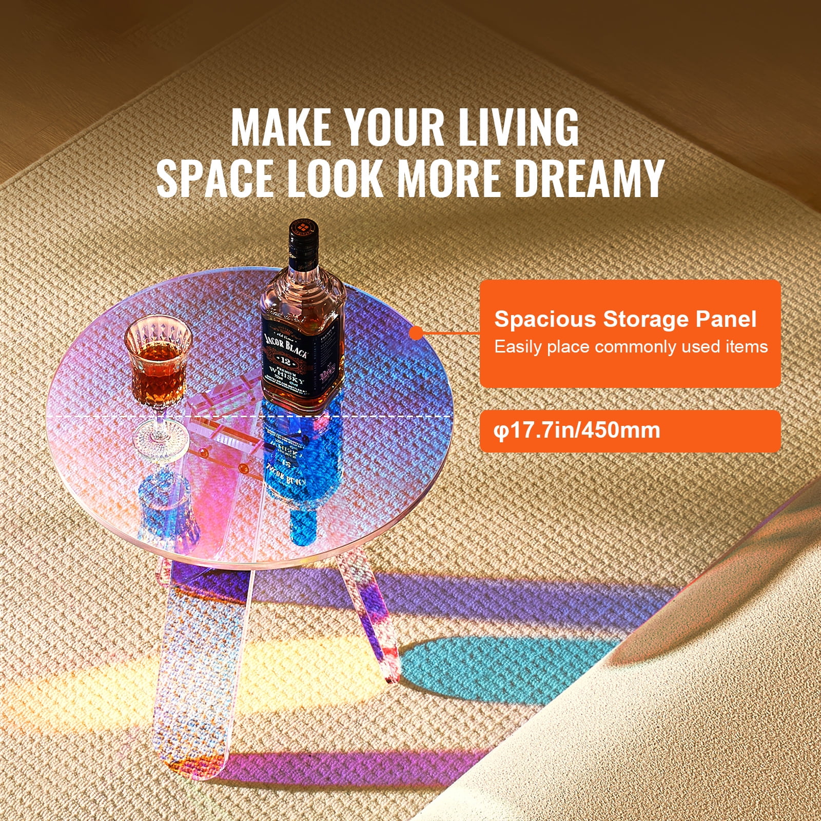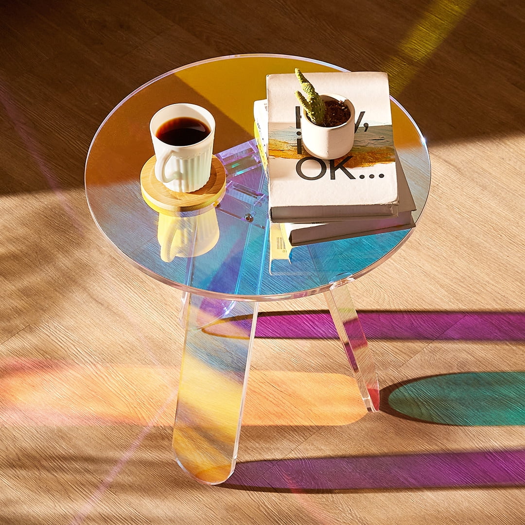 BENTISM Storage Round Acrylic Coffee Table with 3 Foot pads, Multicolor Gorgeous Dreamlike Design: Experience the attractive allure of our round iridescent side table as it refracts different colors of light based on angles and observer position, creating a dreamy ambiance in your room Expanded Storage Space: with a larger tabletop measuring φ17 7 inches, our acrylic end table provides ample storage for small items and serves various functions such as displaying decorations and functioning as a workstation The smooth edges significantly reduce the risk of daily bumps and injuries Natural Acrylic Material: Crafted from 12 mm thick acrylic material, our rainbow acrylic coffee table offers superior impact resistance compared to ordinary tempered glass, ensuring durability and peace of mind (Note: Remove the protective film after installation Avoid using alcohol and prolonged outdoor exposure ) Easy Assembly: Includes a hex wrench and instructions for assembly in just 15 minutes Supported by three legs forming a triangle, the colorful end table boasts a weight capacity of up to 22 lbs The table feet are equipped with slip-proof pads for enhanced stability and to prevent floor scratches Versatile Use: The rainbow side table features a crystal-like gloss and transparency, effortlessly matching various home decor styles Use it by the sofa, bed, or in a balcony corner, providing convenience whenever you need a surface for your belongings