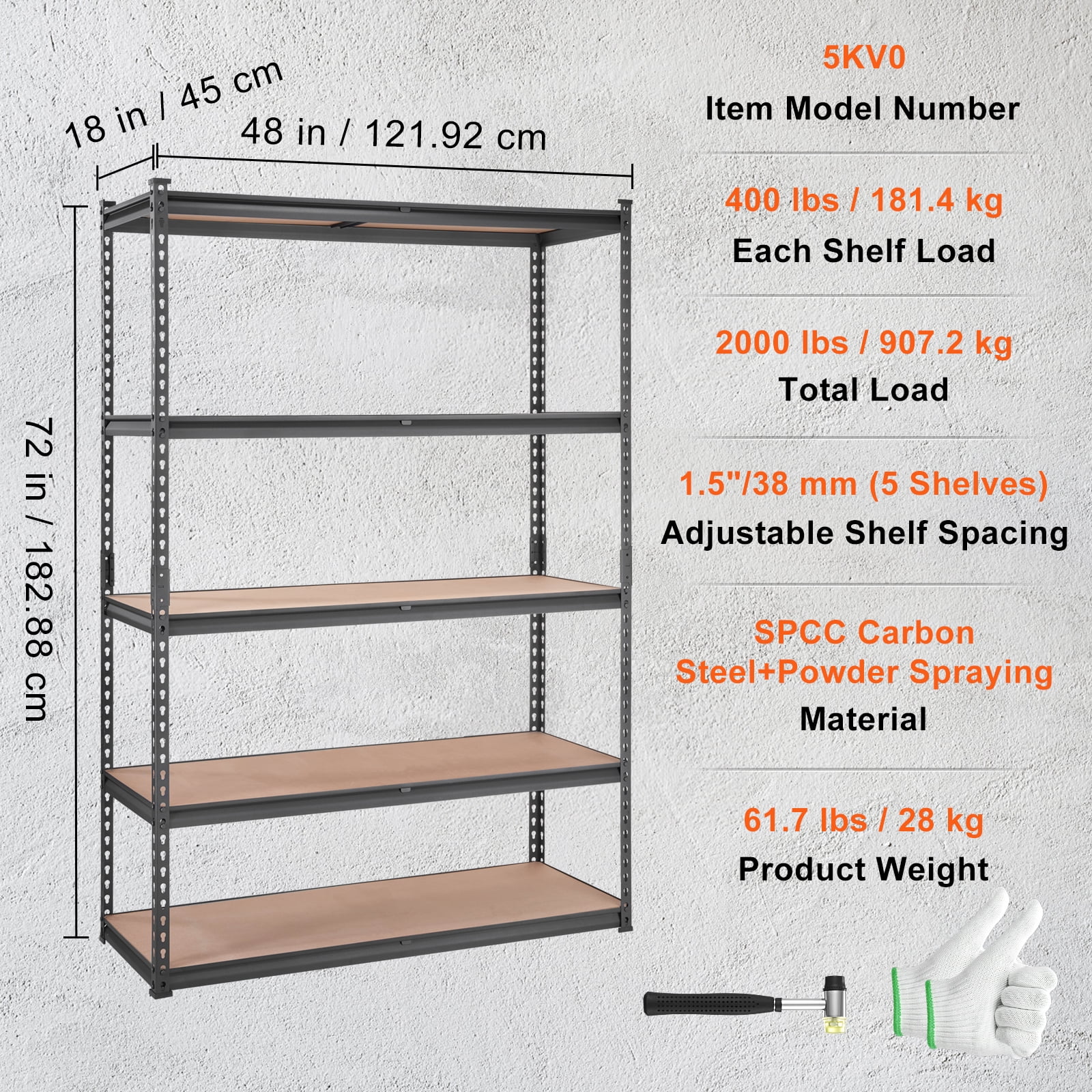 Product Description BENTISM Storage Shelving Unit – A Powerhouse of Strength Take a load off! Each heavy duty shelf is designed to bear up to a whopping 400 pounds. It keeps everything steady and wobble-free. Plus, it’s equipped with reinforcements for that extra peace of mind. Strong Load & Neat Storage Transform your cluttered garage into a neat and organized space with our metal shelf rack. With a load capacity of 400 lbs per shelf and 2000 lbs in total, it ensures ample storage for all your items. Sleek and Scratch-Resistant Coating Our heavy duty storage shelf comes dressed in a stylish powder coating that doesn’t just look good but fights off water and scratches. It promises to stay sleek and new, refusing to peel or oxidize, even after a long haul. No-Fuss Assembly Say goodbye to the struggle with bolts. Our heavy duty shelving comes with all necessary parts, a pair of handy gloves, a rubber hammer, and clear instructions. It’s a breeze to set up! Adjustable Shelves Embrace the freedom to adjust and adapt. The metal shelves are adjustable and can be converted into two forms, opening up a world of flexible storage. It’s about making the most of your space. One Unit, Multiple Scenarios This metal storage rack can shrink down to a compact size for simple storage and transport. Whether you’re sprucing up a kitchen, a living room, or even a commercial space like a warehouse or an office, it fits right in. Sturdy Material Crafted with heavy-duty SPCC carbon steel, our metal storage shelf is as sturdy as they come. It’s designed to keep its shape and strength no matter how long you use it. Specifications Item Model Number: 5KV0 Each Shelf Load: 400 lbs/181.4 kg Total Load: 2000 lbs/907.2 kg Adjustable Shelf Spacing: 1.5″/38 mm (5 Shelves) Material: SPCC Carbon Steel+MDF Boards Product Weight: 61.7 lbs/28 kg Product Size (L x W x H): 48″ x 18″ x 72″/121.92 x 45 x 182.88 cm Package Content 1 x Storage Shelving Unit 1 x Rubber Hammer 16 x Rubber Pads 1 x Pair of Gloves 2 x Anti-Tipping Brackets 4 x Pole Connection Blocks
