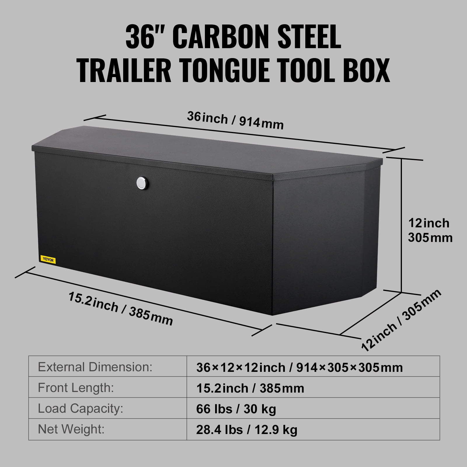 Product Description 29 x 16.2 x 18 inch Trailer Tongue Box BENTISM trailer tongue tool box is a compact storage solution designed to be mounted on the tongue of a trailer. It provides convenient access to essential tools and equipment while on the road. Secure storage for items like batteries, tools, and other small tools. An essential accessory for trailer owners and professionals on the go! Steel Trailer Tool Box Crafted from thickened steel, our trailer tongue box ensures exceptional strength and load capacity without any risk of deformation. The box is undergoing a double-sided dusting process, making it highly resistant to rust and corrosion. You can rely on its long-lasting durability, providing you with reliable service for years to come. Ample Storage Space The trailer tongue tool box, with spacious space, allows you to store batteries, tools, outdoor equipment, and other essential items. Say goodbye to scattered belongings and the hassle of rummaging around. This box is an indispensable companion for flat trailers and RVs. Secure Opening and Closing The trailer tongue box is equipped with a steel gas strut, allowing for a convenient 110° opening angle. This feature enables easy access and organization of your articles. Harsh Weather Resistant Experience ultimate rain and snow protection with our trailer tongue box. Featuring an over-lapping door and an extra-wide sealing strip ensures a tight seal, effectively shielding against rain and snow intrusion. Say goodbye to wet and rusted items, as our box keeps your belongings dry, clean, and well-protected. Excellent Burglar-proof Performance The tongue storage tool box with stainless steel solid lock device and 2 exclusive keys. Whether you’re using it outdoors or on the road, you won’t have to worry about the loss of your valuable items. Easy Installation You can easily drill holes and assemble bolts and screws by yourself, ensuring a secure and sturdy installation. We recommend measuring the size of your trailer before making a purchase to select a tool box of the appropriate size. Specifications Item Model Number: XSJ-TB19-1 External Dimension: 36×12×12 inch/914×305×305 mm Front Length: 15.2 inch/385 mm Load Capacity: 66 lbs/30 kg Net Weight: 28.4 lbs/12.9 kg Package Content 1 x Trailer Tongue Tool Box 2 x Keys