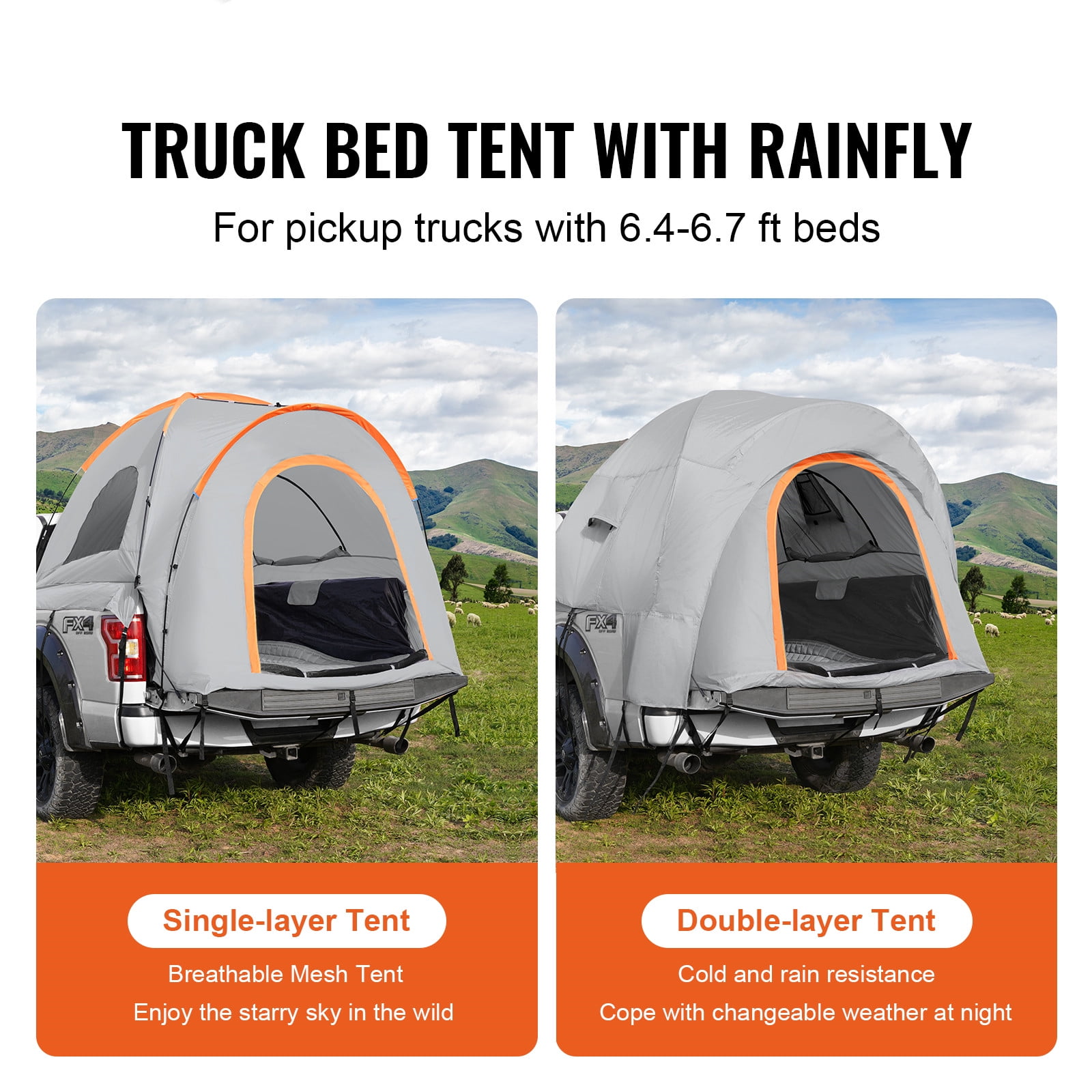 VEVOR Truck Tent 6.4′-6.7′ Waterproof Spacious Pickup Truck Bed Tent with Rainfly Carry Bag for Camping Traveling Outdoor