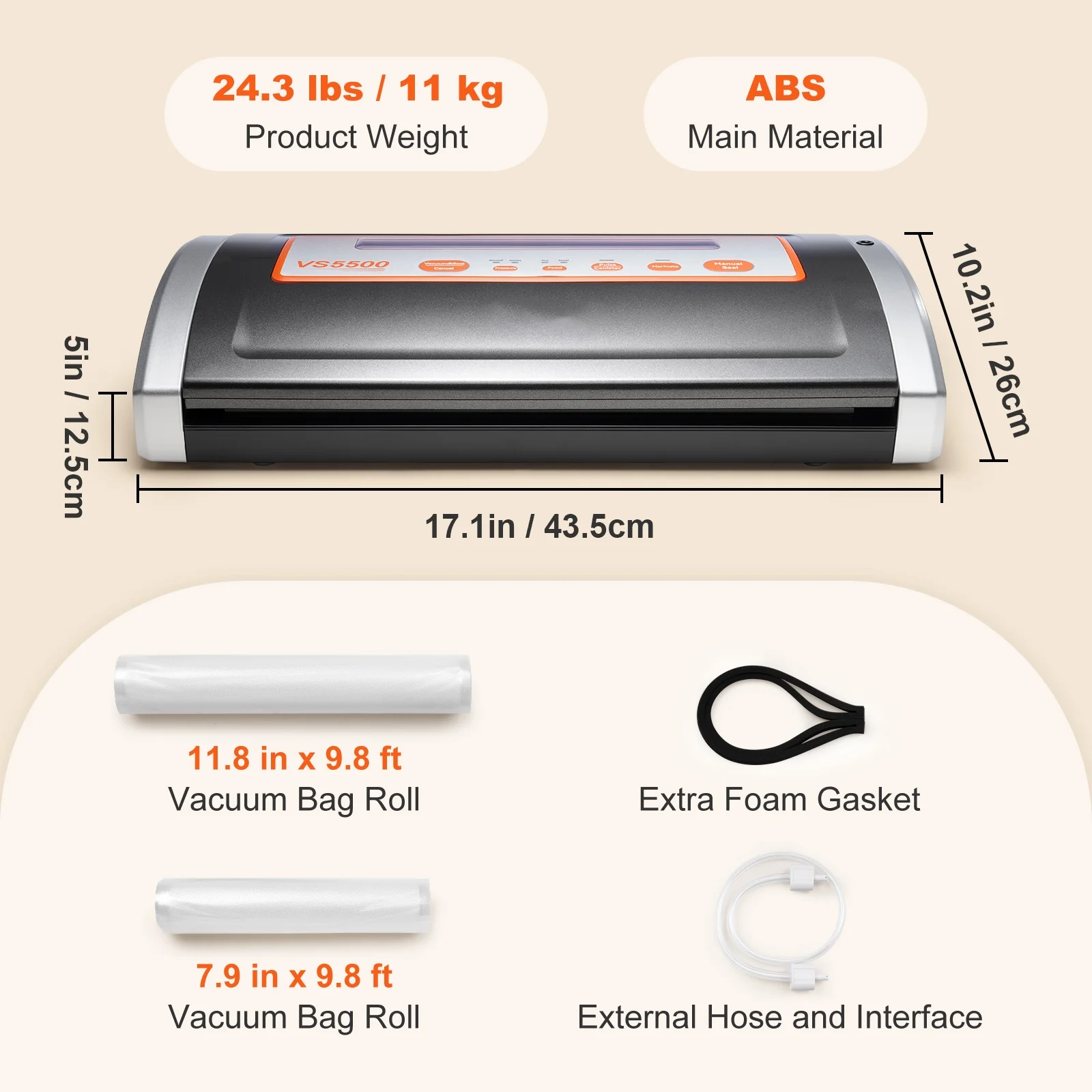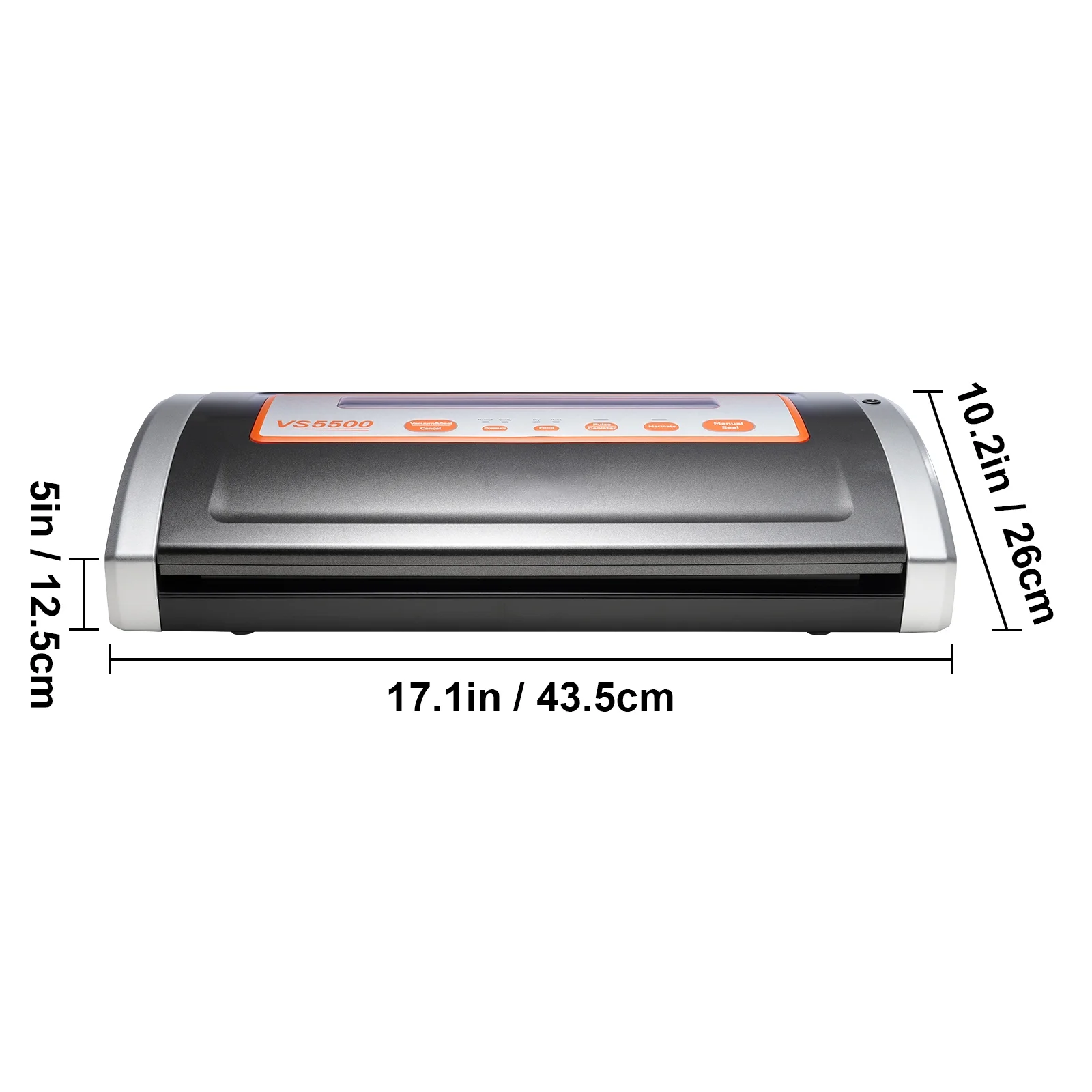 Product Description Vacuum Sealer Machine Introducing vacuum sealer machine! It will become your ultimate kitchen companion that keeps your food fresh and delicious for longer! This powerful machine is a must-have. With a specially designed cooling system, it’s built to handle continuous and repetitive use without overheating. Plus, the multifunctional panel lets you customize the sealing process for different types of food. Say goodbye to freezer burn and hello to perfectly preserved food ! Cut with Ease You can store the sealing bag roll inside the machine and use the built-in cutter to make a customized bag in seconds. It fits up to 11.8” width vacuum sealer bags and rolls. Multifunctional Panel The food vacuum sealer is easy to operate with the panel and button. You can just get what you want through a gentle touch and the selected buttons. Sealed to Win Thanks to the high-performance pump and large sealing size, our vacuum sealer machine can effectively extend the storage period of food. Premium External Vacuum System This vacuum sealer with jar attachment can also be used to vacuum canisters and marinate bowls, aside from using it as a vacuum bag sealer(canisters or bowls not included). A Complete Kit Two bag rolls are included to get you started, one 7.9 in x 9.8 ft roll, and one 11.8 in x 9.8 ft roll. An external hose with an interface and an extra foam gasket are also included. Versatile Use Our food sealer is suitable for meat, seafood, fruits, vegetables, nuts, bread, jars, wine bottles, etc. It is an essential tool for both home and commercial kitchens. Specifications Model: VS5500 Main Material: ABS Power: 130W Vacuum Suction: 80 Kpa Sealing Length: 11.8″ / 30 cm Sealing Width: 0.12″ / 2.5 mm Product Weight: 24.3 lbs / 11 kg Package Content 1 x Vacuum Sealer 1 x External Hose and Interface 1 x 7.9 in x 9.8 ft Vacuum Bag Roll 1 x 11.8 in x 9.8 ft Vacuum Bag Roll 1 x Extra Foam Gasket 1 x User Manual