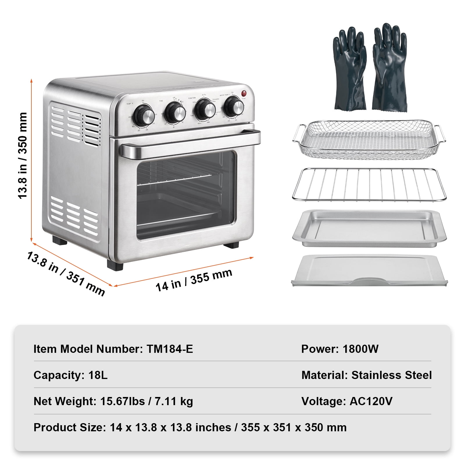 Product Description Multifunctional Convection Oven With 7 function modes of Air Fry/Convection Bake/Convection Broil/Bake/Warm/Toast/Grill, you can easily cook all kinds of food. Excellent Cooking Results With 1800W of power, our toaster oven air fryer heats up quickly and evenly, resulting in bright and attractive colors and irresistible flavors. You can now enjoy restaurant-quality meals from the comfort of your own home! Easy Temperature Control Our knob-style control design lets you adjust the temperature between 200-450℉, with each 50℉ as one gear. Plus, there’s a 60-minute timer that can be adjusted every 10 minutes. It’s easy to use and operate. 18L Large Capacity Our family-sized oven has an 18L capacity, making it perfect for daily cooking and family gatherings. Bake up to 6 slices of bread, 3 pounds of chicken wings, a 10-inch pizza, or a 4-pound chicken with ease. Effortless to Clean The stainless steel exterior and non-stick interior make cleaning up a breeze. Wipe away oil and dirty with ease, and your oven will be clean and shiny in no time. Full Set of Accessories Our convection toaster oven comes with an electroplated baking rack, an aluminum baking tray, a galvanized sheet crumb tray, an electroplated frying basket, a pair of heat-resistant gloves, and a user manual. These accessories make it easy to cook all kinds of foods with ease. User-Friendly Design Our smart oven features anti-scald handles and heat-resistant gloves, making it easy to handle hot food safely. The large panel window provides a clear view of the cooking process, so you can monitor your food easily. Specifications Item Model Number: TM184-E Voltage: AC120V Power: 1800W Capacity: 18L Material: Stainless Steel Product Weight: 15.67lbs / 7.11 kg Product Size: 14 x 13.8 x 13.8 inches / 355 x 351 x 350 mm Package Content 1 x Convection Oven 1 x Electroplated Baking Rack 1 x Aluminum Baking Tray 1 x Galvanized Sheet Crumb Tray 1 x Electroplated Frying Basket 1 x Heat-resistant Gloves 1 x User Manual