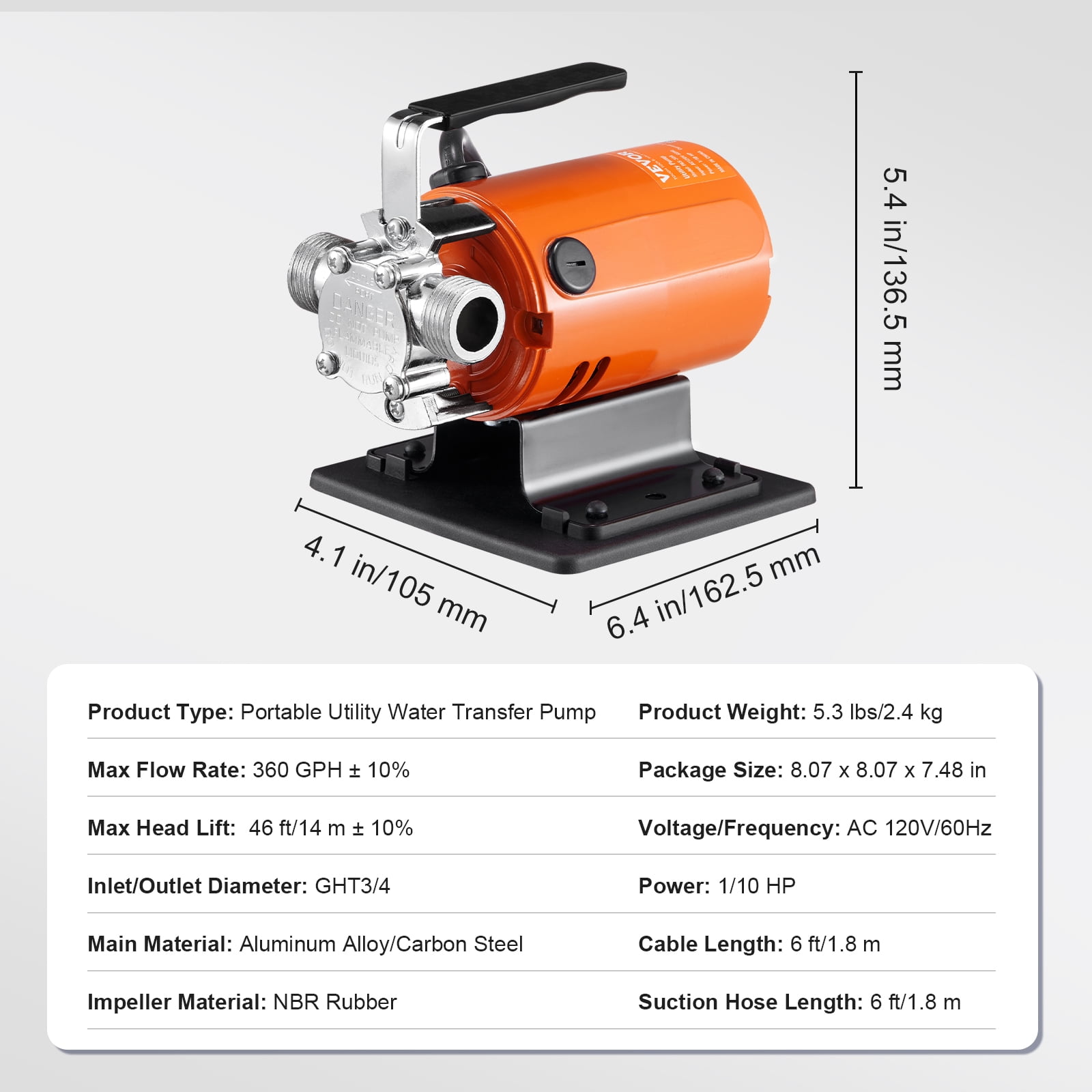 Product Description Portable Utility Water Transfer Pump Say goodbye to small water flow with this BENTISM water transfer pump–a true game-changer! The electric utility pump provides a 360 GPH flow rate and 46 ft head lift. It is ideal for irrigation, pool water circulation, indoor water drainage, etc., and is a must-have for every family and rancher. Easy-to-Carry Handle Our water transfer pump has a portable ergonomic handle with a non-slip shell. It fits better to your fingers and is more comfortable to hold. Carbon Brush Hole This water transfer utility pump comes with a carbon brush hole and two carbon brushes for easy replacement. No additional purchase is required. 6 ft/1.8 m Power Cord The portable electric utility pump is equipped with a 6 ft/1.8 m power cord and is easy to use with a 120V/60Hz AC supply. It is perfect for household and utility applications. With a powerful 1/10 HP motor, the transfer water pump provides a large 360 GPH flow and 46 ft head lift. No water transfer problem will be a challenge for you. The non-slip base keeps your electric utility pump stable and secure in place while in use. You don’t have to worry about disturbing noises. The large heat dissipation vents and aluminum alloy body enable the transfer pump to discharge heat quickly. It will automatically stop when the motor overheats. Specifications Item Model Number: PAS-30A Power: 1/10 HP Voltage: AC 120V/60Hz Max Flow Rate: 360 GPH Max Head Lift: 46 ft/14 m Inlet/Outlet Diameter: GHT3/4 Main Material: Aluminum Alloy/Carbon Steel Impeller Material: NBR Rubber Motor Speed: 6800 RPM Cable Length: 6 ft/1.8 m Suction Hose Length: 6 ft/1.8 m Product Weight: 5.3 lbs/2.4 kg Product Size (L x W x H): 6.4″ x 4.1″ x 5.4″/162.5 x 105 x 136.5 mm Package Content 1 x Water Transfer Pump 1 x 6 ft Suction Hose 2 x Carbon Brushes 1 x Impeller 1 x Water Suction Strainer