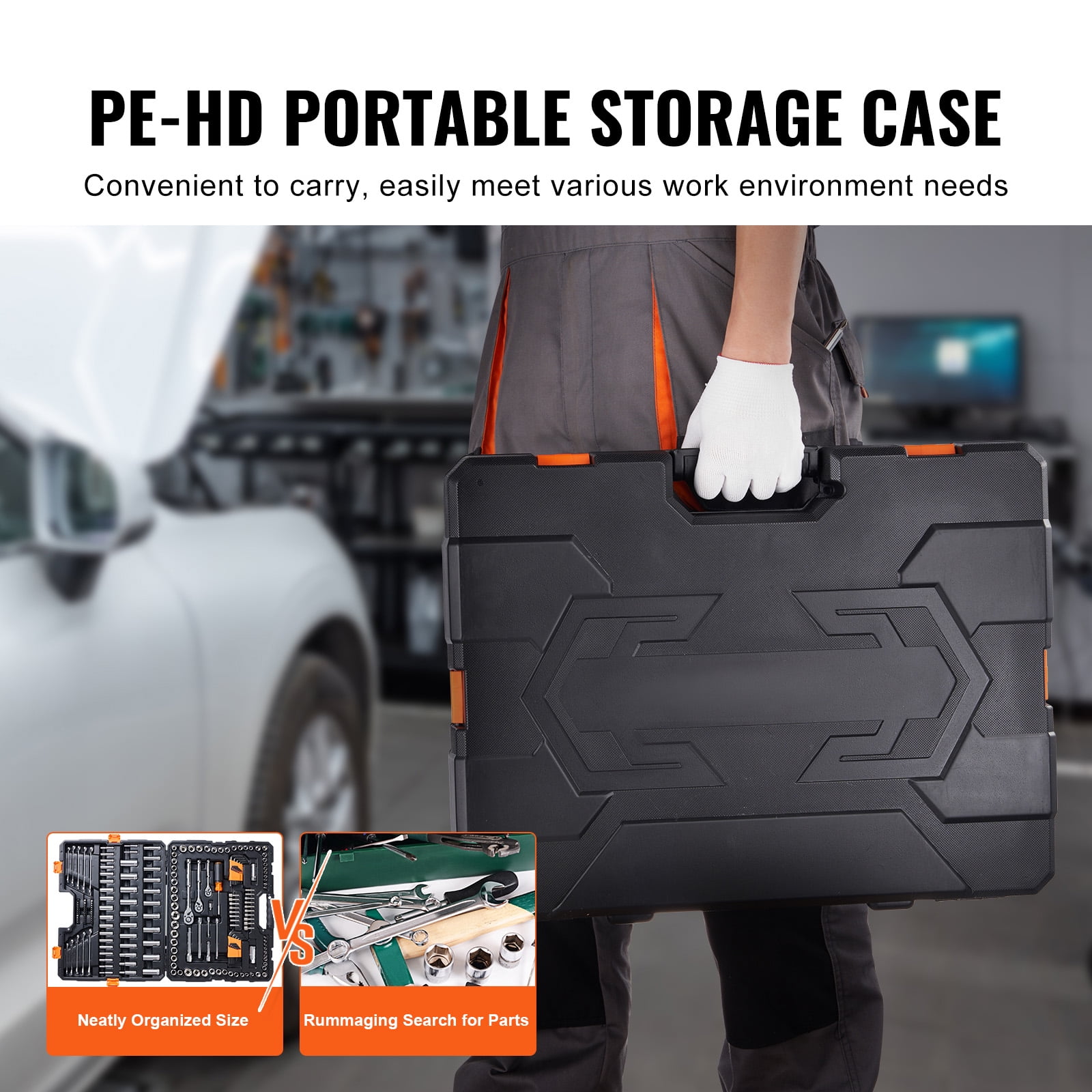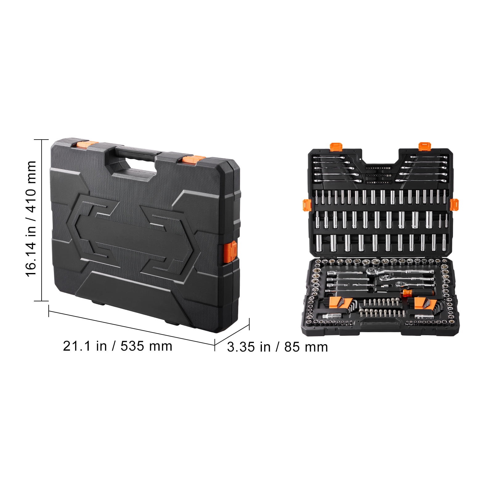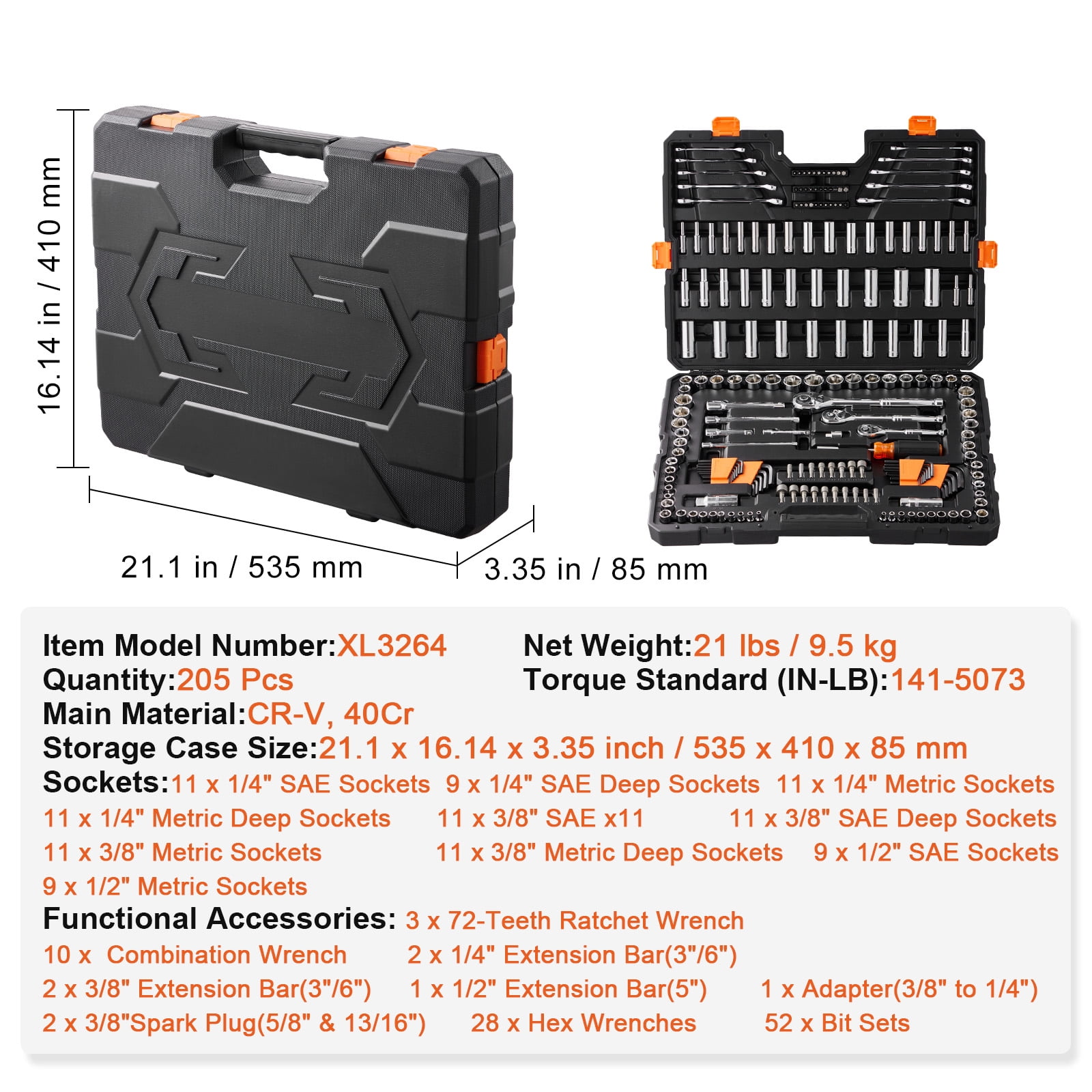 Product Description Your toolkit for conquering tasks with confidence and ease! Our mechanics tool set boasts CR-V chrome vanadium construction, ensuring it’s not just durable but also rust and wear-resistant. It’s a toolbox that’s ready for action, whether you’re fixing things around the house or taking on pro-level repairs. Tackle high torque with confidence, and enjoy the convenience of handy attachments. Don’t just get the job done – get it done right with our ultimate toolkit! Combination of Ratchet and Socket Our mechanics tool set adopts CR-V chrome vanadium polishing technology for long-term use. The knurling markings is durable and wear-resistant. The unique circular anti-slip groove design prevents slipping under high torque, making your work more efficient. Professional-Grade 205-Piece Set This mechanic tool kit is precisely designed for easy identification of each socket size. Accurate labeling ensures clear visibility of every size. Tailored to meet work demands, whether it’s home repairs or professional projects. It can save time, making your work more efficient and easier. Withstand 141 to 5073 in-lb High Torque Our tool set tackles high-intensity tasks effortlessly. It ensures prolonged effectiveness with top-notch materials. Whether automotive repairs or home renovations, this socket set is your dependable assistant. Suitable for Various Testing and Repair Work Our socket set is versatile for various scenarios, from home appliance maintenance to automotive repair shops and professional equipment establishments (factory, enterprise, etc.). Complete Accessories In the compact and portable toolbox, you’ll find accessories that cater to most of your needs. The manual installation provides efficient work experience. PE-HD Portable Storage Box The PE-HD portable storage box is your go-anywhere organizer. No more hunting around for the right piece – this toolbox keeps things neat and accessible, ensuring you’re always ready for action. Specifications Item Model Number: XL3264 Quantity: 205 Pcs Storage Case Size: 21.1 x 16.14 x 3.35 inch / 535 x 410 x 85 mm Net Weight: 21 lbs / 9.5 kg Main Material: CR-V, 40Cr Torque Standard: 141-5073 in-lb Package Content 11 x 1/4″ SAE Sockets 9 x 1/4″ SAE Deep Sockets 11 x 1/4″ Metric Sockets 11 x 1/4″ Metric Deep Sockets 11 x 3/8″ SAE x11 11 x 3/8″ SAE Deep Sockets 11 x 3/8″ Metric Sockets 11 x 3/8″ Metric Deep Sockets 9 x 1/2″ SAE Sockets 9 x 1/2″ Metric Sockets 3 x 72-Teeth Ratchet Wrench 10 x Combination Wrench 8 x Accessories 28 x Hex Wrenches 52 x Bit Sets 1 x Storage Case 1 x User Manual
