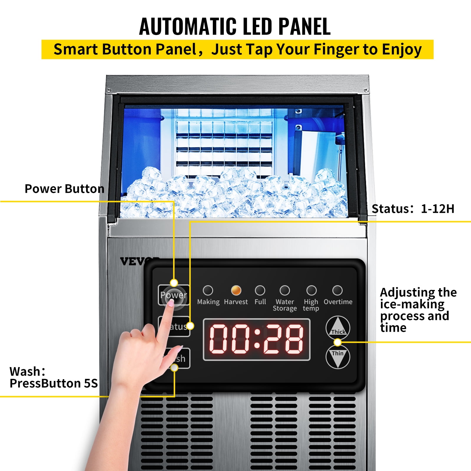 Product Description 110-120LBS/24H Commercial Ice Maker with 33LBS Storage Bin Our upgraded-designed commercial ice maker is equipped with a digital control panel and owns the ability to set the time of making ice in advance. The reservation setting is available for up to 5 hours. You can expect for pleasant and comfortable sleep in the evening. The digital control panel shows the problem when the machine stops making ice and offers reminds when ice is full. Cleaning is also easy to be done with a simple push of the button. Powerful Brand Compressor The 335-watt brand compressor is equipped with strong cooling and second-speed start, serving ice machines longer than other common compressors. It is of low noise and energy-saving. Large Ice Yield & Storage The multi-grid ice-making plate of 5*8PCs can produce about 110-120 lbs of ice cubes (0.9×0.9×0.9-inch) every day. And the storage cabinet can hold up to 33 lbs of ice cubes, perfect for your family gathering. Stainless Steel Material Built with long-lasting stainless steel, the ice machine has a sleek and luxurious appearance. Along with thickened Cyclopentane foam layer and 2.5 mm thick PP injection liner, it has better insulation. Easy-to-Operate Panel The advanced control panel with buttons allows various functions, including ON/OFF, auto-clean, ice thickness adjustment, and DISTURBANCE display (harvest, water storage, high temp, and overtime). Practical Water Filter With a powerful water filter, our ice-making machine can be directly connected to the faucet to convert tap water into drinkable pure water and produce clean, sanitary, and healthy ice cubes. Well-Designed Details With the dazzling blue light, ice cubes are more convenient to observe. The air vents ensure a long lifespan while effectively dissipating heat. 2 inches height nonslip footpads are contributed to strong stability. Specifications Power: 335 W 24H Production: about 110-120 lbs (50-55 kg) Ice Storage Capacity: 33 lbs (15 kg) Ice Plate: 40 PCs (5*8) Ice Cube Size: 0.9″x0.9″x0.9″ (22x22x22 mm) Item Dimensions: 19.6″x14.7″x32.8″ (500x375x835 mm) Item Weight: 60 lbs (27.3 kg) Package Content 1 x Ice Cube Maker Machine 1 x Ice Spoon 1 x Water Filter 1 x Water Inlet 1 x Water Outlet 1 x Instruction Manual