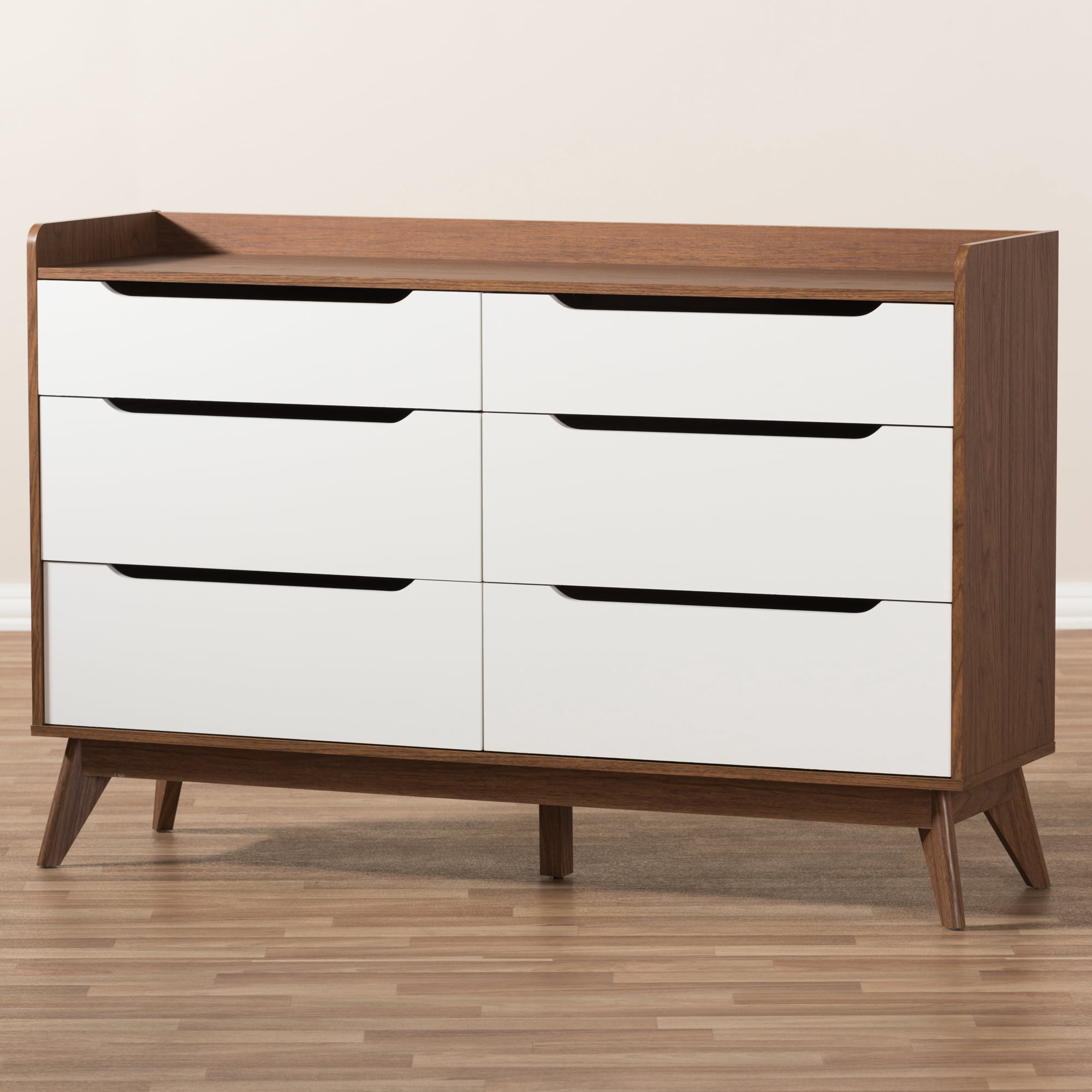 Mid-century 6-drawer chest Finishing: two-tone in white and walnut Smooth drawer runner Six drawers with cut-out handles and a shallow top shelf reveal ample storage space Engineered wood angled legs Assembly required Made in Malaysia