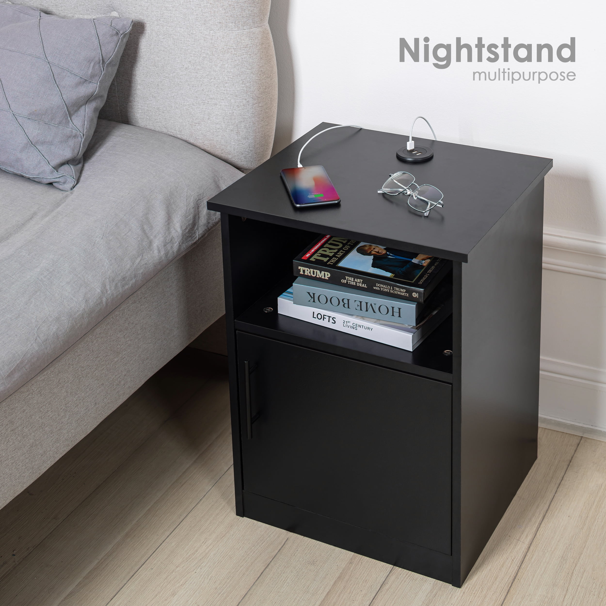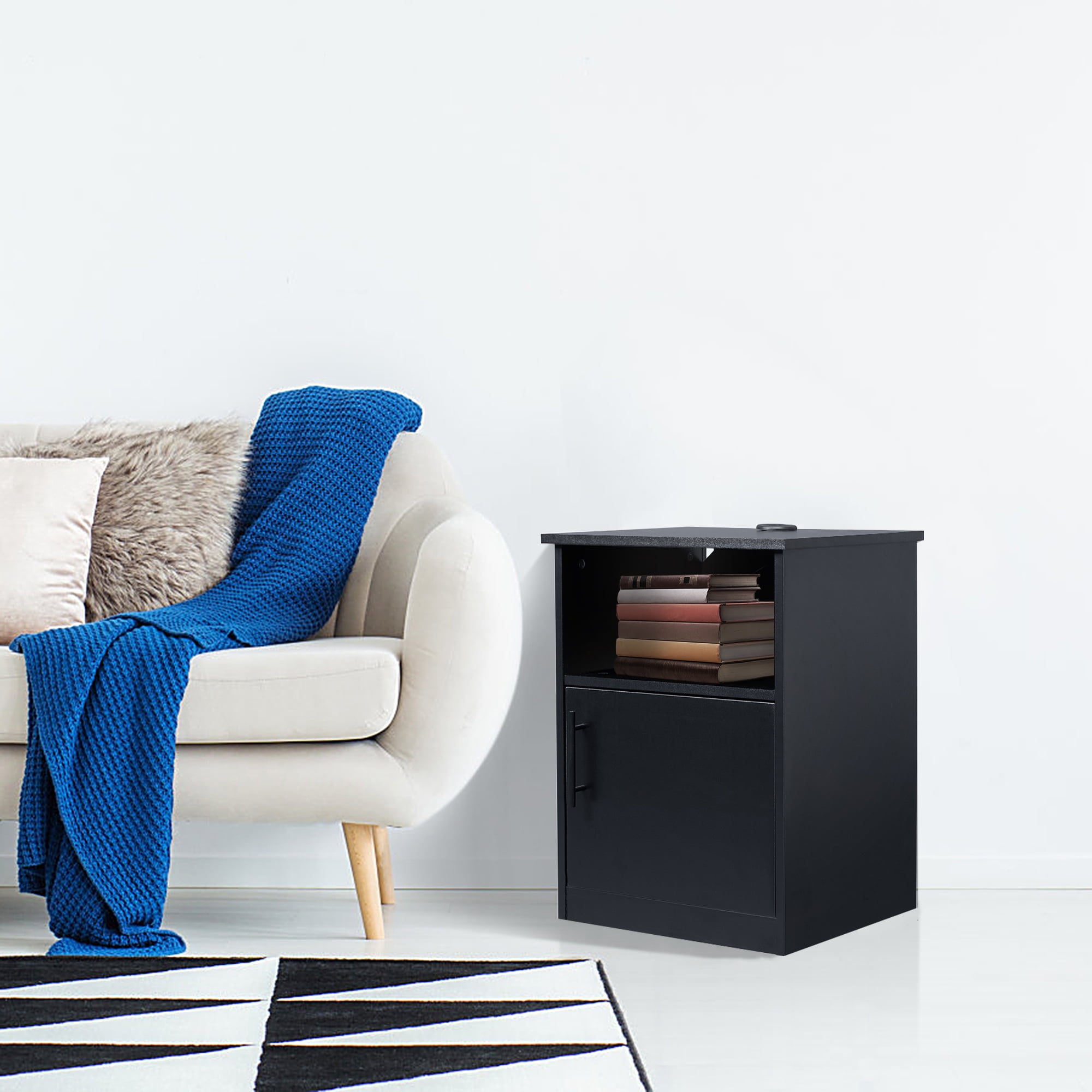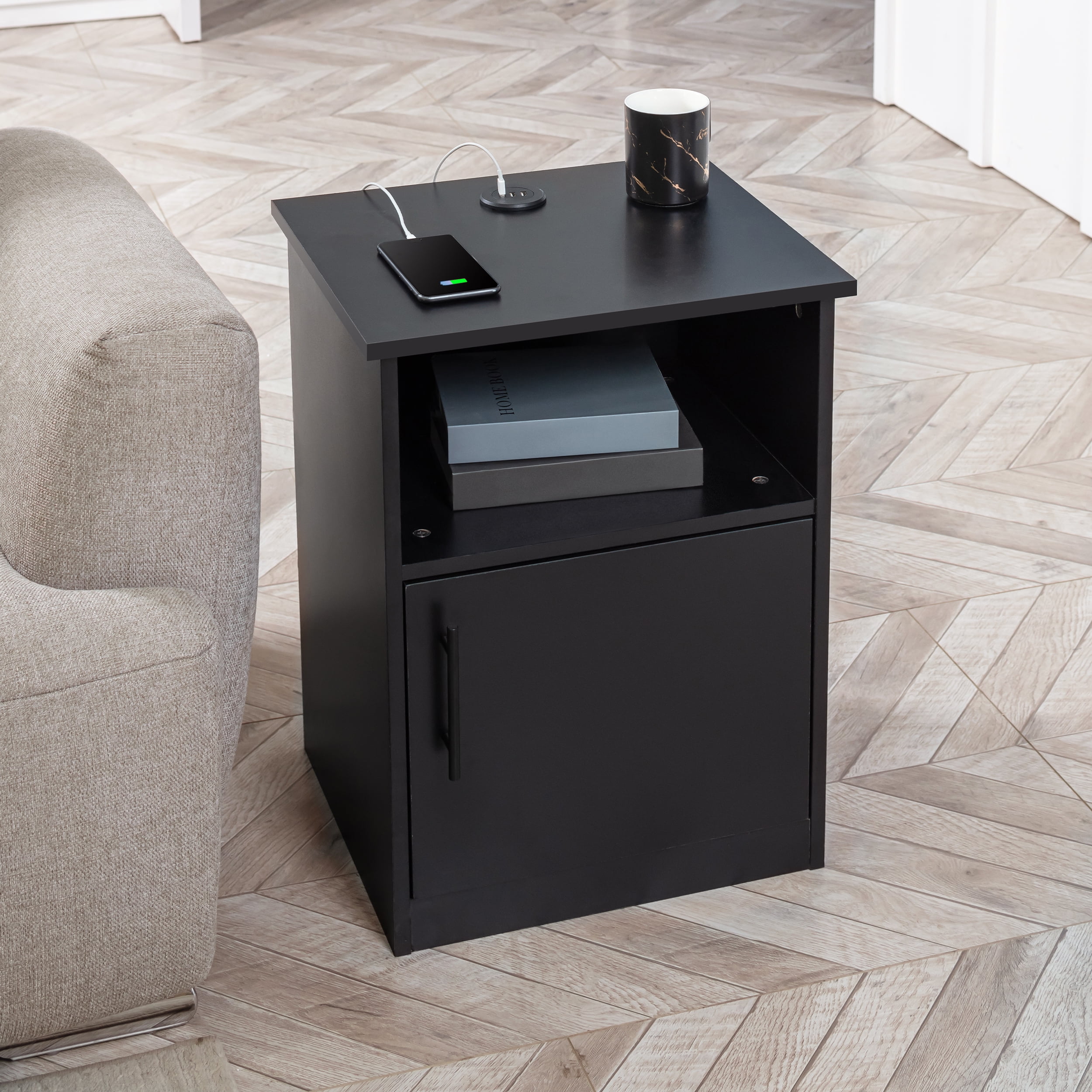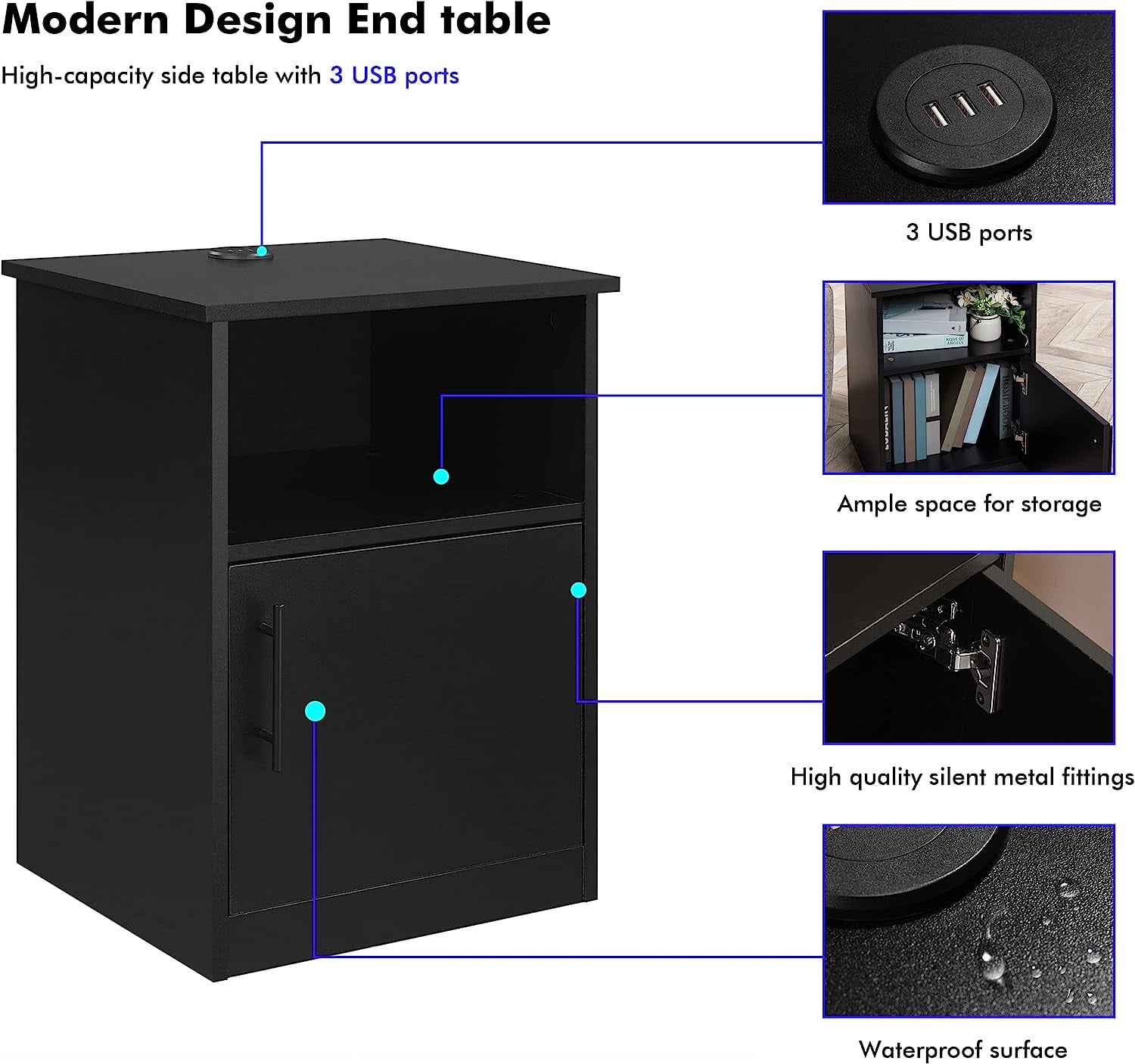 Benton Park Nightstand with Cabinet, 24″H Black Bedside Table with 3 USB Ports for Bedroom Living Room