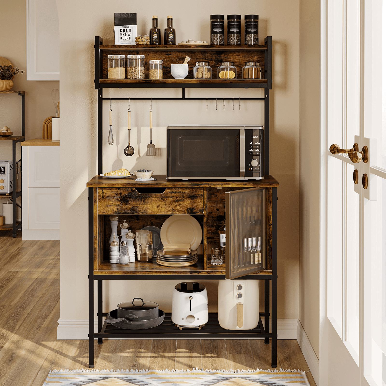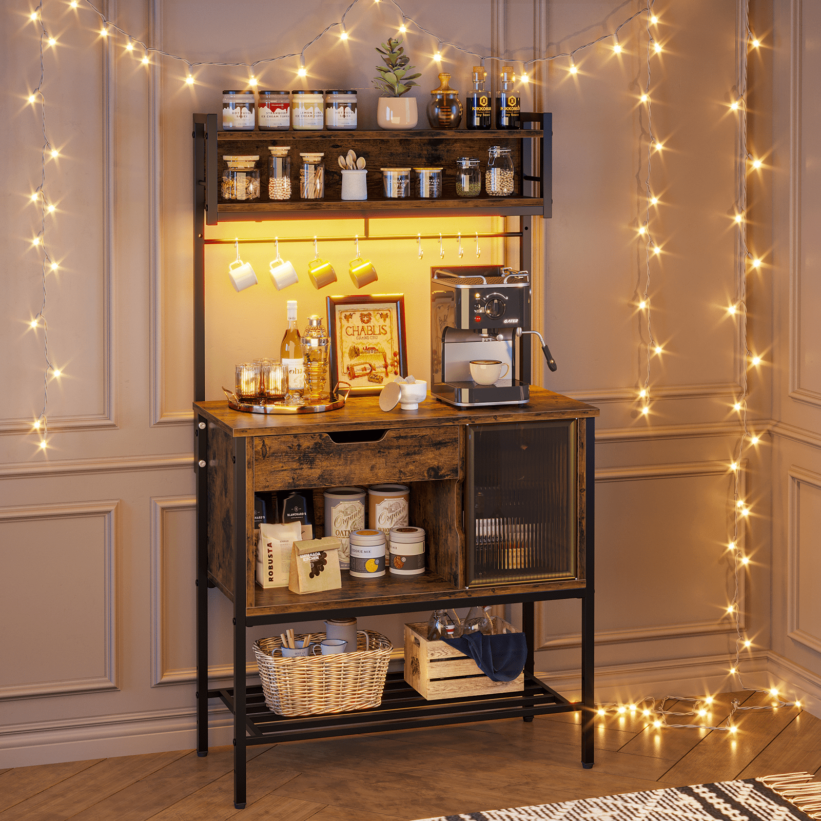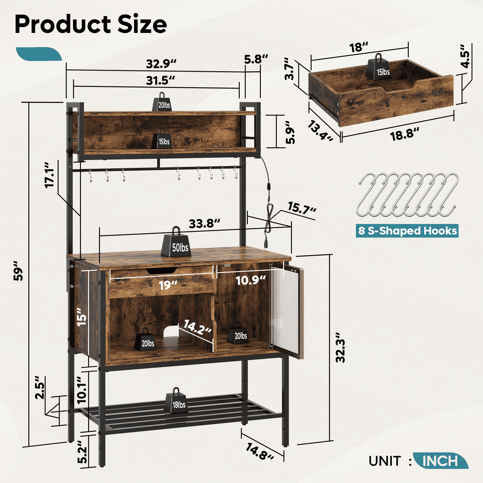 Features [Bakers Rack with LED Lights] – This coffee bar cabinet features built-in LED lighting. Choose from 7 primary colors and 22 display modes to create the perfect ambiance for your home bar area. Enhance the aesthetic of your coffee bar station corner with vibrant colors and mood-enhancing displays. [Ample Storage] – The 6-tier kitchen storage stand is designed with 1 open storage area, 1 drawer, and 1 cabinet, providing ample space for various kitchen appliances. Its bottom shelf comes with a 3-level adjustment feature, allowing for versatile storage possibilities. Additionally, it includes 8 S-shaped hooks, ideal for hanging cooking utensils such as spoons, pans, or whisks, further enhancing its functionality. [High-Quality] – This microwave stand, built with premium P2 particle board and a robust metal frame, ensures both stability and durability. Its four adjustable foot pads offer firm support on carpets or uneven floors, preventing any instability. Capable of holding up to 167 lbs, it serves as a sturdy and long-lasting storage solution for all your necessities. [Special Design] – The drawer is designed with slide rails, ensuring a smooth pull-out operation for an improved user experience. The cabinet is stylishly designed with translucent glass doors which can be adorned with light strips for ambiance. Furthermore, the space under the shelf can house a sweeping robot, promoting a cleaner and more organized living environment. [Easy to Assemble] – Assembling Bestier’s industrial kitchen racks is straightforward with our detailed instructions. Each package includes 1 x Baker’s Rack, 1 x LED Strip, 1 x Accessory Kit, and 1 x Assembly Instruction. We stand by the quality of our products and offer exceptional customer service. Don’t hesitate to reach out if you have any queries, we’re here to assist you. Specifications 8 x S-Hooks 4 x Adjustable Foot Pads 1 x Drawer 1 x Cabinet 1 x 3-Level Adjustment Shelf 1 x LED Strip 58.78″H x 33.86″ W x 16.38″D Max. Load Capacity: 167 lbs Estimated assembly time: 0.5-1 Hour (1-2 People) What’s in the box 1 x Baker’s Rack 1 x Accessory Kit 1 x Assembly Instruction