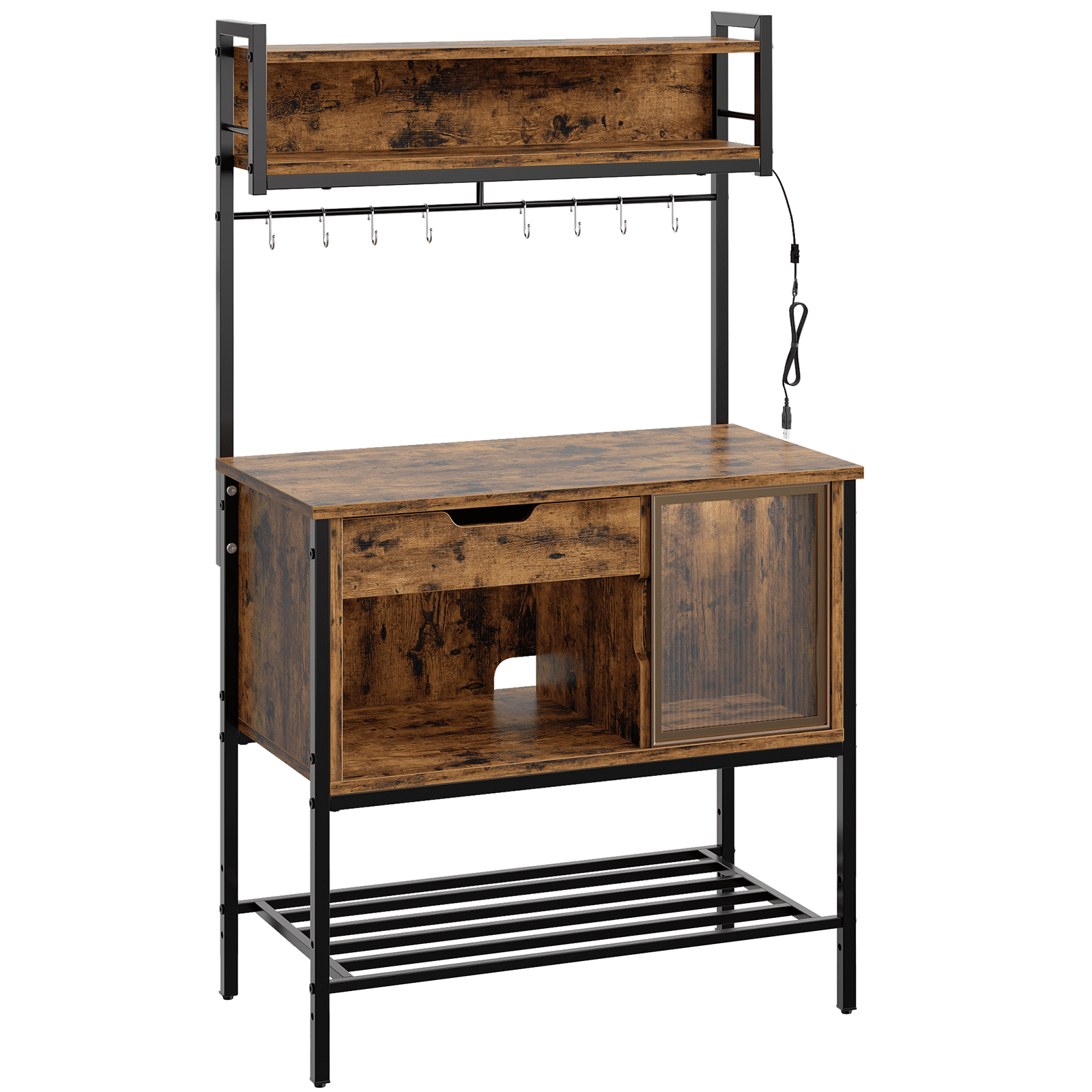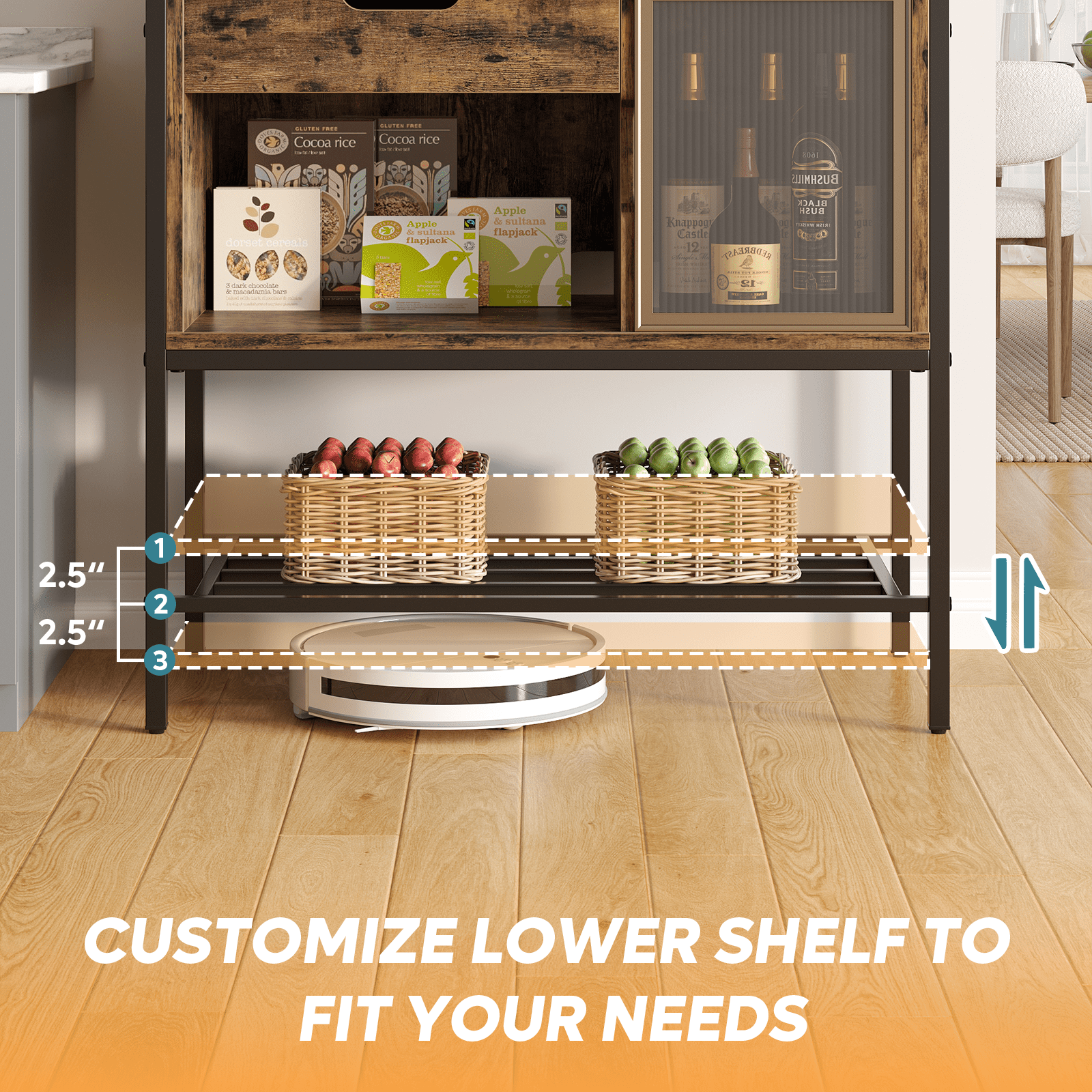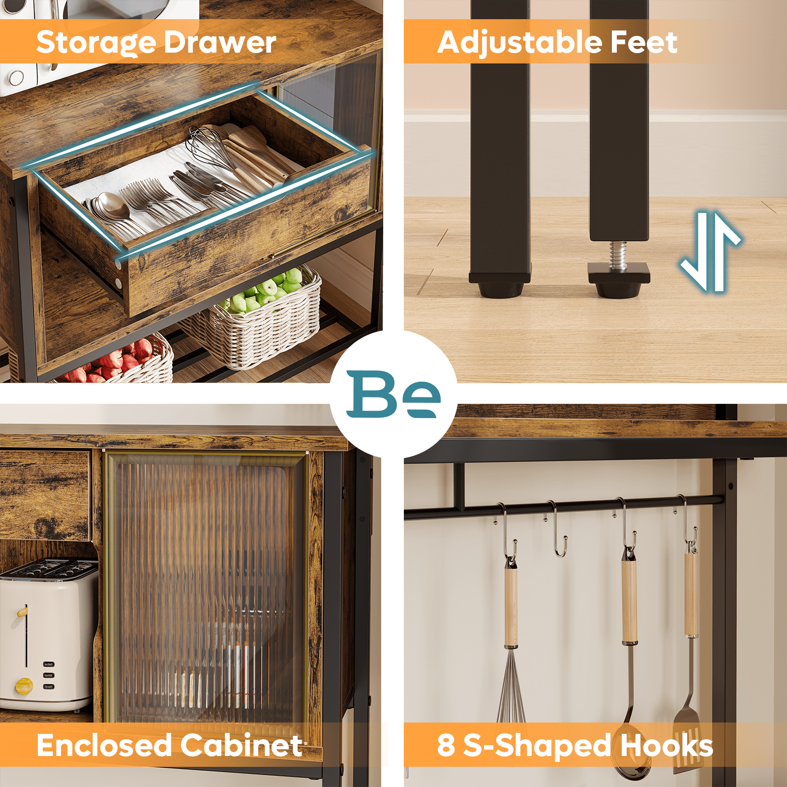 Features [Bakers Rack with LED Lights] – This coffee bar cabinet features built-in LED lighting. Choose from 7 primary colors and 22 display modes to create the perfect ambiance for your home bar area. Enhance the aesthetic of your coffee bar station corner with vibrant colors and mood-enhancing displays. [Ample Storage] – The 6-tier kitchen storage stand is designed with 1 open storage area, 1 drawer, and 1 cabinet, providing ample space for various kitchen appliances. Its bottom shelf comes with a 3-level adjustment feature, allowing for versatile storage possibilities. Additionally, it includes 8 S-shaped hooks, ideal for hanging cooking utensils such as spoons, pans, or whisks, further enhancing its functionality. [High-Quality] – This microwave stand, built with premium P2 particle board and a robust metal frame, ensures both stability and durability. Its four adjustable foot pads offer firm support on carpets or uneven floors, preventing any instability. Capable of holding up to 167 lbs, it serves as a sturdy and long-lasting storage solution for all your necessities. [Special Design] – The drawer is designed with slide rails, ensuring a smooth pull-out operation for an improved user experience. The cabinet is stylishly designed with translucent glass doors which can be adorned with light strips for ambiance. Furthermore, the space under the shelf can house a sweeping robot, promoting a cleaner and more organized living environment. [Easy to Assemble] – Assembling Bestier’s industrial kitchen racks is straightforward with our detailed instructions. Each package includes 1 x Baker’s Rack, 1 x LED Strip, 1 x Accessory Kit, and 1 x Assembly Instruction. We stand by the quality of our products and offer exceptional customer service. Don’t hesitate to reach out if you have any queries, we’re here to assist you. Specifications 8 x S-Hooks 4 x Adjustable Foot Pads 1 x Drawer 1 x Cabinet 1 x 3-Level Adjustment Shelf 1 x LED Strip 58.78″H x 33.86″ W x 16.38″D Max. Load Capacity: 167 lbs Estimated assembly time: 0.5-1 Hour (1-2 People) What’s in the box 1 x Baker’s Rack 1 x Accessory Kit 1 x Assembly Instruction