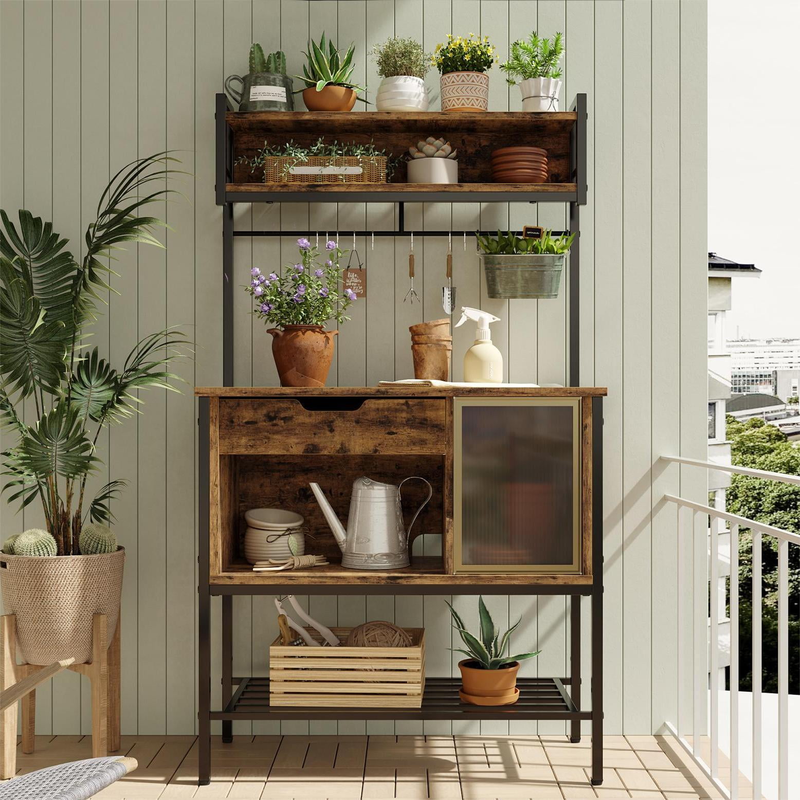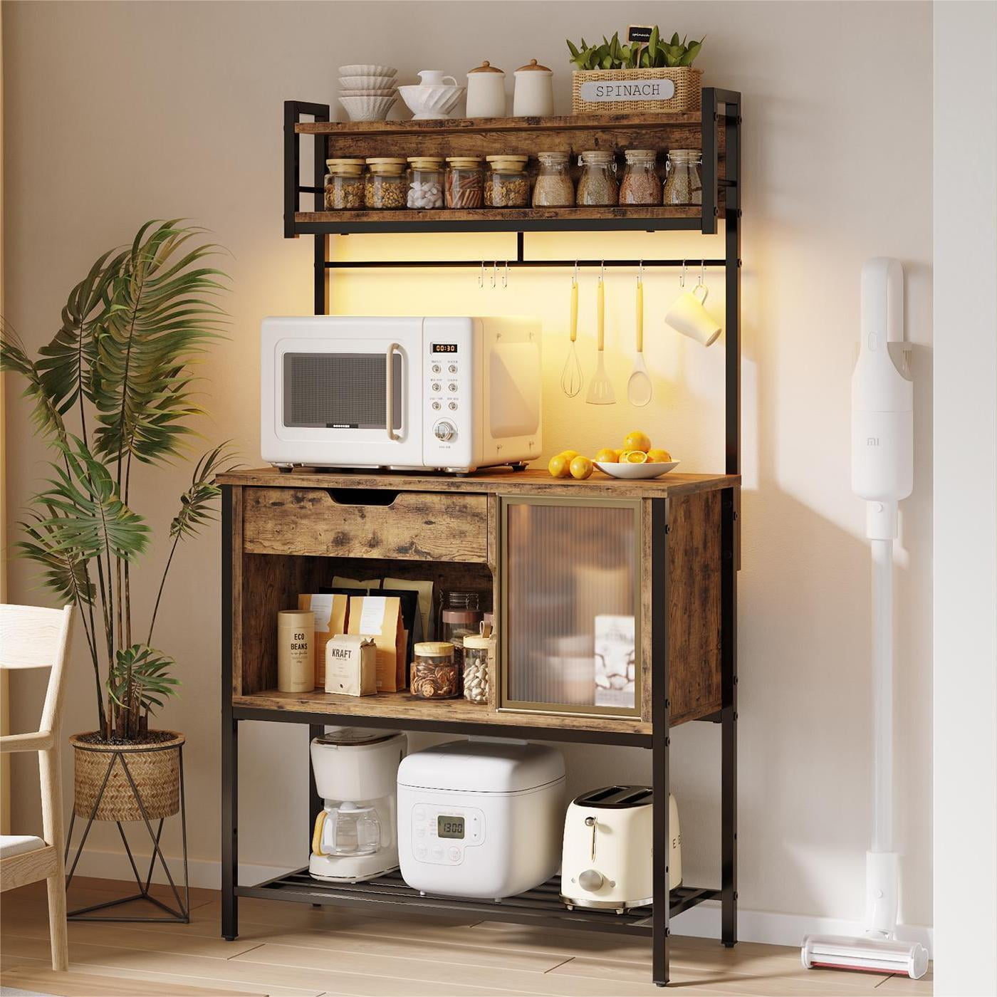 Besiter 60″ Kitchen Baker’s Rack with LED Light 6-Tier Microwave Stand with Storage Drawer Cabinet & 8 Hooks, Rustic