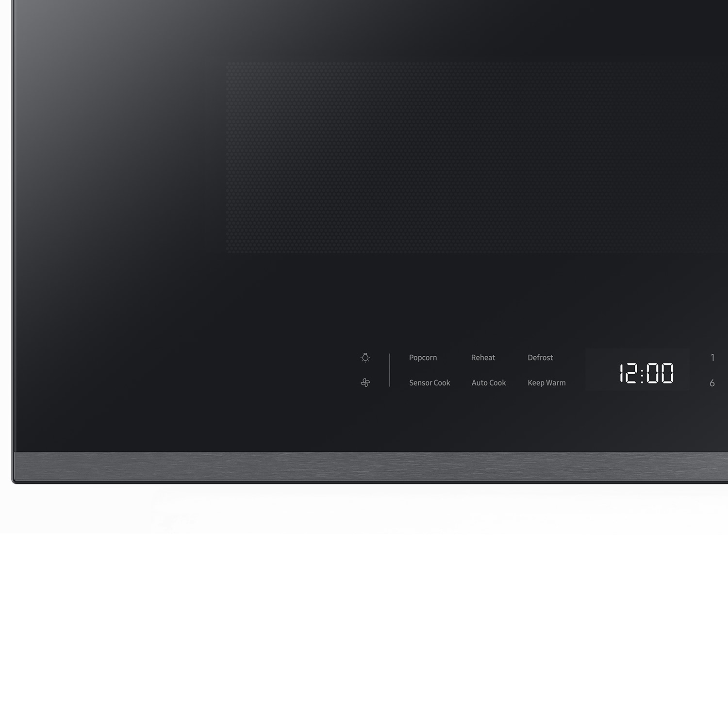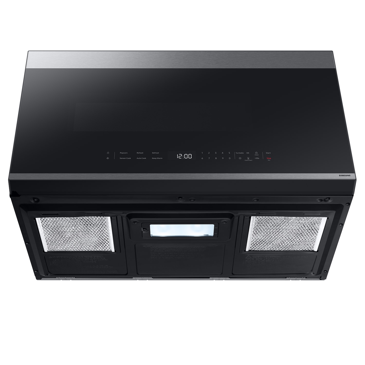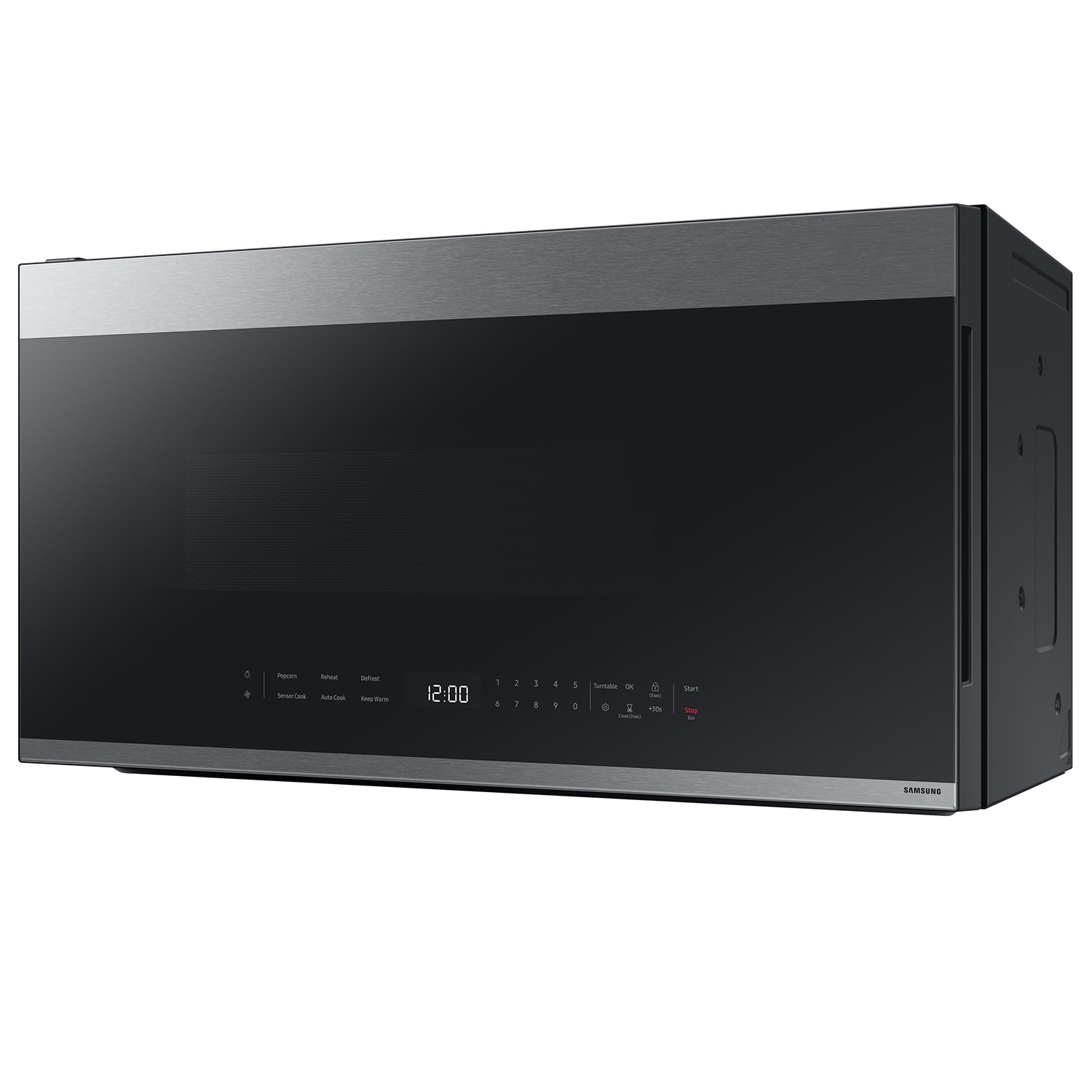 This Samsung Over-the-Range Microwave conveniently syncs with your Samsung range or cooktop so that ventilation and lighting will turn on automatically when you turn on the burners; Through the SmartThings app, you can remotely adjust ventilation speed and cooking time right from your smartphone and receive alerts when heating or cooking is finished; It also has an extra-large 2.1 cu-ft capacity that will accommodate even your largest dishes, and glass touch controls illuminate with a simple touch and dim when not in use for a clean, seamless look