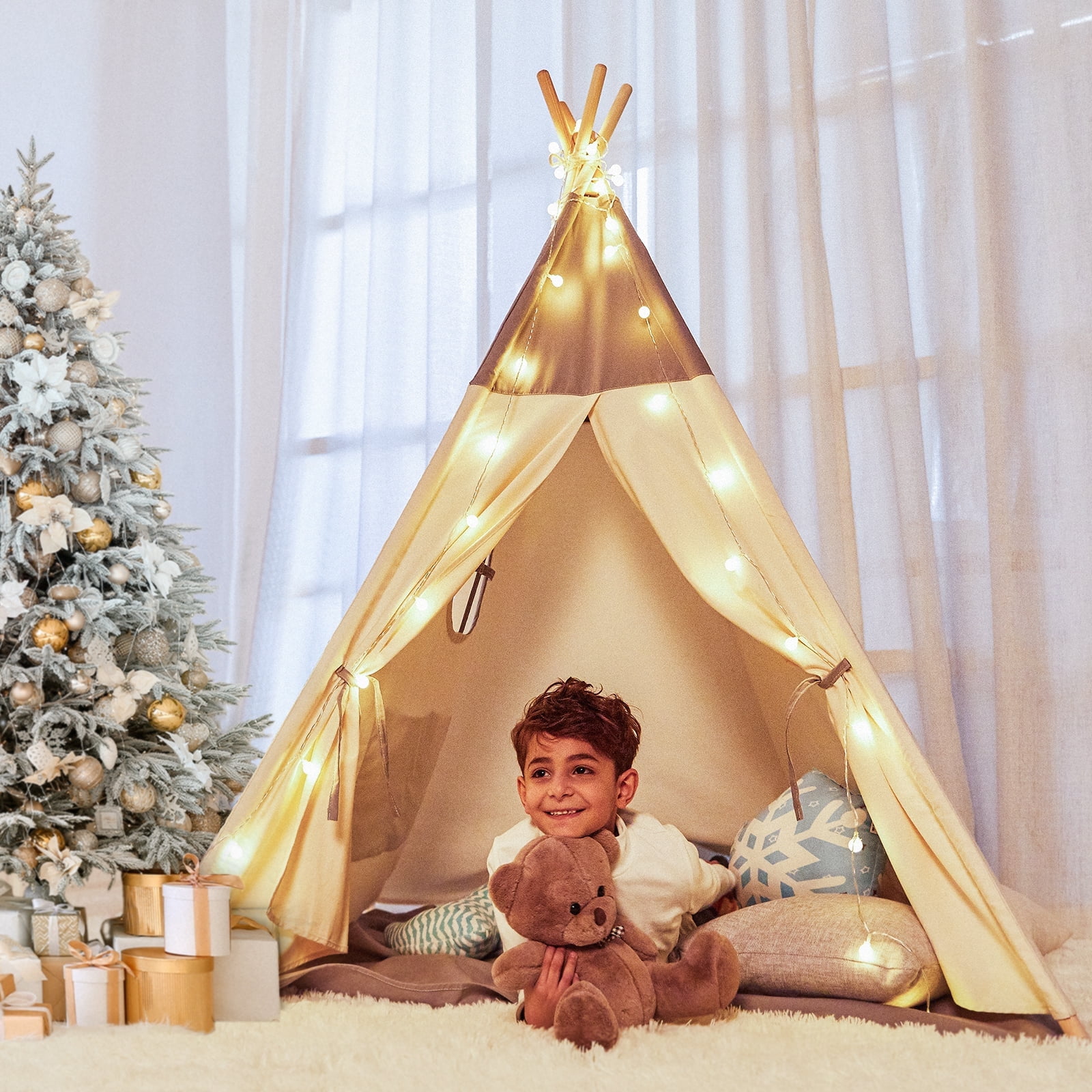 Besrey kid’s teepee tents are made of cotton canvas, free of harmful substances, skin-friendly and soft like cloud. The frame of this Indian teepee tent is made of solid natural pine poles, which are not easily deformed after long time use. And this cute play tent for child also comes with stabilizers and 4 pcs of non-slip sleeve, giving the teepee tent double stability, which can withstand any curious child’s play. The play tent also has ties on both sides, and when it tied, the teepee tent becomes a private little space for kids. Don’t worry about breathability, the tent has a cute little window, through which fresh air circulates. Easy to assemble and dissemble is also a significant feature. Besrey teepee tents for kids comes with all accessories, when kids want to play, just open the tent, tie the rope tightly, and you’re all set. Under your supervision and with your help, you and your kids can enjoy the precious family time together. Isn’t it great to have such a lovely leisure time? Besrey Indian play tent is the perfect gift for kids at Christmas or their birthday. Let your children’s imaginations run wildly inside this cozy teepee play tent. Children’s play tents provide them with a secret private space, allowing kids to use their imagination and design a kingdom of their own inside the tent.